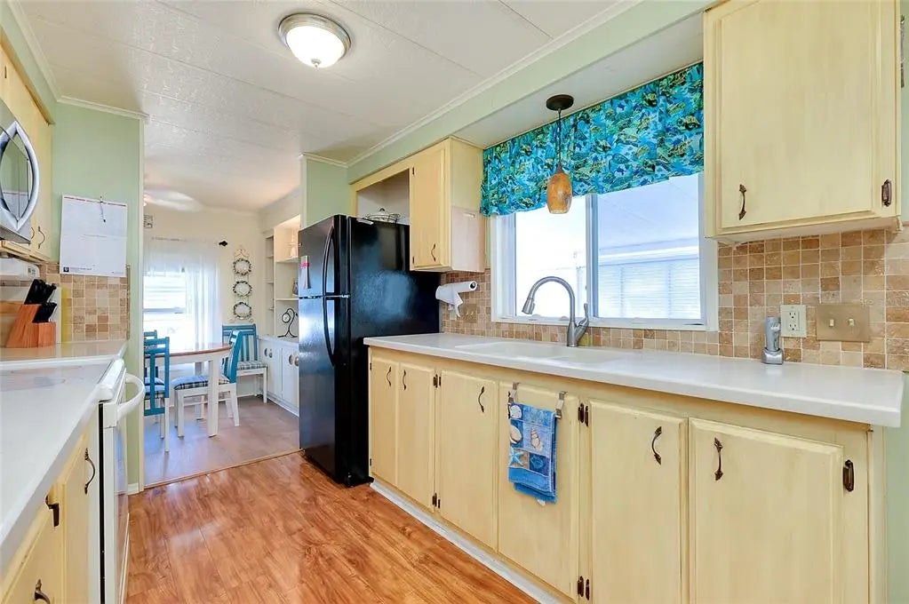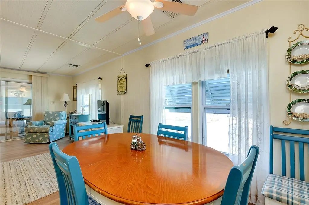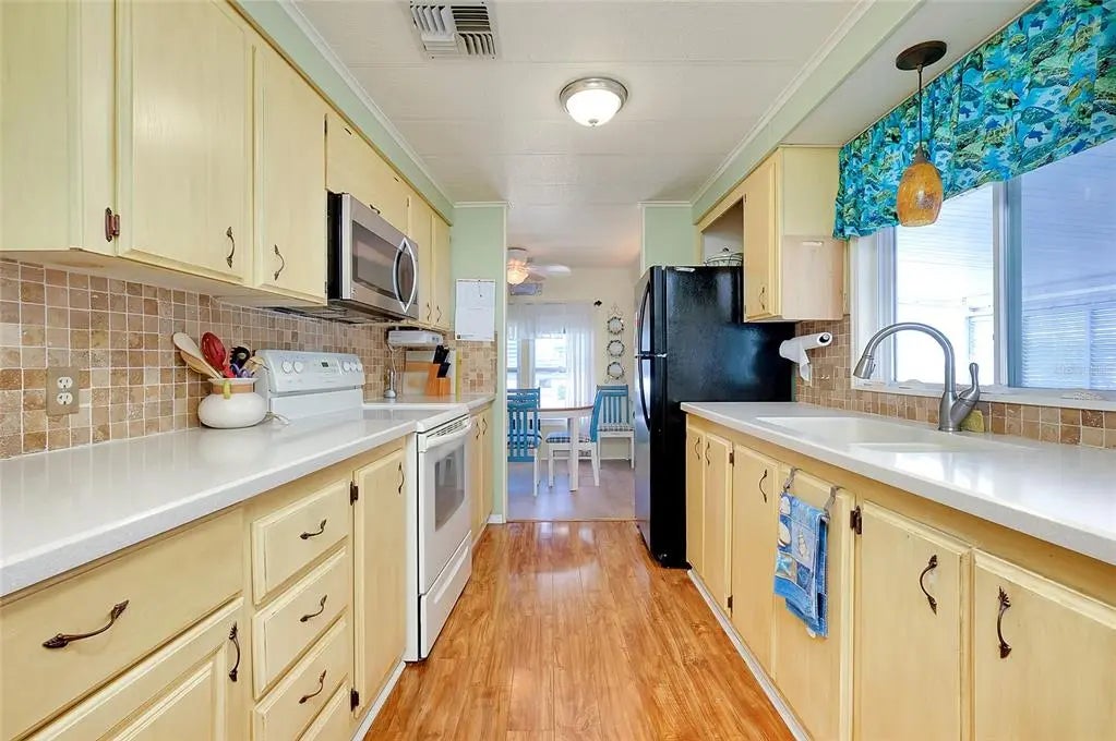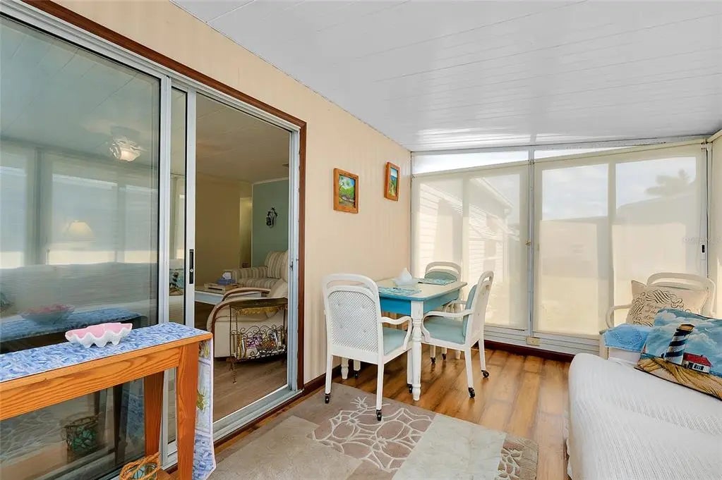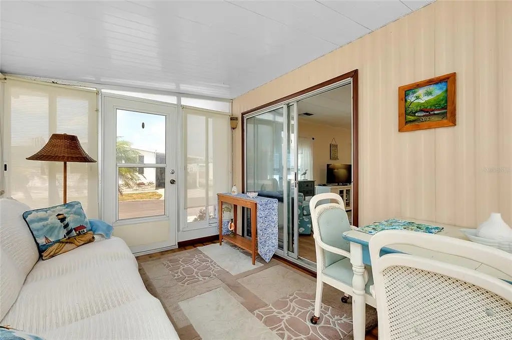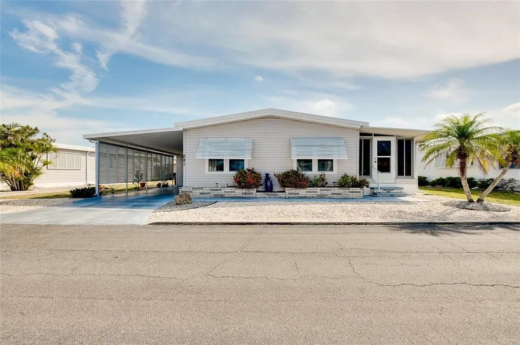 Move in ready beautifully maintained 2 bedroom, 2 bath mobile home where you own your own land. Home fully furnished with coastal theme. Enjoy your coffee in the spacious, bright and sunny Florida Room perfect for relaxing or entertaining year- round. Step inside to find new laminate flooring throughout, adding modern style and easy maintenance. The large primary bedroom includes an oversized walk-in closet, providing ample storage space. Outside you will love the large shed that includes a washer and dryer plus a workshop area ideal for hobbies, projects or extra storage. Located in a quiet, friendly community, this home is a perfect full-time residence 55+ or seasonal retreat. The park amenities are numerous and include 2 heated pools, 2 hot tubs, saunas, putt putt golf, a fitness center, tennis courts, bocce ball, corn hole, horseshoes, billiards, ping pong, game room, Tiki Hut, 2 Clubhouses, and FREE community bus transportation to local shops and outings. There are also numerous activities and social events for all community members to take part in. The low HOA fee includes Cable TV and Internet, Lawn Maintenance and all amenities. Located just minutes from downtown Venice and pristine beaches with easy access to shopping, dining, and entertainment options. Whether you are enjoying a sunset stroll on the beach or exploring the charm of downtown Venice, this location offers the best of Florida living.