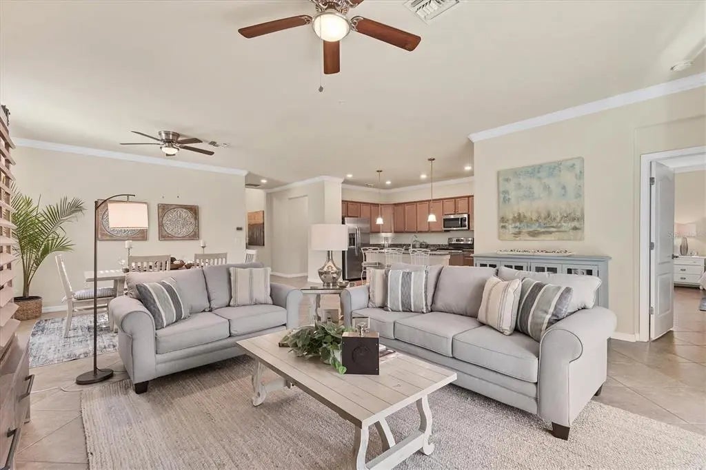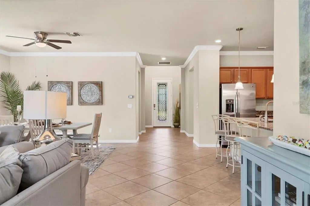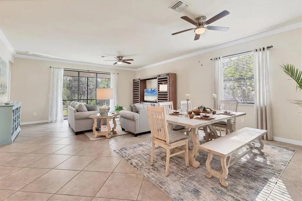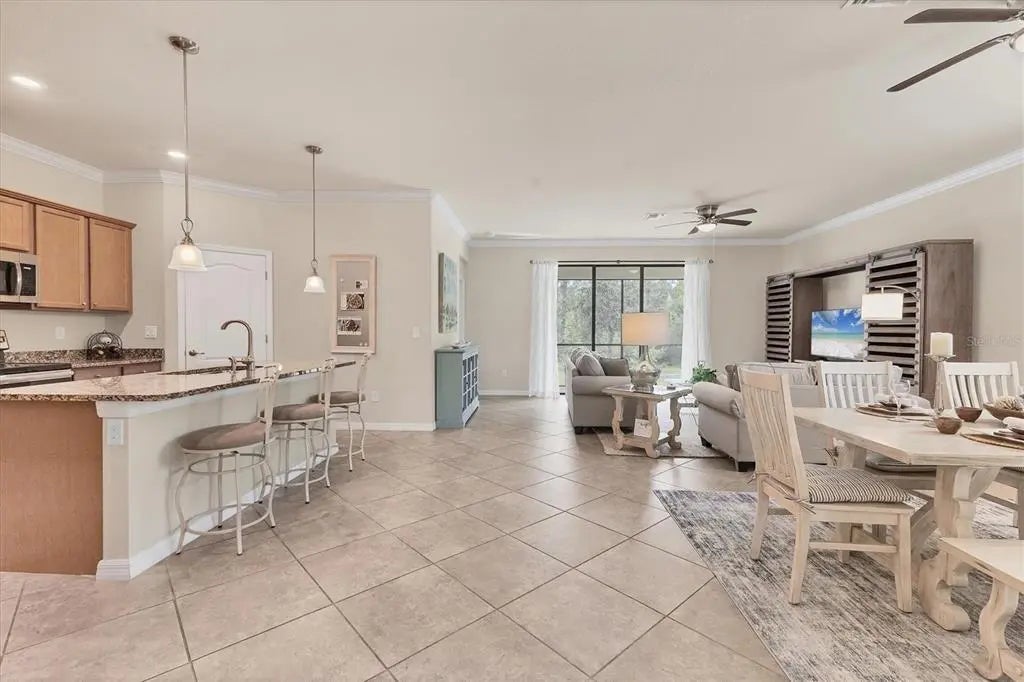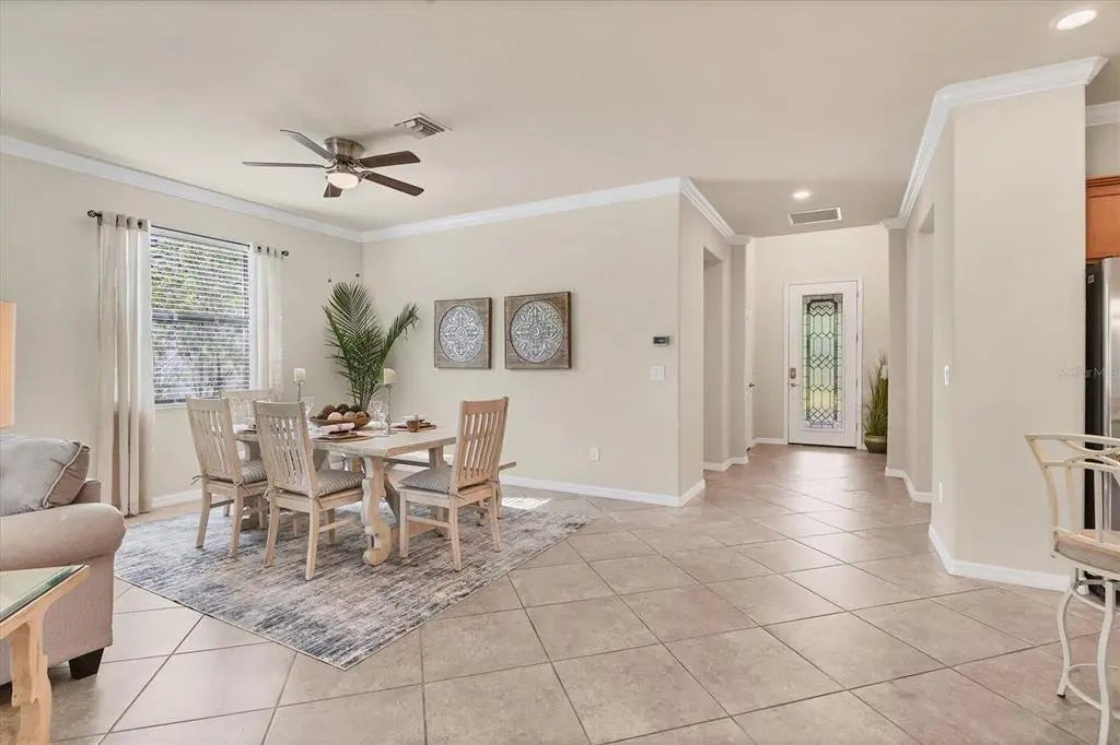 - Interior FeaturesCeiling Fan(s), Crown Molding, In Wall Pest System, Kitchen/Family Room Combo, Living Room/Dining Room Combo, Open Floorplan, Primary Bedroom Main Floor, Split Bedroom, Stone Counters, Thermostat, Walk-In Closet(s), Window Treatments