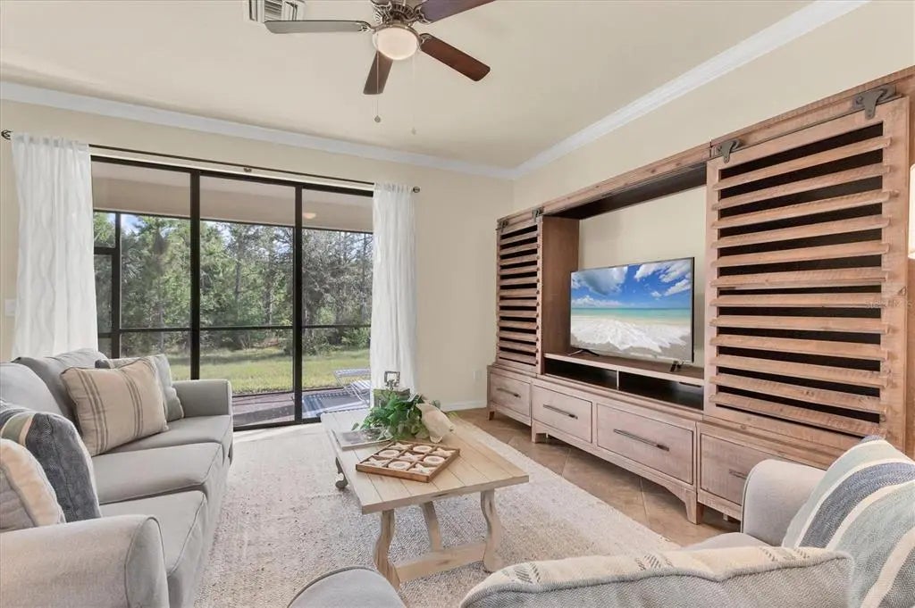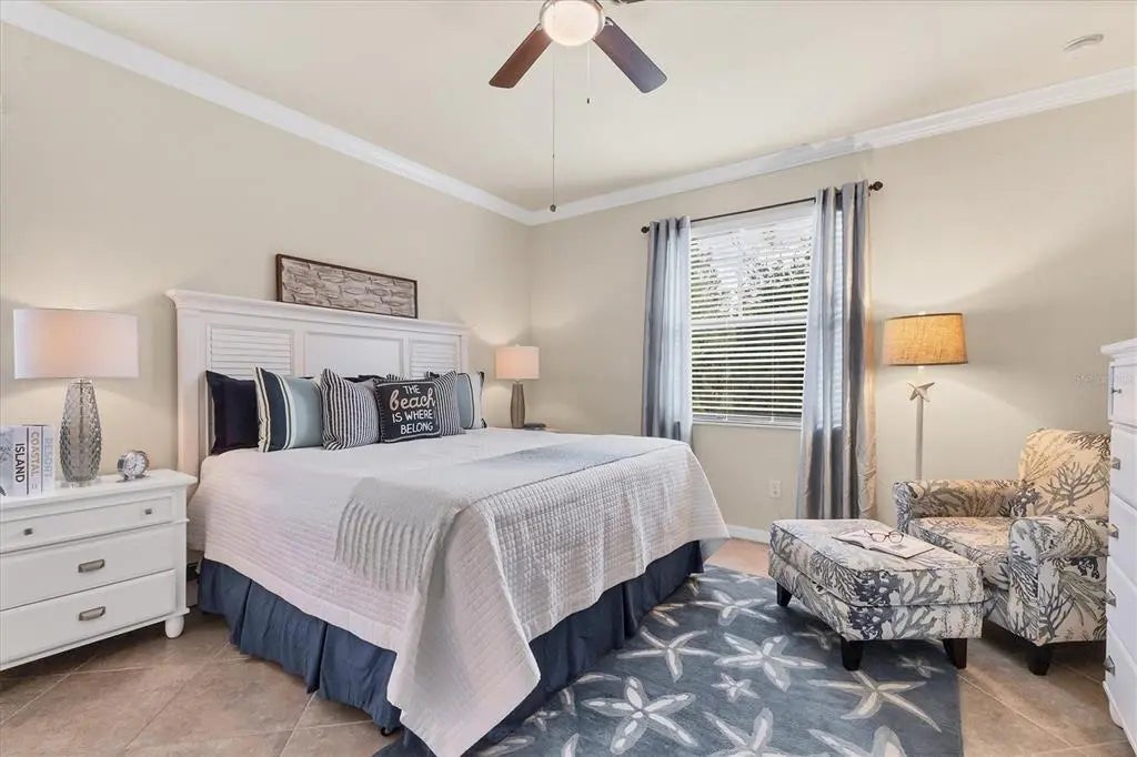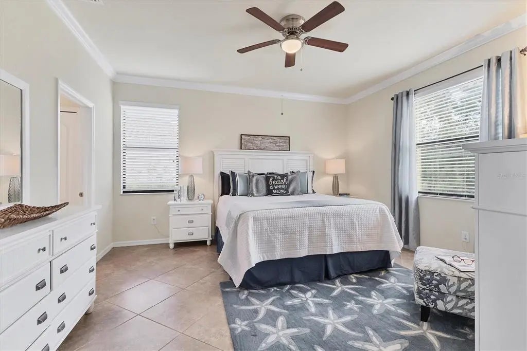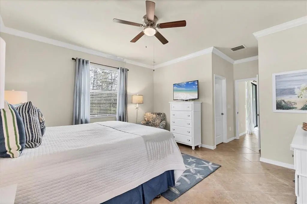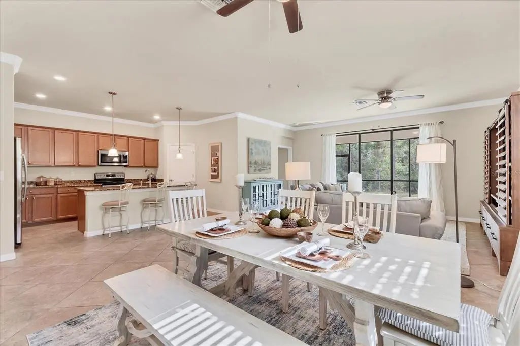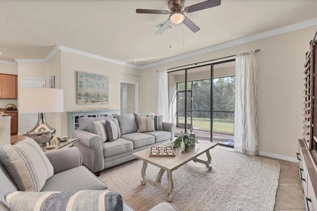 - Interior FeaturesCeiling Fan(s), Crown Molding, In Wall Pest System, Kitchen/Family Room Combo, Living Room/Dining Room Combo, Open Floorplan, Primary Bedroom Main Floor, Split Bedroom, Stone Counters, Thermostat, Walk-In Closet(s), Window Treatments