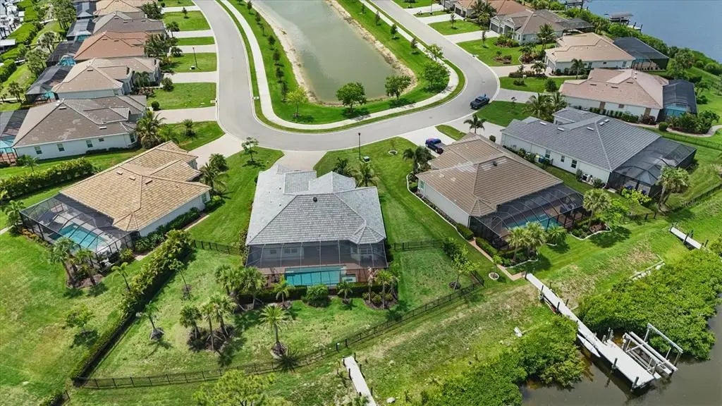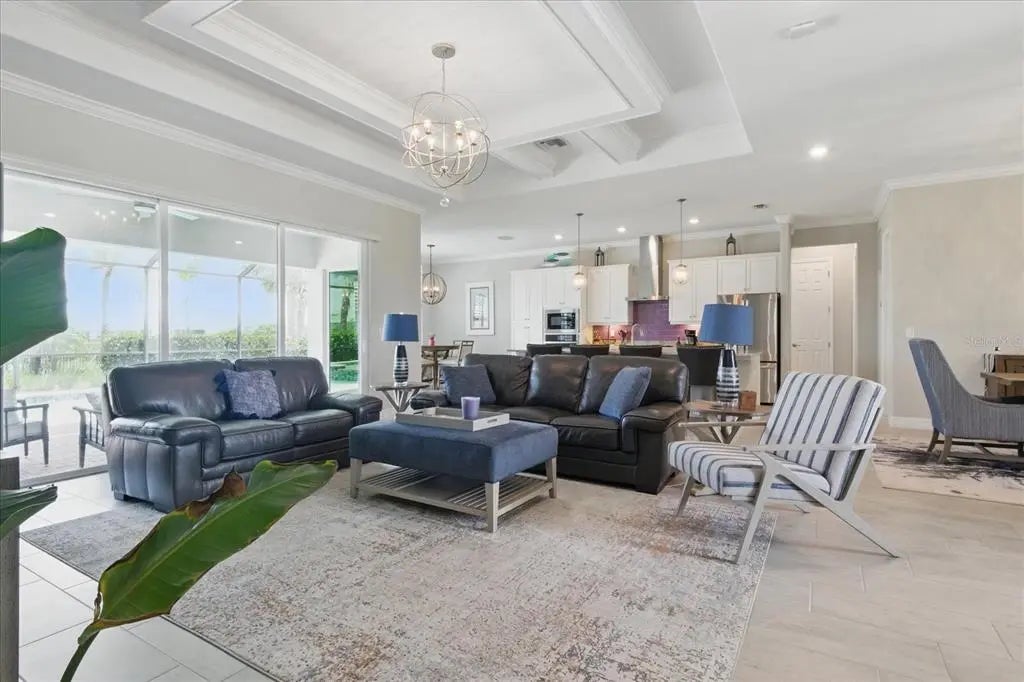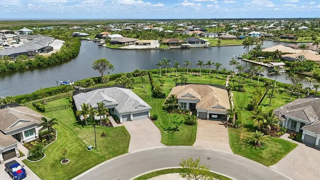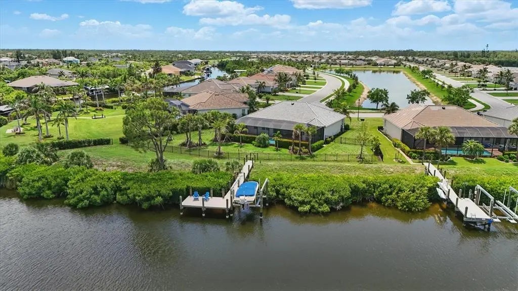 The spectacular Gulf-access waterfront saltwater heated pool and spa home situated on one of the largest tip lots in Harbor West. This oversized lot offers just over half an acre and features 165 feet of waterfront. This sailboat water property provides direct Gulf access with no bridges and is positioned on two intersecting, lake-like canals: Butterford and Aquarius Waterways. Enjoy colorful views from sunrise to sunset from the expansive 60’ x 35’ paver-bricked screened lanai. The open-concept layout offers over 3,200 square feet of indoor and outdoor living space. The split-bedroom floor plan includes 3 bedrooms plus a flexible 4th bedroom space currently used as a home office. The bright and airy great room features a coffered ceiling with crown molding and 8-foot sliding doors that open seamlessly to the kitchen, dining room, and breakfast area. The kitchen includes shaker-style cabinetry with abundant pull-out drawers, including a pantry with custom pull-out shelving, a 10-foot center island that seats 4–6, stainless steel appliances (wall oven, microwave, electric cooktop, French door refrigerator, and double stainless sink), tile backsplash, and under-cabinet lighting with dimmers. Throughout the home you’ll find granite countertops, wide plank tile flooring, oversized baseboards, crown molding, plantation shutters, 8-foot doors, designer light fixtures, ceiling fans, and a cohesive coastal color palette. The spacious owner's suite features coffered ceilings, French doors to the lanai, a large custom walk-in closet, and a spa-style bathroom with a tiled walk-in shower, dual sinks, vanity area, linen closet, and private water closet. Guest bedrooms also offers tile flooring, ceiling fans, and custom closet shelving. There is a full hall bath and a convenient pool half bath accessible from bedroom 3. The laundry room is equipped with washer and dryer, utility sink, and upper cabinets. The oversized 3-car garage includes epoxy flooring, overhead storage racks, steel cabinetry, exterior keypad, pull-down attic access, and 15x15 floored attic space. The property showcases meticulous care and attention to detail at every turn. Resort-inspired landscaping and lighting accent the tropical gardens, coconut palms, and spacious backyard. The 20x60 Hardy Plank boat dock includes a 32-foot slip, 13,000 lb boat lift, fish cleaning station, dock boxes, water, fish lights, motion-sensor lighting, and night lighting. Additional upgrades include a fenced yard with wide-access gates, dimmers throughout, upgraded Sherwin-Williams paint, MyQ garage openers, and a new roof and lanai cage (2023). Furnished for the convenience of the buyer. Harbor West is a gated community with low HOA fees covering irrigation, lawn care, tree and shrub maintenance, and all common areas. Conveniently located within a short drive to Englewood Beach, Boca Grande, waterfront dining, shopping, and airports. Private guided boat tours available upon request to truly experience the Florida Gulf Coast lifestyle.