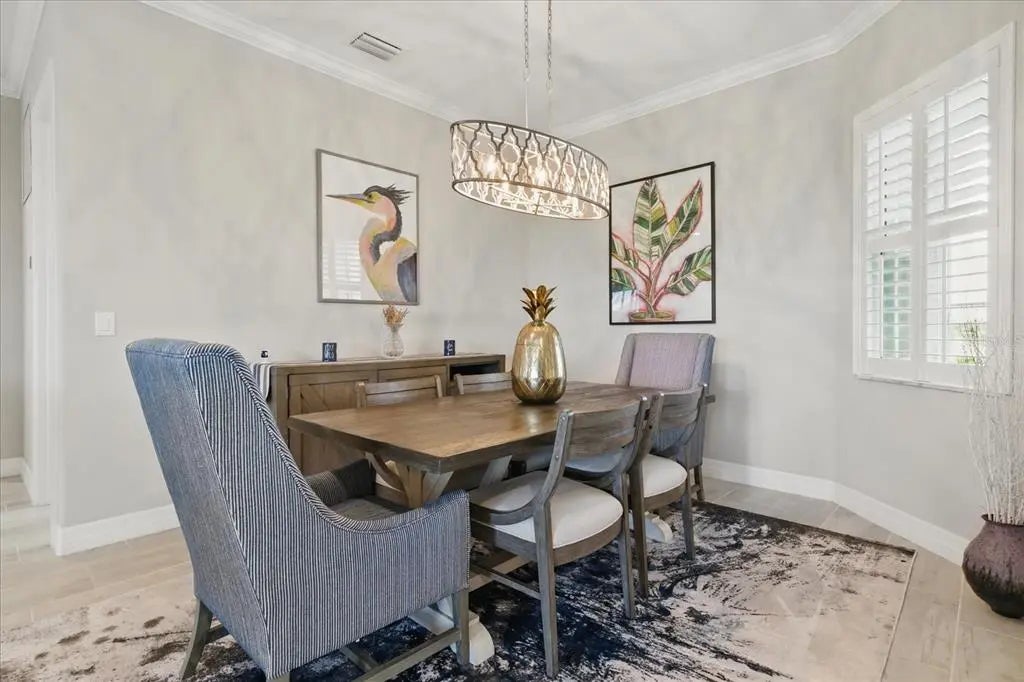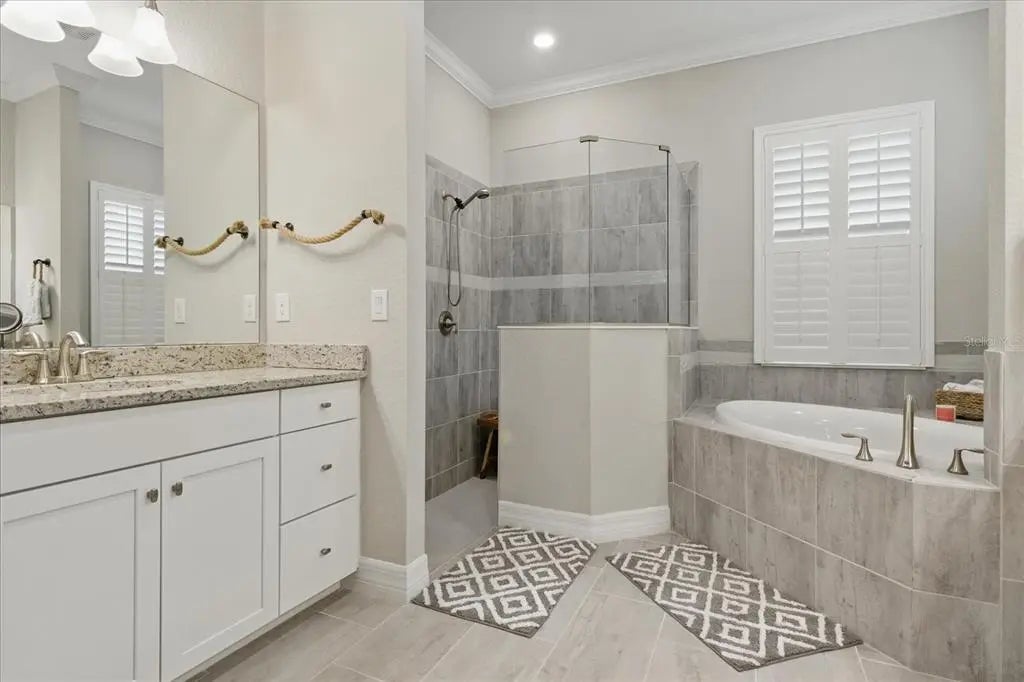 - Interior FeaturesCeiling Fan(s), Coffered Ceiling(s), Crown Molding, Eating Space In Kitchen, High Ceilings, Living Room/Dining Room Combo, Open Floorplan, Primary Bedroom Main Floor, Solid Surface Counters, Solid Wood Cabinets, Split Bedroom, Stone Counters, Thermostat, Walk-In Closet(s), Window Treatments