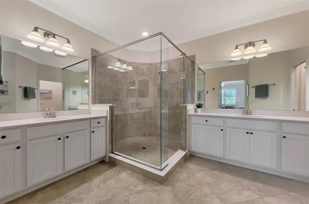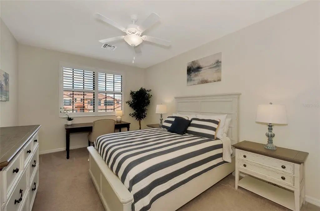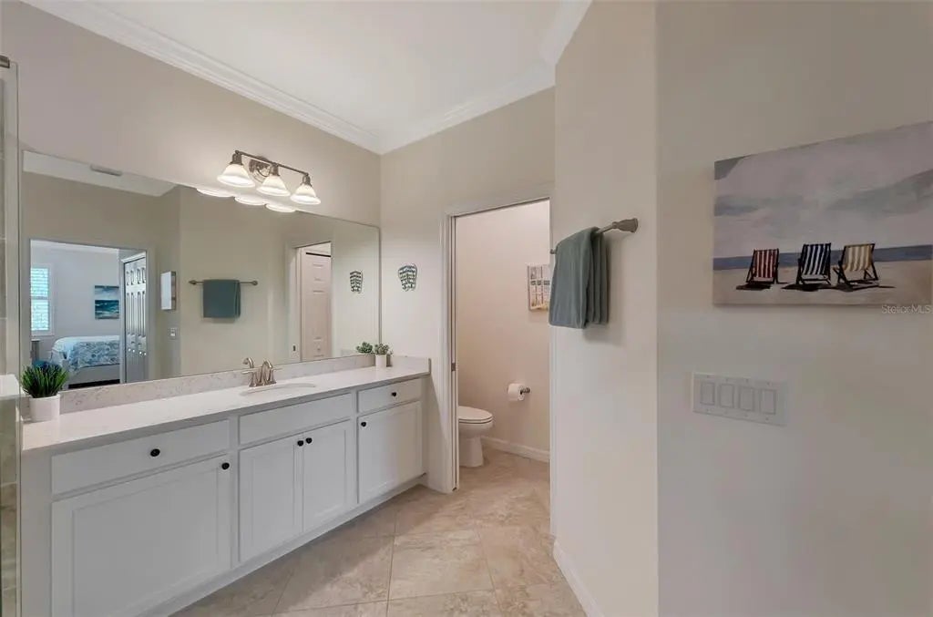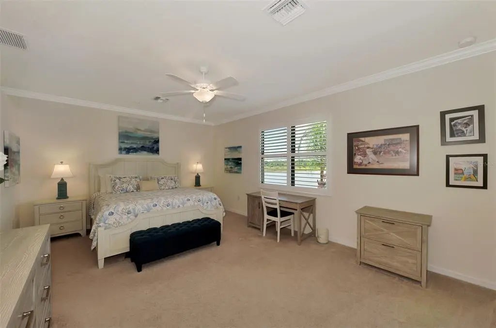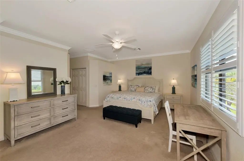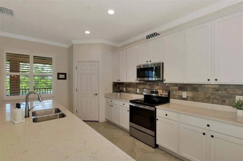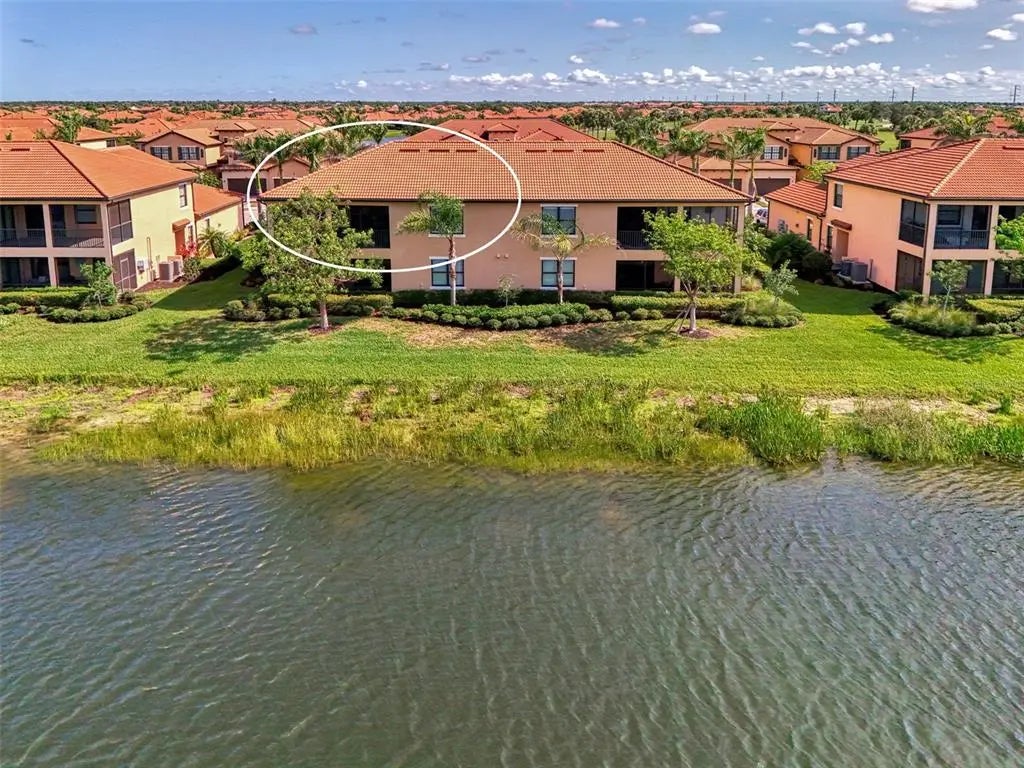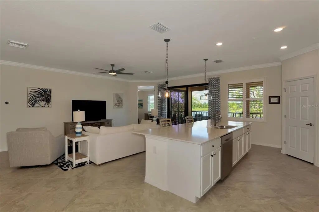 SELLER OFFERING $2500 TOWARDS ONE-TIME CAPITAL CONTRIBUTION! Live in this beautiful TOP FLOOR END UNIT condo, located in the highly sought after guard gated community of Sarasota National. Enjoy SOUTH FACING water, preserve, and golf course views stretching in all directions that will bring you hours of peace and enjoyment right from the comfort of your oversized screened lanai with custom sun shade. Boasting a grand 2-story foyer entrance, this condo is flooded with light and has an open concept floor plan featuring 3 bedrooms and 2 bathrooms, as well as a 2 car garage with a 3rd tandem. From the moment you walk through the decorative lead glass front door, you will notice upgrades such as tile on the diagonal and decorative crown moldings that run throughout all of the main living areas, as well as custom plantation shutters and custom drapery in the living room. The kitchen is a chef's dream that features white shaker style cabinets, beautiful quartz countertops, and an upgraded stainless steel appliance package with new Bosch dishwasher, LG refrigerator, and upgraded Delta faucet. Enjoy stunning views while you prepare a fantastic meal that is easily served buffet style on the oversized island. The pantry has custom built-ins by Closet-Tec and the oversized dining area showcases a beautiful chandelier. The entire space is filled with light thanks to large windows throughout and oversized sliders that all feature the highest rated HURRICANE IMPACT GLASS! The primary suite is huge on space with room to create a home office or extra sitting area. Large sliders lead out to the lanai, and a huge window will allow you to enjoy the stunning views from every angle. 2 walk-in closets give you ample space and you will enjoy more custom built-ins by Closet-Tec. The en suite bathroom showcases dual vanities with tons of storage, an oversized walk-in shower with seamless glass enclosure, and a separate water closet. Across the condo you will find 2 additional bedrooms that are generous in size, and a large full bathroom that features a tub/shower combo. With a pocket door at the end of the hall, it is easy to create privacy for guests from the main living areas of the home. There is an in-unit laundry room with upgraded stackable washer and dryer, freeing up space for extra storage. This building is completely maintenance free and includes all landscaping maintenance, pest control, cable tv, water, sewer, and trash pick up. Your monthly HOA fee also includes 2 GOLF MEMBERSHIPS that require no extra buy-in fee! This condo is perfect to use as a full time residence, a part-time seasonal home, or even a great investment... one that will generate substantial rental income! Live like you are on a 5-star vacation with a 30,000sf clubhouse with resort style pool, hot tub, outdoor tiki bar serving food and drinks daily, a coffee house, fine dining restaurant, 7,000sf fitness center with top-of-the-line equipment and classes, day spa, card room, bocce ball, pickle ball, tennis, dog park, playground, event lawn, and 18-hole championship golf course. Sarasota National is a guard gated 2400-acre International Audubon Bird Sanctuary that offers some of the most beautiful water and preserve views in all of Venice. This home is just minutes to the new Atlanta Brave's spring training camp at the CoolToday Park Stadium, as well as the town center of Wellen Park. Explore 3 local beaches and historic downtown Venice, all less than 15 minutes from your front door!