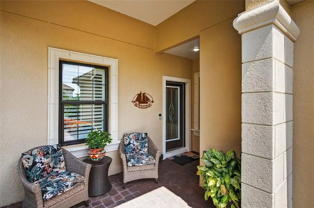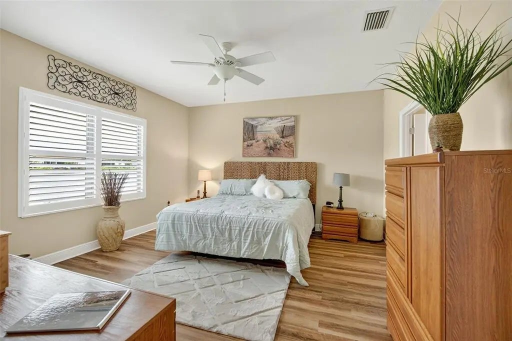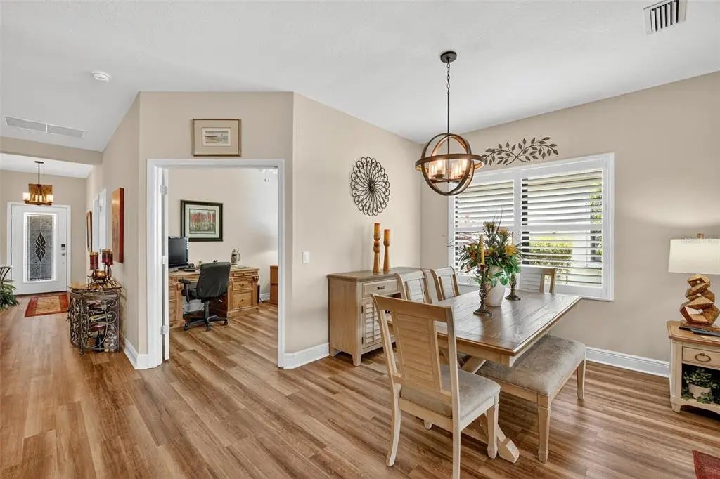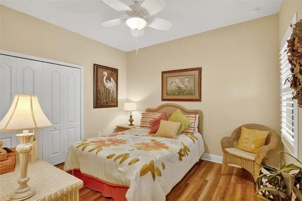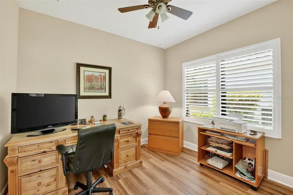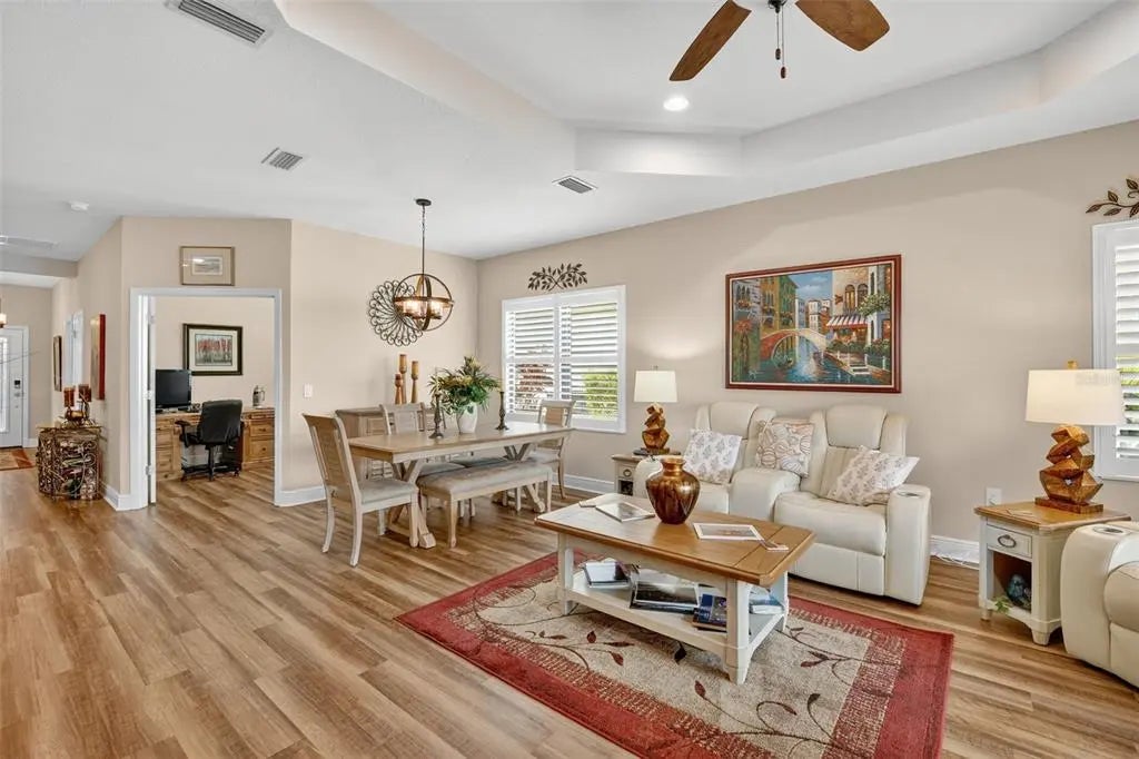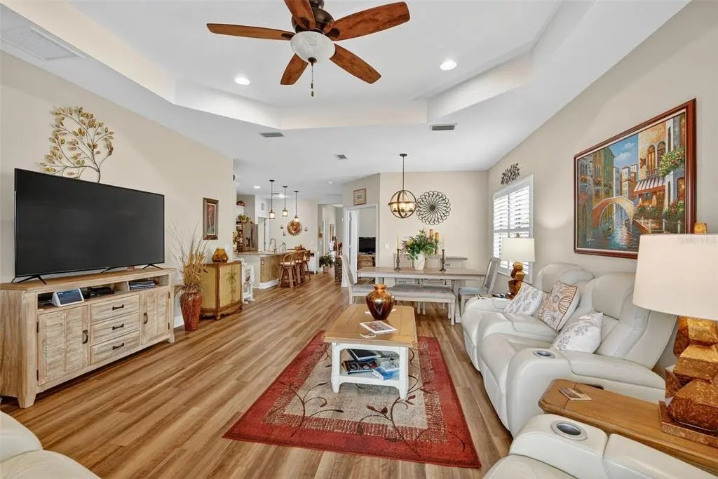 A significant price reduction on this great Villa in the Gated Grand Palm Community, where resort-style living meets nature in a family-friendly setting. This villa has a strikingly beautiful Pond View! This beautifully upgraded Villa offers 3 bedrooms, 2 bathrooms, a den, and a 2-car garage, with a spacious laundry room featuring extra storage. Inside, enjoy an open-concept floor plan with custom upgrades throughout: plantation shutters, tray ceiling, luxury vinyl plank flooring, and fluted wood paneling in the dining area and kitchen island. The kitchen boasts solid wood cabinetry, pull-out drawers, walk-in pantry, a large island with pendant lighting, and stainless-steel appliances. The great room opens to an extended lanai with serene pond views, a transparent screen enclosure, built-in gas grill hookup, remote-controlled shade screen, and dimmer lighting, creating an ideal indoor-outdoor living experience. The split bedroom layout offers privacy for guests. The primary suite features a walk-in closet, dual vanities, and a large walk-in shower. Additional upgrades include impact-rated hurricane windows, a Epoxy garage floor, a motorized storm safe screen in the lanai-porch area to protect the rear of the home. As part of Okaloosa Villas, residents enjoy access to a private pool, spa, bathhouse, and a covered gathering area with gas grill. Grand Palm Community amenities include: Resort-style pool with beach-entry & spa Pickleball, tennis, volleyball & basketball courts Fitness center with lap pool & water slide Playground, dog park, splash park, kayak launch, picnic areas Nature trails, social clubhouse, and full-time activities director Located minutes from Venice beaches, Manasota Key, Wellen Park, CoolToday Park (Atlanta Braves spring training), and downtown Venice dining and shopping.
