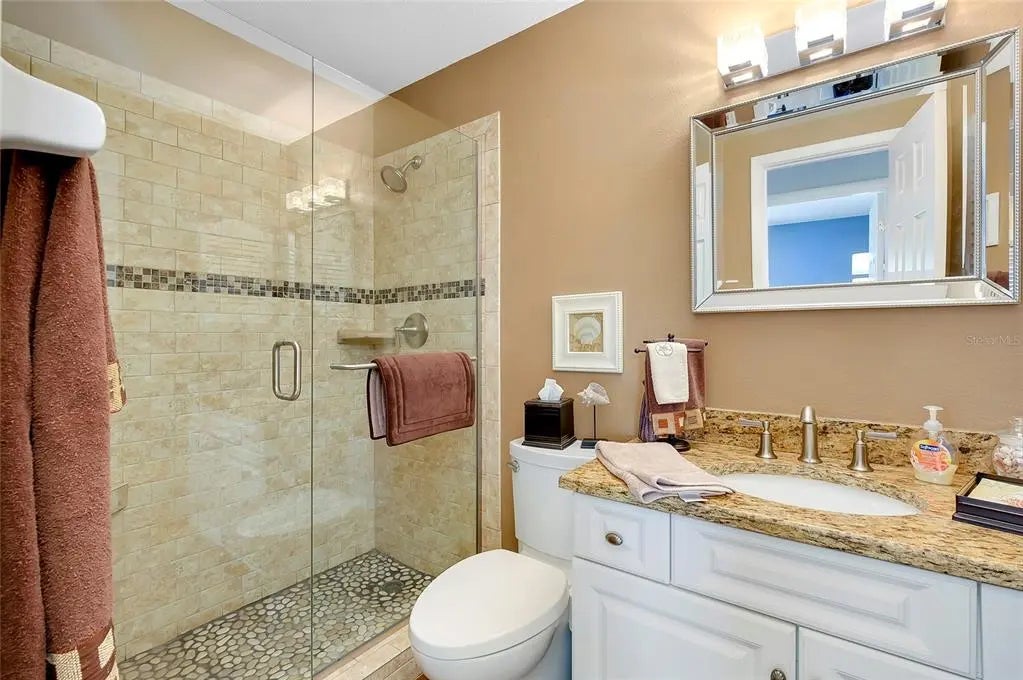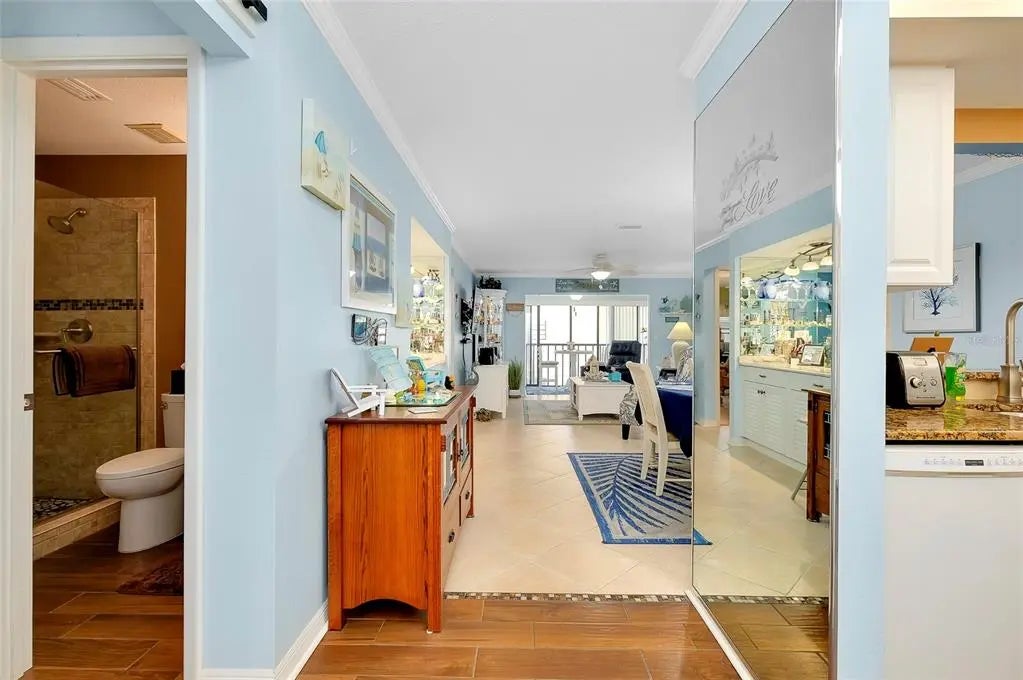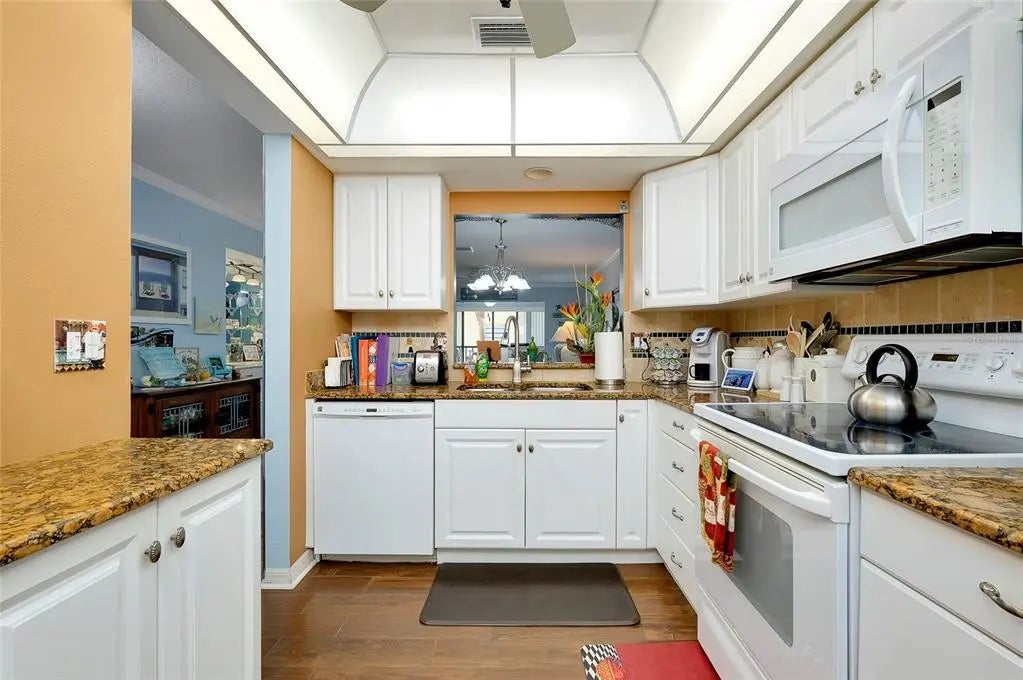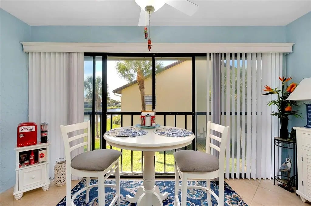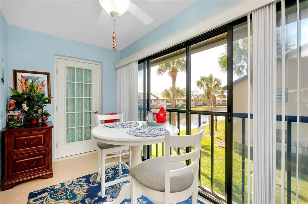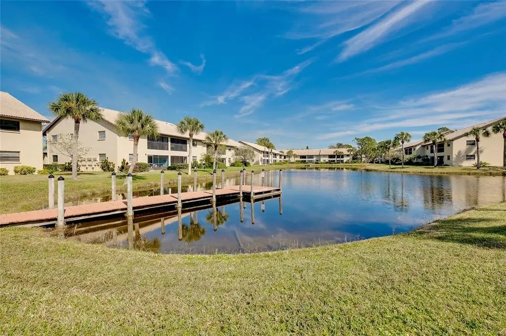 RARELY AVAILABLE UNIT WITH ENCLOSED LANAI FOR ADDED AIR-CONDITIONED SPACE! This charming 2-bedroom, 2-bathroom 1,155 sq. ft. condo is nestled in the desirable Mission Lakes community, offering a peaceful and relaxed lifestyle just minutes from the beach and Venice Island. As you enter, you will be greeted by an OPEN AND AIRY living space that extends all the way through the home and out on to your light and bright ENCLOSED LANAI, which is perfect for entertaining or unwinding after a day in the sun. The kitchen features NEWER CABINETS, GRANITE countertops and ample counter space, making meal preparation a breeze. The spacious master bedroom boasts a WALK-IN closet and en-suite bathroom, providing a comfortable oasis to relax and rejuvenate and a door to the enclosed lanai. A unique feature of this condo is there is a handy DROP-DOWN LADDER in the primary closet that allows ACCESS TO THE ATTIC and ample storage space. A stylish BARN DOOR has been added to the hallway to the second bedroom and bathroom, creating a GUEST SUITE FEEL that your family and friends will be sure to enjoy while visiting. The second bedroom is perfect for guests or can be used as a home office or den. The lanai was opened up to add square footage and is the perfect place to enjoy your morning coffee or evening cocktail while taking in the serene LAKE VIEWS. Few units in this community have this feature. The community amenities include THREE HEATED POOLS for your enjoyment. And your car will always have a shady place to be parked, featuring an open-air carport with a convenient attached STORAGE ROOM. The current owners have made over $28,000 in UPGRADES since taking ownership. including REPLACE all the old DOORS, replaced the WASHER AND DRYER, added a DRY BAR with QUARTZ COUNTERTOPS in the living space, NEW HVAC and THERMOSTAT in 2019, PRIMARY BATHROOM REMODEL, GLASS SHOWER DOORS in the guest bathroom and many other great improvements. With its prime location just a short drive from Venice Beach, historic downtown Venice, the YMCA, and a variety of shopping and dining options, this condo is the perfect place to call home. Don't miss out on this opportunity to live the Florida lifestyle you've always dreamed of!