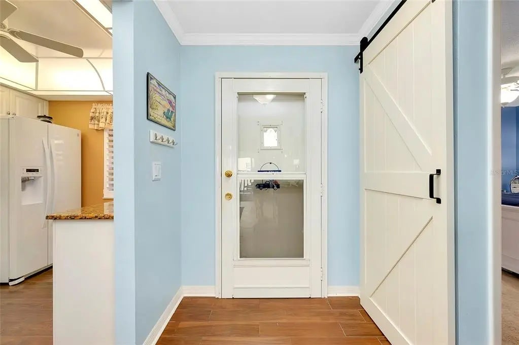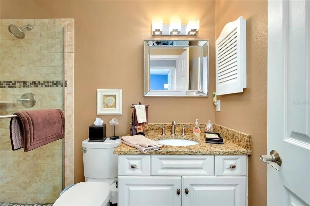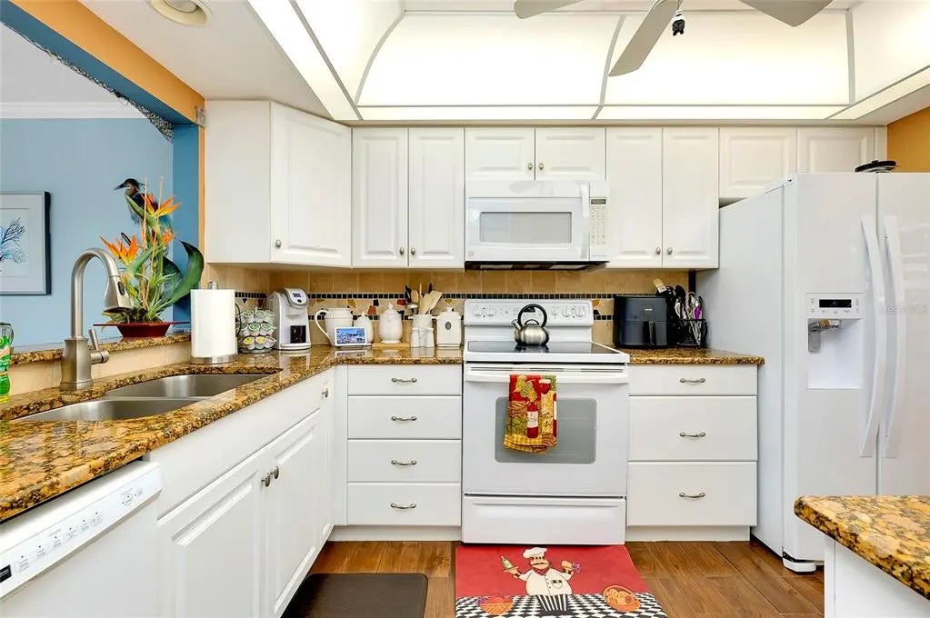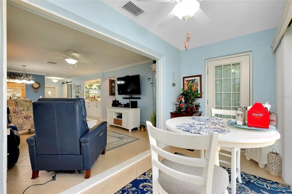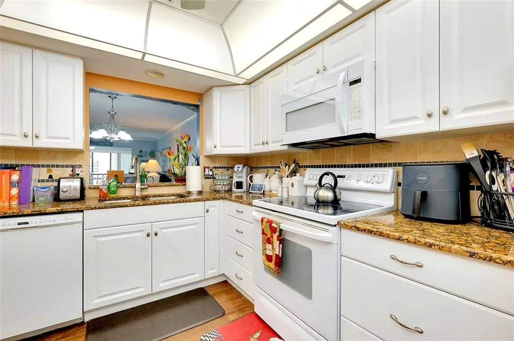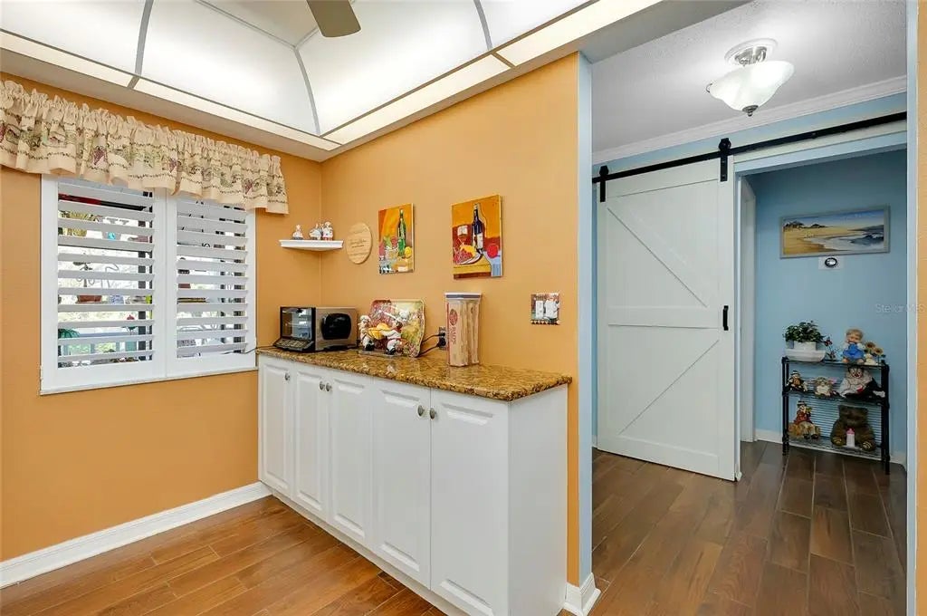 RARELY AVAILABLE UNIT WITH ENCLOSED LANAI FOR ADDED AIR-CONDITIONED SPACE! This charming 2-bedroom, 2-bathroom 1,155 sq. ft. condo is nestled in the desirable Mission Lakes community, offering a peaceful and relaxed lifestyle just minutes from the beach and Venice Island. As you enter, you will be greeted by an OPEN AND AIRY living space that extends all the way through the home and out on to your light and bright ENCLOSED LANAI, which is perfect for entertaining or unwinding after a day in the sun. The kitchen features NEWER CABINETS, GRANITE countertops and ample counter space, making meal preparation a breeze. The spacious master bedroom boasts a WALK-IN closet and en-suite bathroom, providing a comfortable oasis to relax and rejuvenate and a door to the enclosed lanai. A unique feature of this condo is there is a handy DROP-DOWN LADDER in the primary closet that allows ACCESS TO THE ATTIC and ample storage space. A stylish BARN DOOR has been added to the hallway to the second bedroom and bathroom, creating a GUEST SUITE FEEL that your family and friends will be sure to enjoy while visiting. The second bedroom is perfect for guests or can be used as a home office or den. The lanai was opened up to add square footage and is the perfect place to enjoy your morning coffee or evening cocktail while taking in the serene LAKE VIEWS. Few units in this community have this feature. The community amenities include THREE HEATED POOLS for your enjoyment. And your car will always have a shady place to be parked, featuring an open-air carport with a convenient attached STORAGE ROOM. The current owners have made over $28,000 in UPGRADES since taking ownership. including REPLACE all the old DOORS, replaced the WASHER AND DRYER, added a DRY BAR with QUARTZ COUNTERTOPS in the living space, NEW HVAC and THERMOSTAT in 2019, PRIMARY BATHROOM REMODEL, GLASS SHOWER DOORS in the guest bathroom and many other great improvements. With its prime location just a short drive from Venice Beach, historic downtown Venice, the YMCA, and a variety of shopping and dining options, this condo is the perfect place to call home. Don't miss out on this opportunity to live the Florida lifestyle you've always dreamed of!