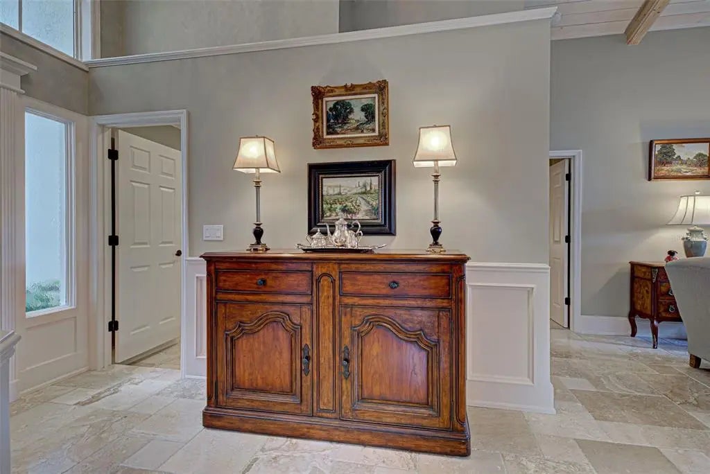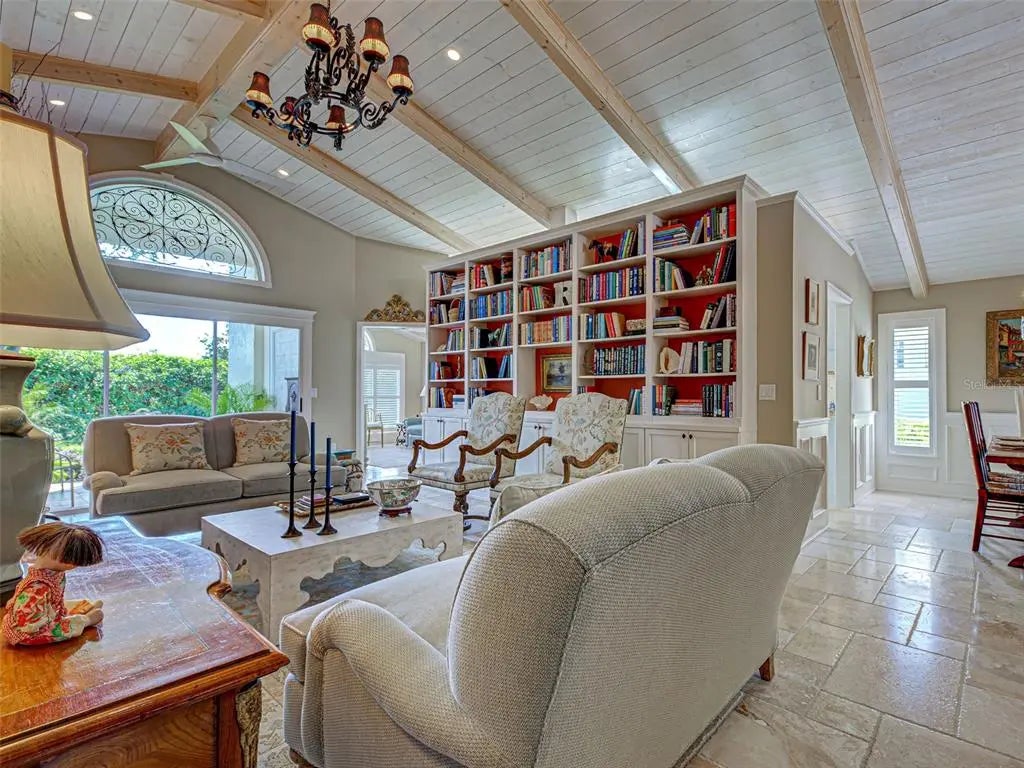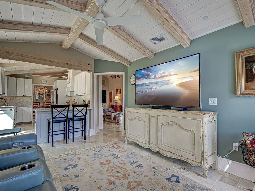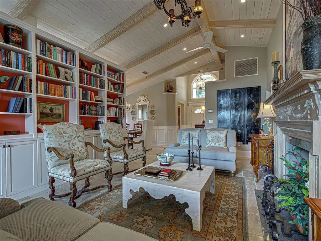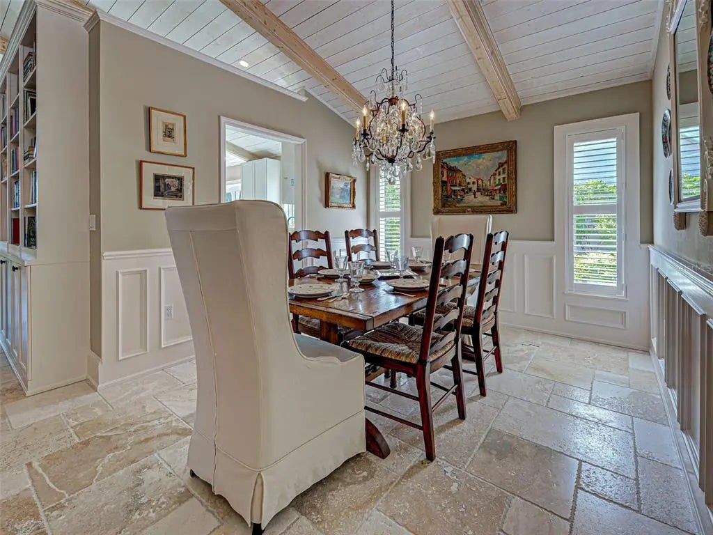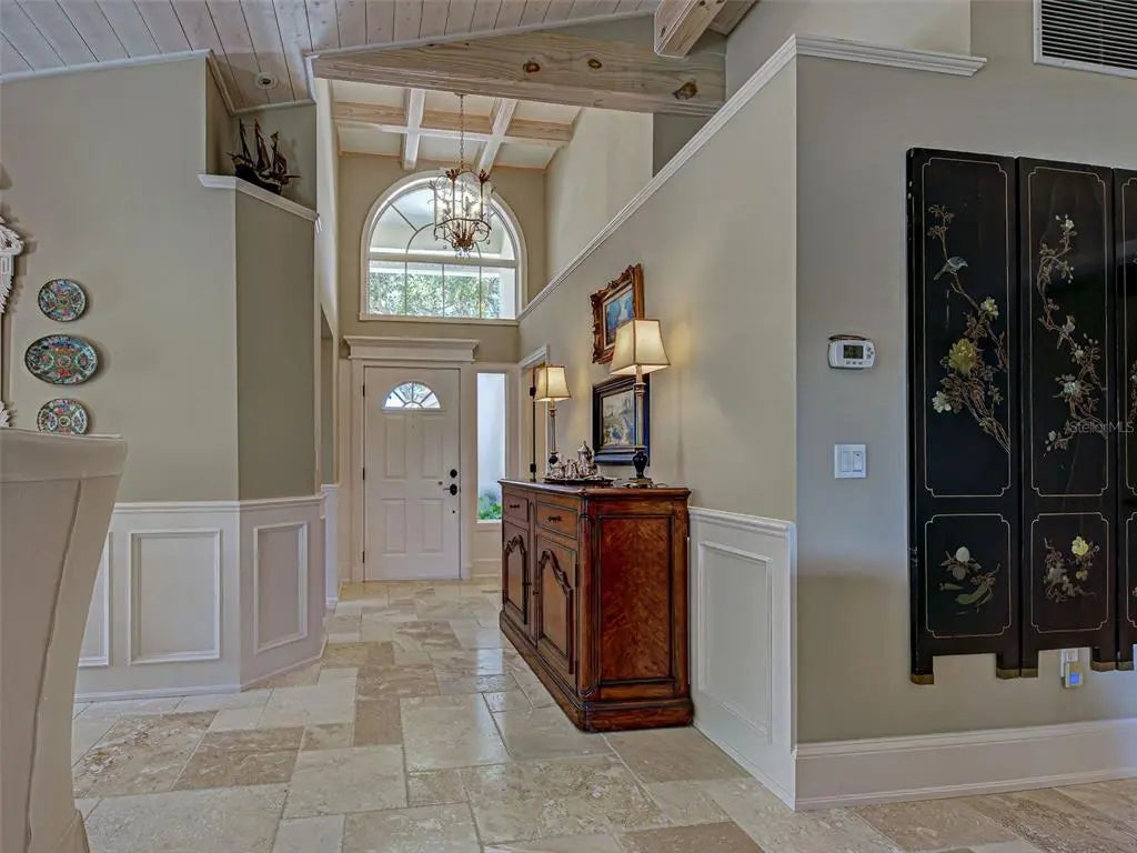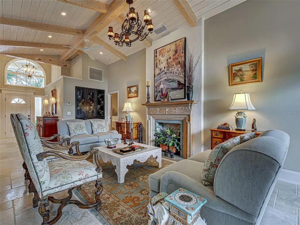 Many homes are listed as Mov-In Ready! When you actually see them, how many really are? This CHESTNUT CREEK property is in the perfect location, close to shopping, the beach, and downtown Venice. It has undergone a TOTAL UPGRADE from top to bottom, inside and out. Nestled in mature landscaping, you will find an exceptional home. The owners are trained in interior design and architectural disciplines. This home you will enjoy without worry. Whole House surge protection was installed, a COMPLETE TEAROFF TILE REROOF was done in 2022, with a wind mitigation and inspection report. In 2025 a new water heater was added and a county requirement for a BACK-FLOW PROTECTION has been inspected and in compliance with their requirement. Step into the home and you will instantly see the amazing use of detailed architectural elements, and high-end finishes. Cathedral Ceilings with whitewashed wood ceilings framed in pickled pine beams are present though-out the home, TRAVERTINE STONE flooring as well. FOYER: The coffered Foyer ceiling as you enter is highlighted by the oversized chandelier - it was acquired from the owners of the Ritz Carlton Pent House in Sarasota. Chair rail was used and raised paneling installed under it continuing into the dining room. Special detail was given to the front door surround, and crown molding was installed where appropriate. Travertine flooring flows through the house. LIVING ROOM: Looking into the Living Room the focal point is the decorative FIREPLACE - the mantle is from a Main-line Philidelphia Mansion, it is an antique ADAM mantle and is highly regarded. The lighting was upgraded to LED ceiling lights and the chandelier was from a Palm Beach Mansion. The banded wrought iron inserted in the 1/2 window is from EGYPT and is 300 years old. The massive built-in bookcase was custom designed with plenty of extra storage in the lower cabinets, a must for Florida homes. As your view shifts to the outside, the 3 panel slider look out unto the LANAI, where a fountain and potted plants become the foreground for the backyard. KITCHEN: The chef's kitchen has stainless steel appliances, including a COMBINATION (microwave, convection oven, and air fryer) installed under the counter in the peninsula island. LED lighting was installed in the ceiling and under counter. The Kraft Maid cabinets have lazy Susan shelving in the corner cabinets, pull out drawers, and a silver ware drawer, done in off white and iron hardware. A commercial fan over the slide in stove is vented to the outside. Over the refrigerator cabinet has been modified to handle all over sized trays, cookie sheets, and platters, and long foil or paper rolls. A herringbone marble backsplash completes the look. New low-e glass window and slider handle the heat from the east morning sun. PRIMARY BEDROOM: More ceiling beams, carpet in bedroom and closet. His and Hers walk-in closets and a 5 piece ensuite with separate shower, and water closet. a dual furniture vanity, Venetian mirrors, more beams, a chandlier from a Grosse Point Michigan Automotive magnate, and a beautiful free standing soaker tub all clad in Cararra Marble. COMMUNITY LOW HOA FEE PAYS FOR LAWN, SHRUB, AND TREE REGULAR MAINTENANCE.
