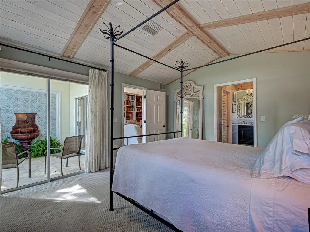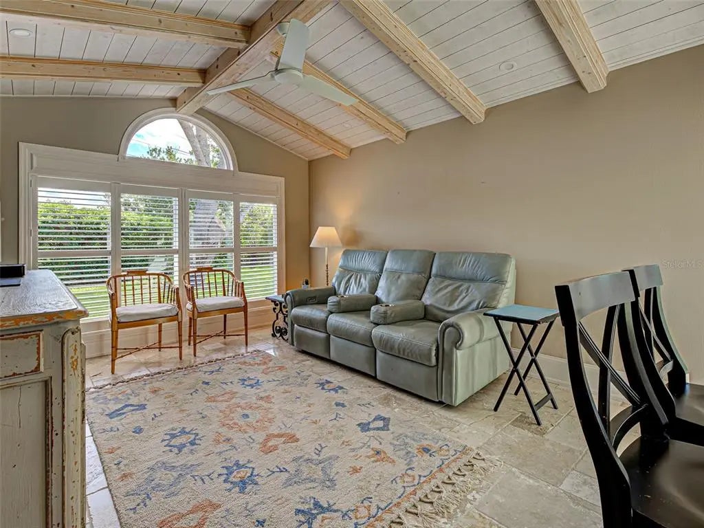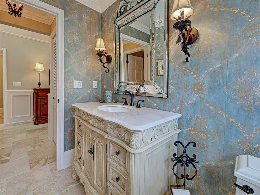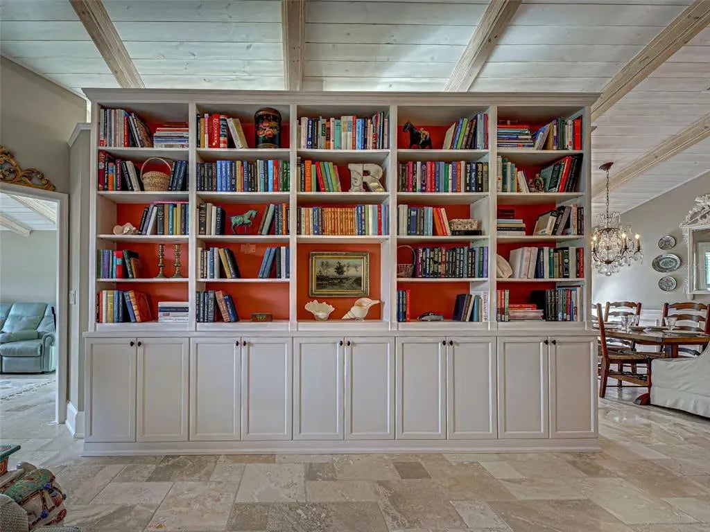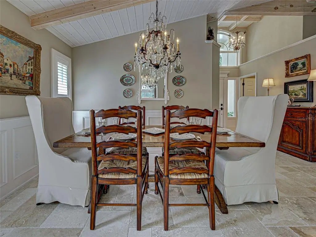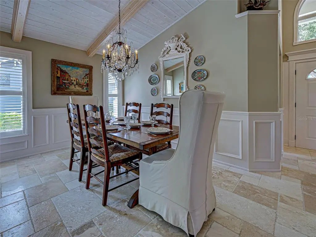 Many homes are listed as Mov-In Ready! When you actually see them, how many really are? This CHESTNUT CREEK property is in the perfect location, close to shopping, the beach, and downtown Venice. It has undergone a TOTAL UPGRADE from top to bottom, inside and out. Nestled in mature landscaping, you will find an exceptional home. The owners are trained in interior design and architectural disciplines. This home you will enjoy without worry. Whole House surge protection was installed, a COMPLETE TEAROFF TILE REROOF was done in 2022, with a wind mitigation and inspection report. In 2025 a new water heater was added and a county requirement for a BACK-FLOW PROTECTION has been inspected and in compliance with their requirement. Step into the home and you will instantly see the amazing use of detailed architectural elements, and high-end finishes. Cathedral Ceilings with whitewashed wood ceilings framed in pickled pine beams are present though-out the home, TRAVERTINE STONE flooring as well. FOYER: The coffered Foyer ceiling as you enter is highlighted by the oversized chandelier - it was acquired from the owners of the Ritz Carlton Pent House in Sarasota. Chair rail was used and raised paneling installed under it continuing into the dining room. Special detail was given to the front door surround, and crown molding was installed where appropriate. Travertine flooring flows through the house. LIVING ROOM: Looking into the Living Room the focal point is the decorative FIREPLACE - the mantle is from a Main-line Philidelphia Mansion, it is an antique ADAM mantle and is highly regarded. The lighting was upgraded to LED ceiling lights and the chandelier was from a Palm Beach Mansion. The banded wrought iron inserted in the 1/2 window is from EGYPT and is 300 years old. The massive built-in bookcase was custom designed with plenty of extra storage in the lower cabinets, a must for Florida homes. As your view shifts to the outside, the 3 panel slider look out unto the LANAI, where a fountain and potted plants become the foreground for the backyard. KITCHEN: The chef's kitchen has stainless steel appliances, including a COMBINATION (microwave, convection oven, and air fryer) installed under the counter in the peninsula island. LED lighting was installed in the ceiling and under counter. The Kraft Maid cabinets have lazy Susan shelving in the corner cabinets, pull out drawers, and a silver ware drawer, done in off white and iron hardware. A commercial fan over the slide in stove is vented to the outside. Over the refrigerator cabinet has been modified to handle all over sized trays, cookie sheets, and platters, and long foil or paper rolls. A herringbone marble backsplash completes the look. New low-e glass window and slider handle the heat from the east morning sun. PRIMARY BEDROOM: More ceiling beams, carpet in bedroom and closet. His and Hers walk-in closets and a 5 piece ensuite with separate shower, and water closet. a dual furniture vanity, Venetian mirrors, more beams, a chandlier from a Grosse Point Michigan Automotive magnate, and a beautiful free standing soaker tub all clad in Cararra Marble. COMMUNITY LOW HOA FEE PAYS FOR LAWN, SHRUB, AND TREE REGULAR MAINTENANCE.