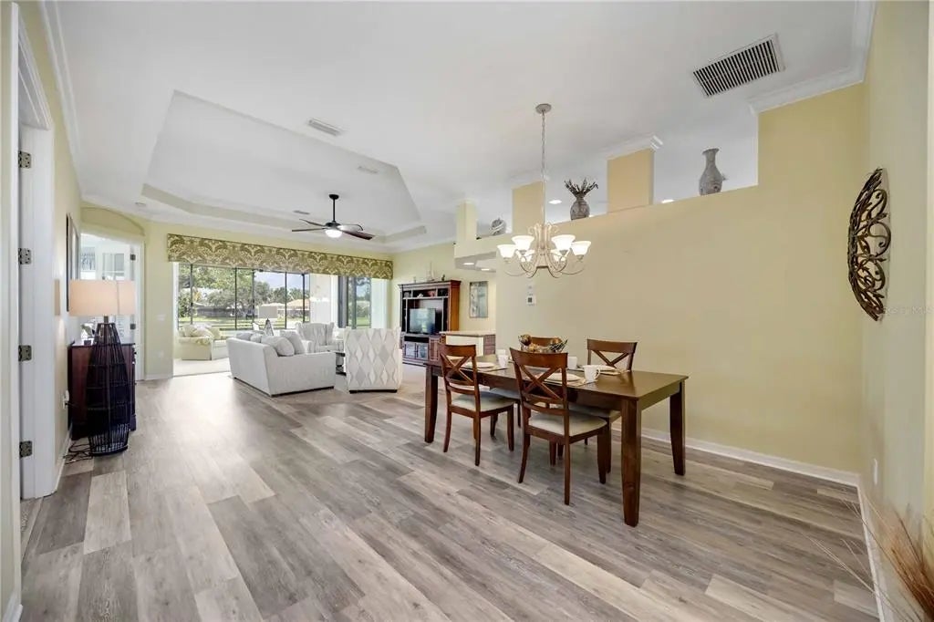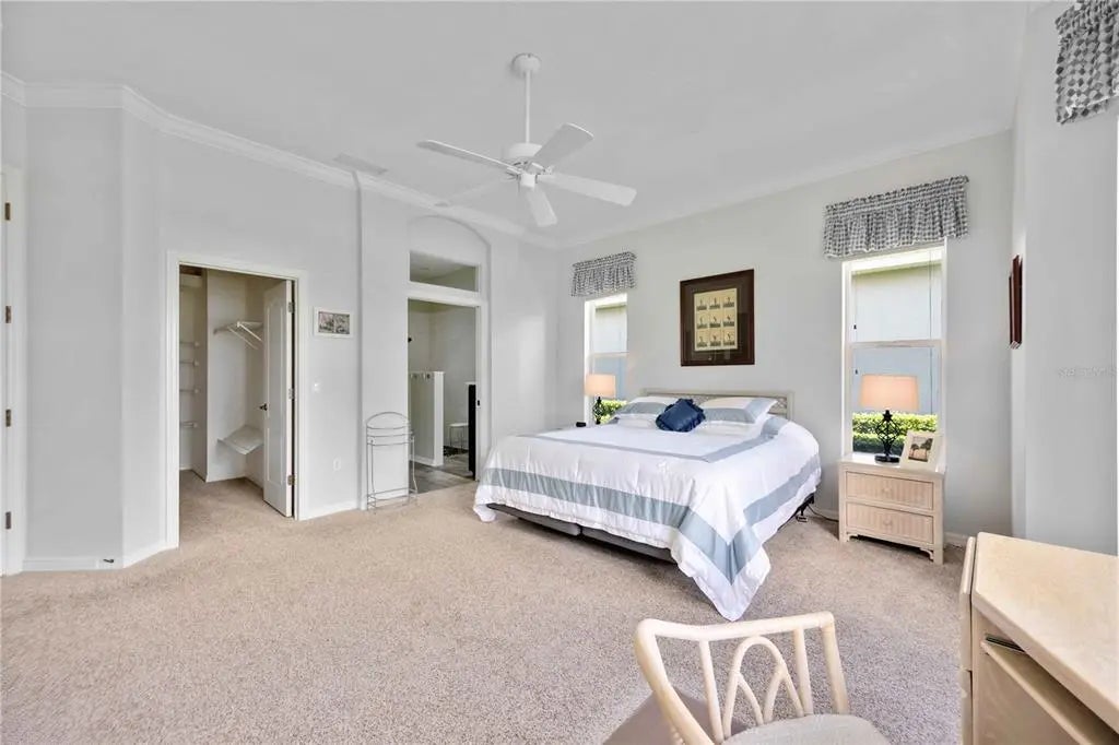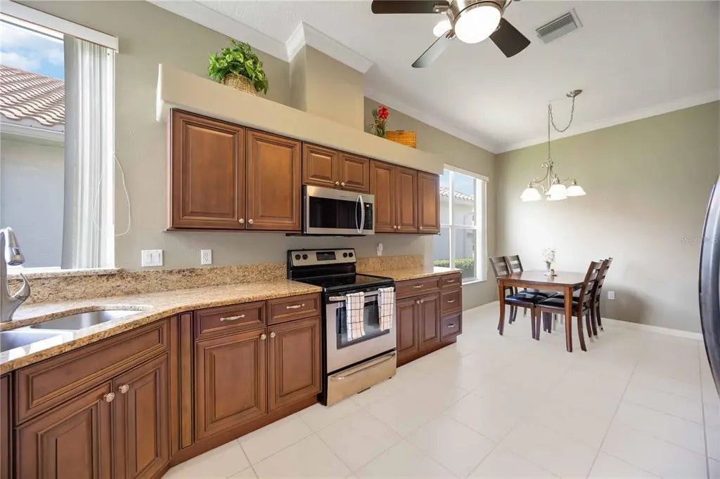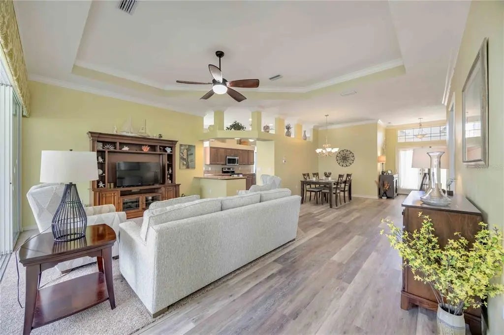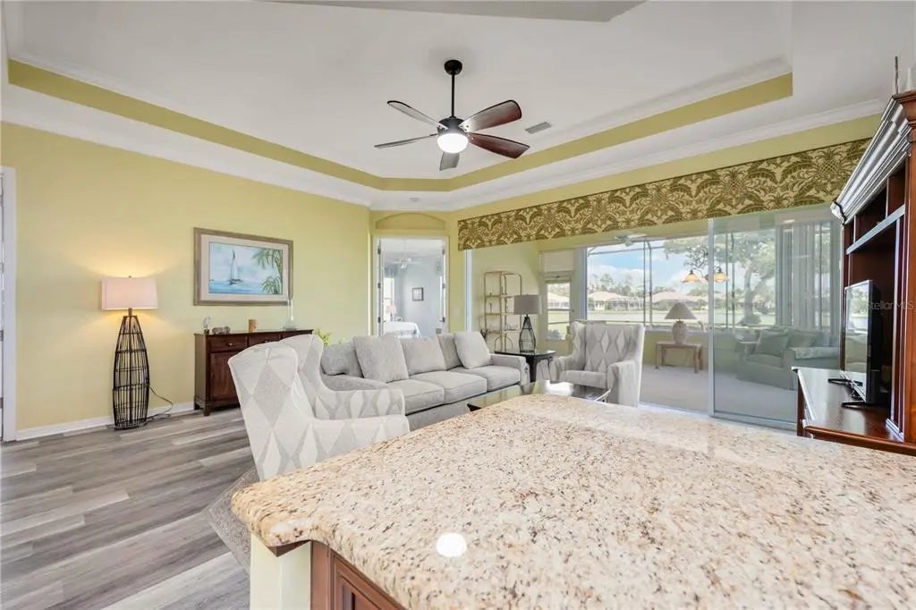 - Interior FeaturesCeiling Fan(s), Crown Molding, High Ceilings, Living Room/Dining Room Combo, Open Floorplan, Solid Wood Cabinets, Stone Counters, Thermostat, Tray Ceiling(s), Walk-In Closet(s), Window Treatments