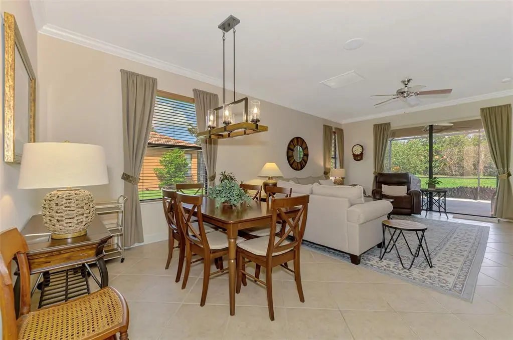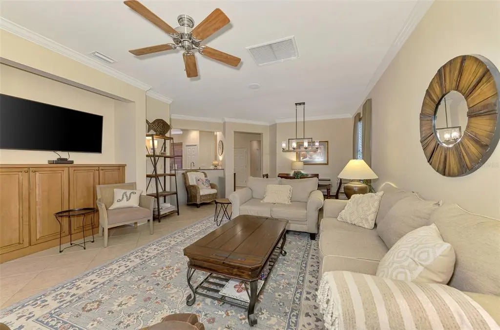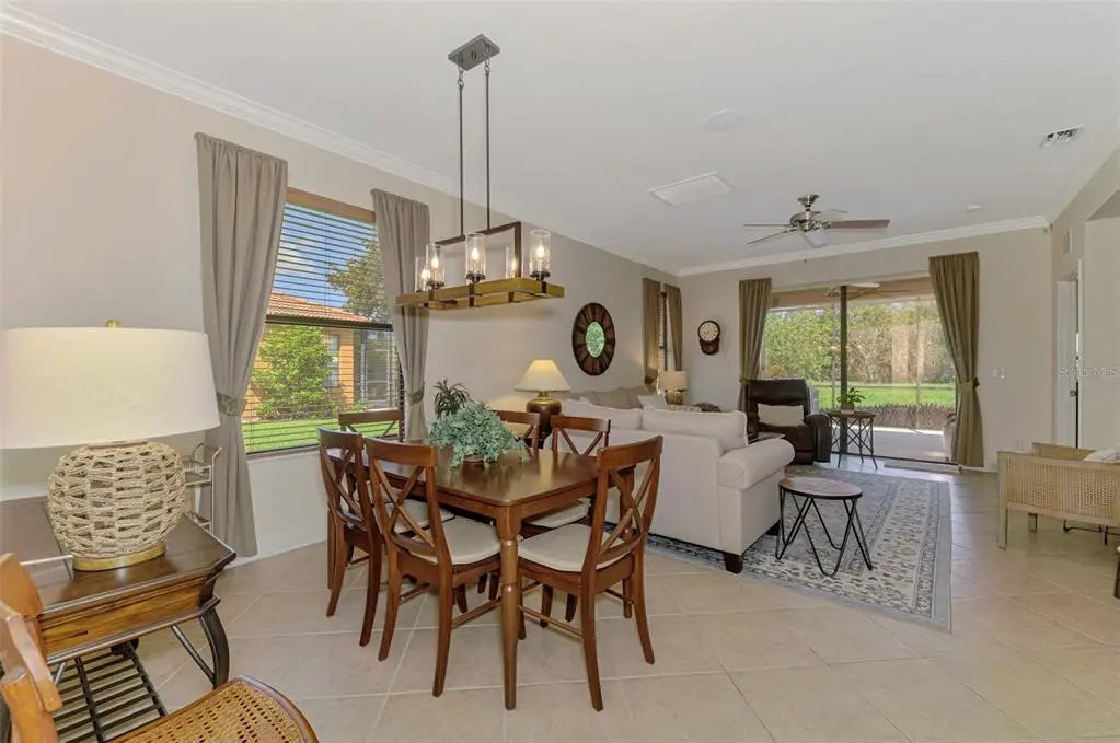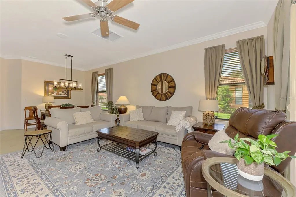 - Interior FeaturesCeiling Fan(s), Crown Molding, In Wall Pest System, Living Room/Dining Room Combo, Walk-In Closet(s), Window Treatments