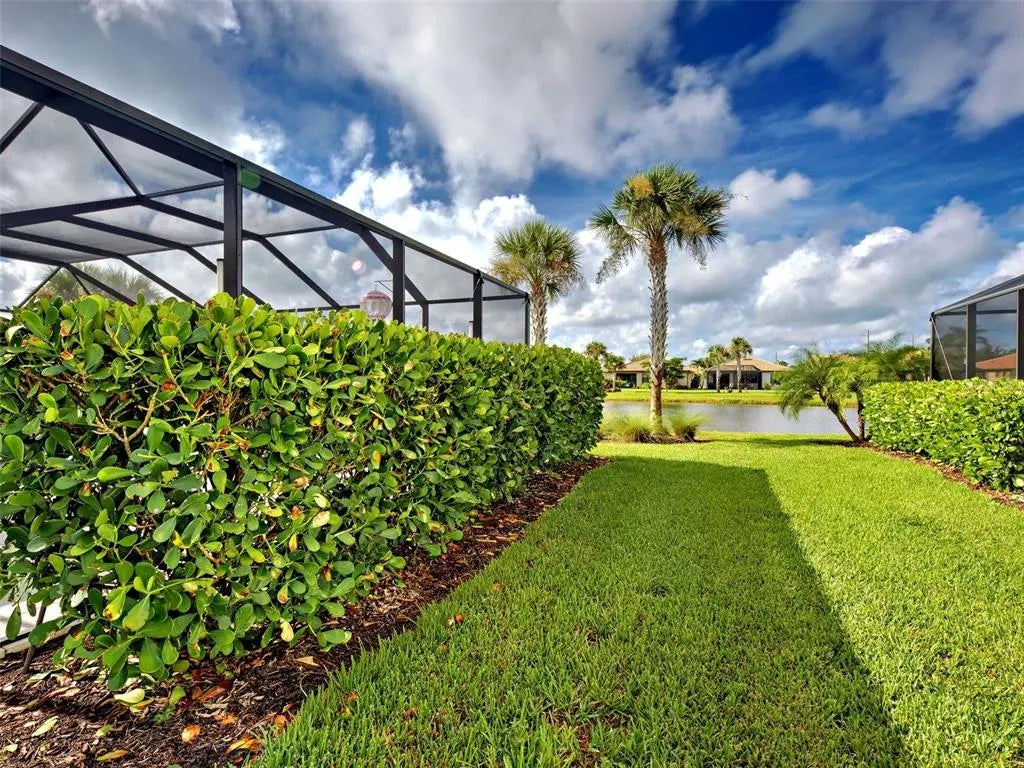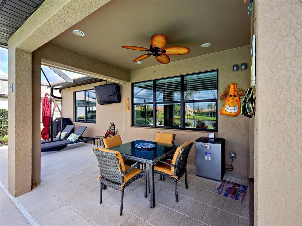 Stunning PARTIALLY FURNISHED Abbeyville POOL home in IslandWalk, boasting 1,800 sq ft, featuring a spacious open floor plan, abundant natural light, and a PREMIUM OVERSIZED LOT, with lovely WATER VIEW! The highlight of this property is the EXTENSIVE LANAI, offering OVER 1000 Sq Ft of OPEN AREA and 120 sq ft of COVERED AREA, ideal for al fresco dining! With a large (14x30 feet) HEATED AQUATECH POOL, a spacious SPA (8.4 X 8.4) and decorative STONE flooring, you will be able to relax and entertain all year round. The kitchen offers a LARGE ISLAND, ideal for cooking and casual dining, ample cabinetry, a built-in pantry, and is perfectly positioned adjacent to the dining room and the additional SUNROOM, that creates a flexible space for dining, reading, a playroom, or simply unwinding. The primary suite showcases a TRAY CEILING, a ceiling fan, a generous walk-in closet, and a beautiful en-suite bath with glass-enclosed walk-in shower. The guest bedroom features charming turret windows, bringing plenty of natural light in, a generous built-in closet, a ceiling fan, and it is paired with a full guest bath, including a bathtub with glass doors and a linen closet, providing additional storage. You'll love the spacious laundry room equipped with white cabinetry, tile flooring and ADDITIONAL STORAGE CLOSET. The versatile flex room offers ideal functionality as a home office, den, or potential third bedroom. The garage features plenty of OVERHEAD RACKS FOR STORAGE and EPOXY FLOORING. The exterior of this home was freshly painted in 2024 and it is situated on a lot which is bigger than the usual size for this floor plan. For peace of mind, a 1 YEAR AHS HOME WARRANTY is offered to the new homeowners. All homes on Sayda Street were built on lots originally designated for estate homes, resulting in each home site being much larger. It’s conveniently located on a tranquil street, just two blocks away from the main resort center. Future connectivity to Manasota Beach Road (projected to be done by August 2026) will enhance this home’s already excellent accessibility. Residing in Islandwalk will give you a sense of resort-style living all year around since it is a very active community with rich amenities including geothermal pools, Har-Tru tennis, pickleball and bocce ball, lap pools, spas, playground, basketball court, a dog park, two State-of-the-Art Fitness Centers, a 24 hr staffed front gate, on site 7 day/week HOA staff, outdoor pavillions with BBQ grill, a library and much more that will keep you and your guests active and engaged. Golf carts are permitted throughout the community and can be taken out of the community if registered. Enjoy exclusive access through a resident-only back gate to the exciting Downtown Wellen Park, featuring a Marketplace anchored by Publix, Atlanta Braves ballpark, restaurants. Conveniently located just 4 miles from I-75, it offers easy access to multiple pristine Gulf beaches and airports. Historic Venice Island, and cultural events are just a short drive away.