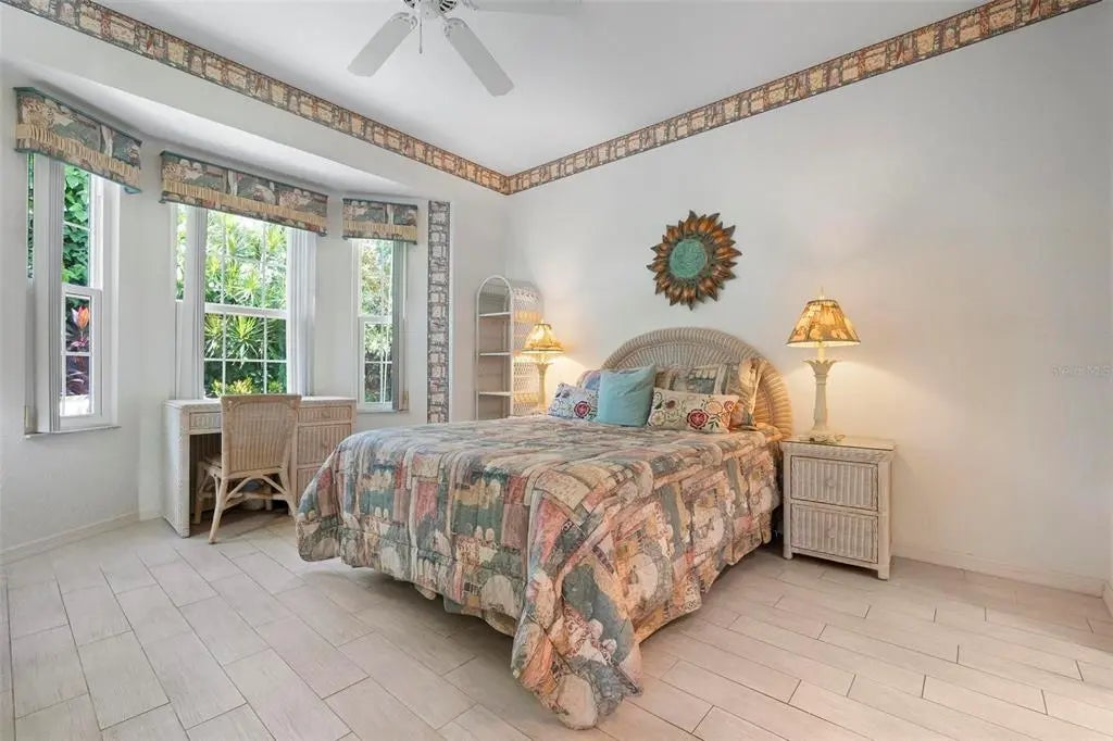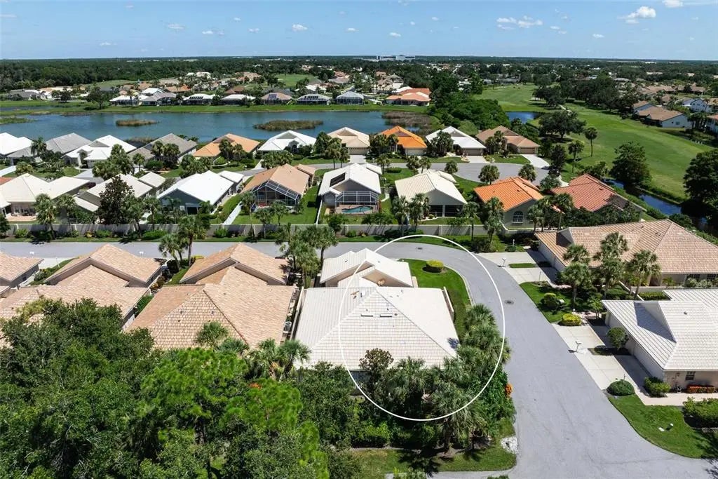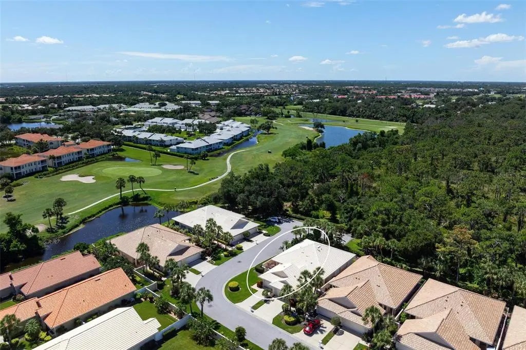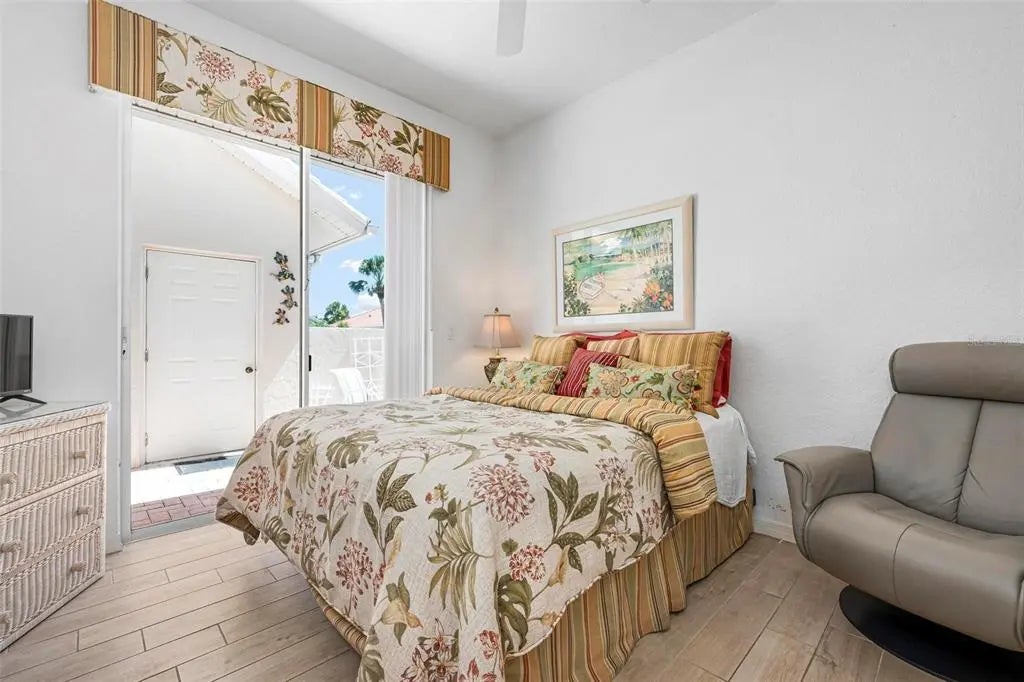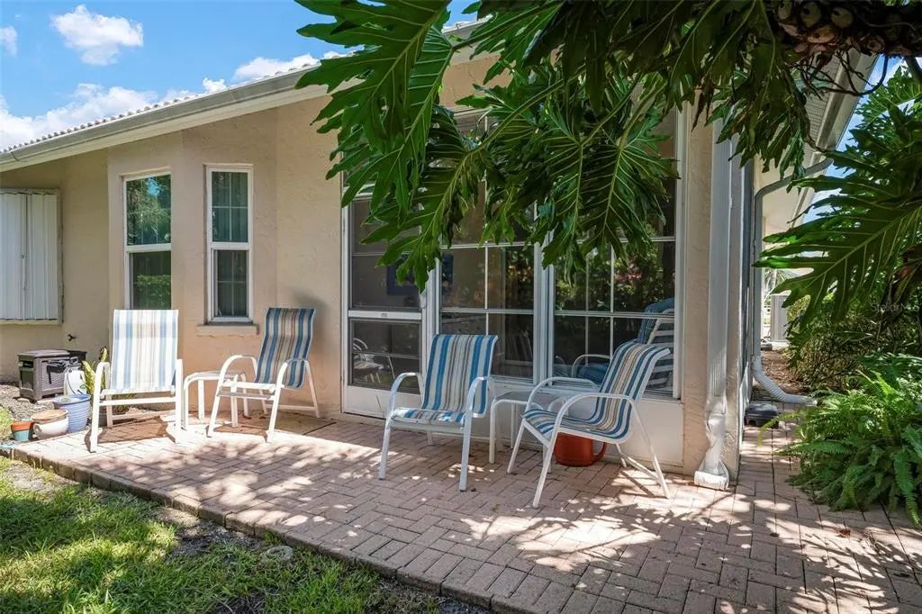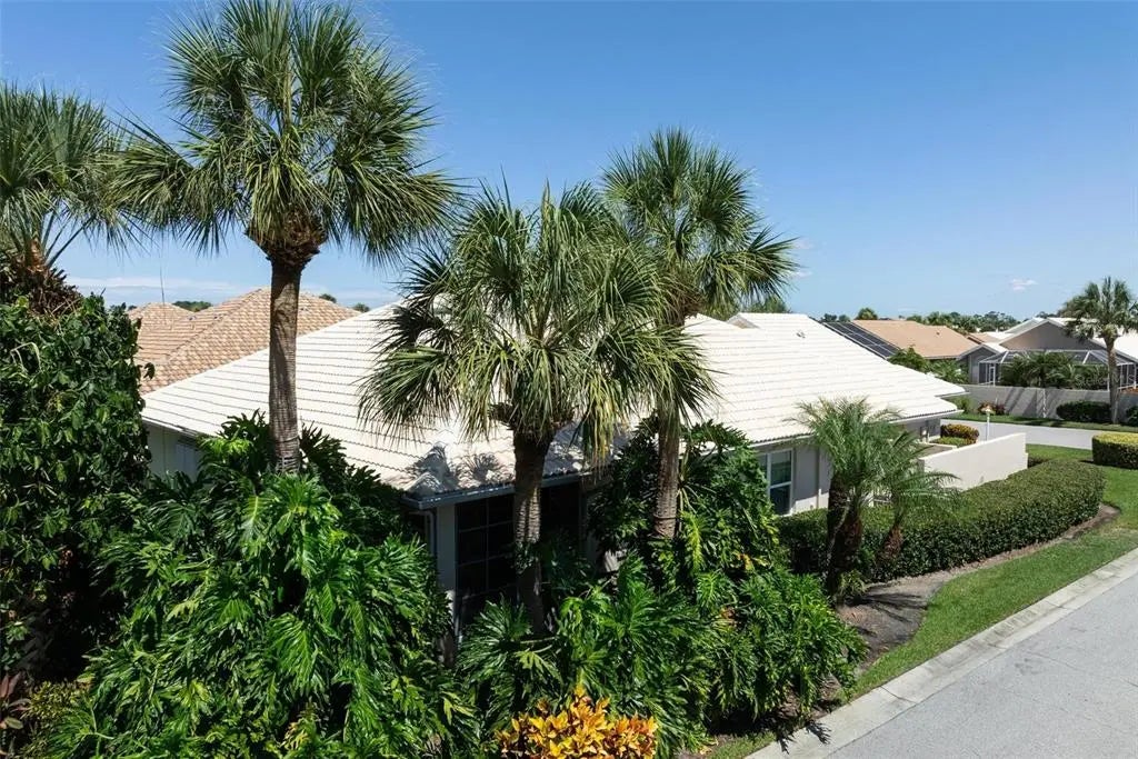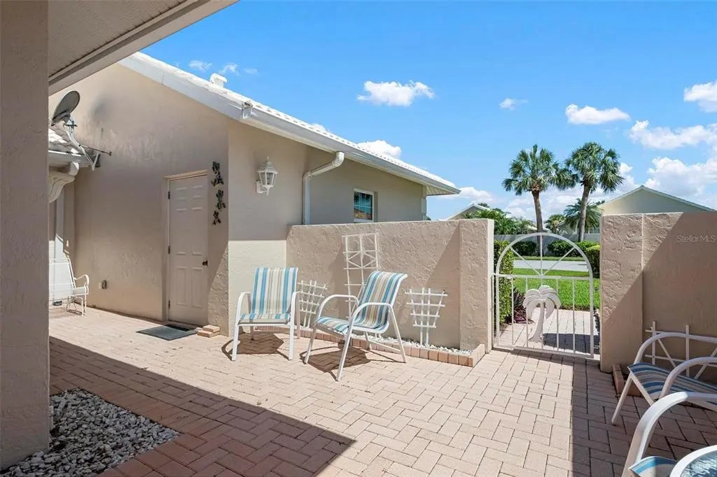Check out this rarely available end unit in the Club Villas of Berkshire with a brand new roof! Imagine stepping into the quaint patio area welcoming you with its charm and cozy feel before you reach your two-bedroom two bathroom maintenance free villa. The vaulted ceilings create a spacious airy feeling. The kitchen, with a breakfast bar, tubular light and abundant storage anchor this home and opens to the dining and living rooms. Both spaces have an abundance of natural light! The split floor plan provides privacy for all. The main bedroom is located in the back of the unit with an en-suite with another tubular light, large walk in closet and beautiful bay window. The other bedroom located up front, has sliders with direct access the patio area. The private lanai out back offers views of lush landscaping and a park, and is the perfect place to relax. Equipped with vinyl sliders it can be used year-round! This unit also has a one car garage with built in storage. AC 2020, Impact windows, Roof 2025, gas generator, 2024 exterior paint. Enjoy this quiet gated neighborhood with community pool and a private road with sidewalks. Or make use of pool, tennis, pickleball and club house at Waterford's main facility. Location is everything with quick access to I75, SMH, shopping, dining and beautiful beaches.