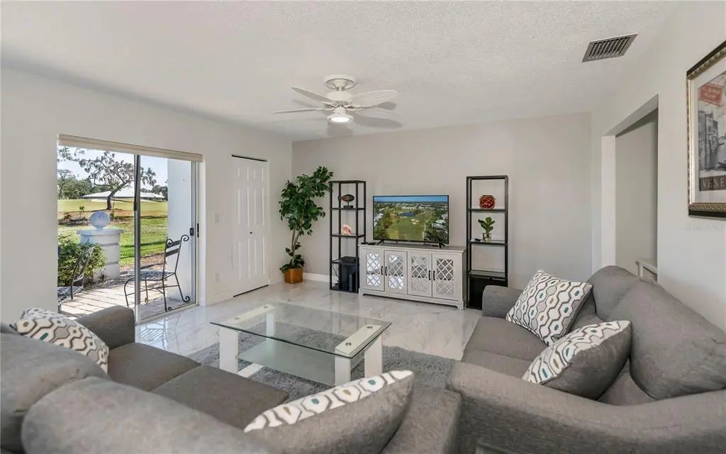 YOUR DREAM HOME is now here and can be yours! FULLY TURN KEY! This exquisite Villa home has been completely remodeled and comes fully furnished and ready to move in. All it needs is you! The Villa features two bedrooms, of which one is a second (guest) bedroom with a large closet and view of the back Lanai The primary bedroom features a king bed set, en-suite bathroom with 2 separate sink areas, a large shower, and beautiful tile flooring and a large walk-in closet. The newly remodeled spacious kitchen features, beautiful new Shaker style soft close cabinets, new granite counter tops. Both bathrooms in the Villa have the same new matching granite counter tops and soft close Shaker style cabinets. There are new light fixtures and ceiling fans throughout the home. Unique to this home is a beautiful sun room just off the kitchen area with privacy blinds. Great for plants or make it an office. The outside includes two patios, of which the patio off both bedrooms is private and perfect place to enjoy your morning coffee. The back patio has a view of the 5th fairway and 6th hole on the Bobcat Golf Course. Just off the private patio is a spacious laundry room which includes a washer, dryer and sink. with new cabinet. It is also great for storage of bicycles, gardening tools or your golf clubs. The Villa has a brand new roof as of January 2024. Comes with a new hot water heater, and central heat and AC. Also included is your cable TV as part of the HOA fees. Just a short walk down the street, there is a heated pool with a clubhouse for the homeowners on Cerromar Way South street! The Plantation Golf And Country Club also offers a individual memberships (optional). Membership, if you choose, offers "Main Club House, large pool and hot tub, snack bar, exercise room, and bocce courts, tennis and pickleball courts. The main clubhouse features fine dining, lounge bar, beautiful views of the Golf Course while inside or outside. The Library can be reserved for your private parties as well. Optional Membership features two beautiful golf courses, "Bobcat" and "Panther". The Club hosts the LPGA qualifying rounds once a year. Realtor Owned. ALL HOA fees should be verified by Buyer or Buyers Agent.