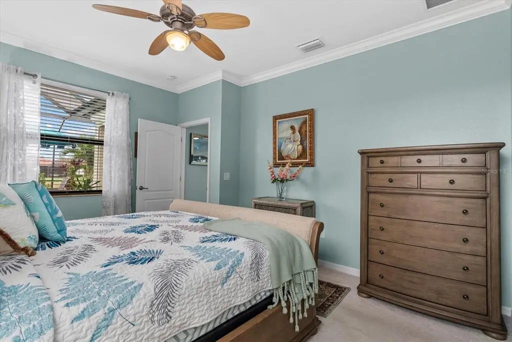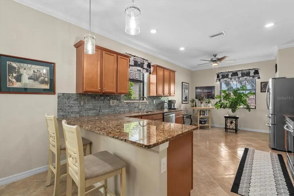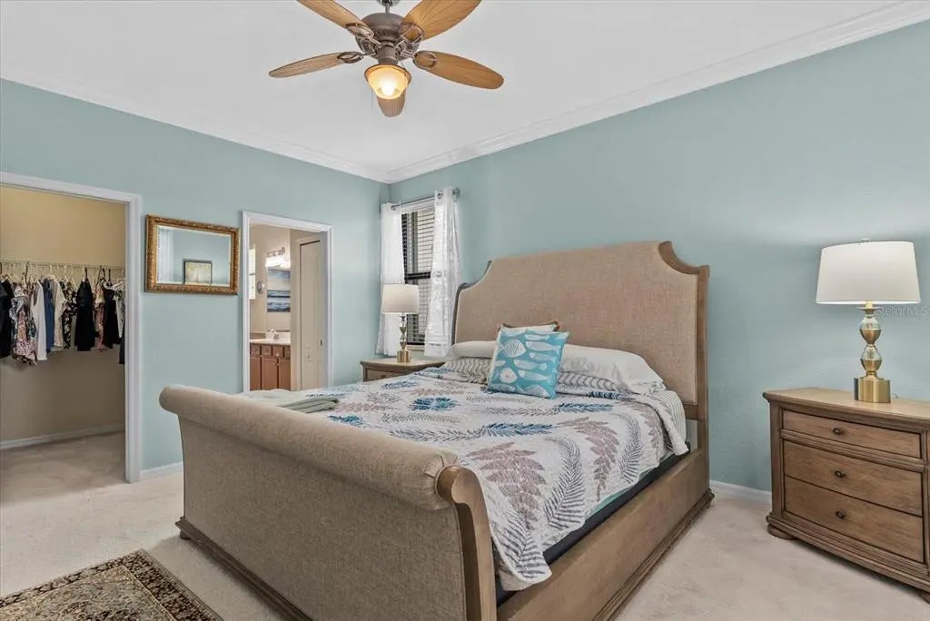 - Interior FeaturesCeiling Fan(s), Crown Molding, Eating Space In Kitchen, High Ceilings, In Wall Pest System, Living Room/Dining Room Combo, Open Floorplan, Primary Bedroom Main Floor, Smart Home, Solid Wood Cabinets, Split Bedroom, Stone Counters, Walk-In Closet(s), Window Treatments
