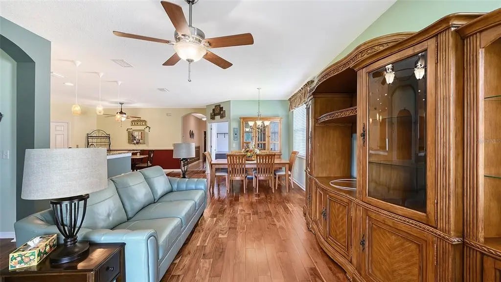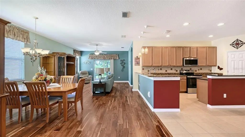 - Interior FeaturesCeiling Fan(s), Eating Space In Kitchen, High Ceilings, Kitchen/Family Room Combo, Living Room/Dining Room Combo, Open Floorplan, Primary Bedroom Main Floor, Thermostat, Window Treatments