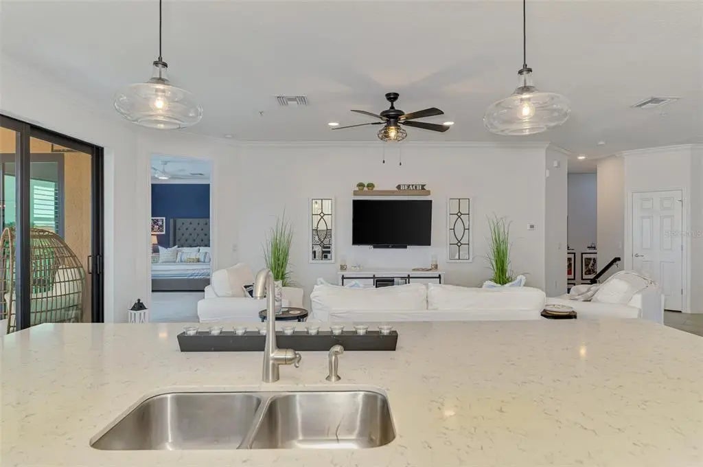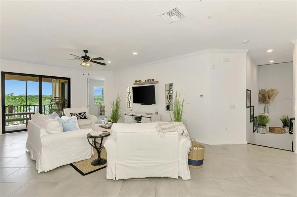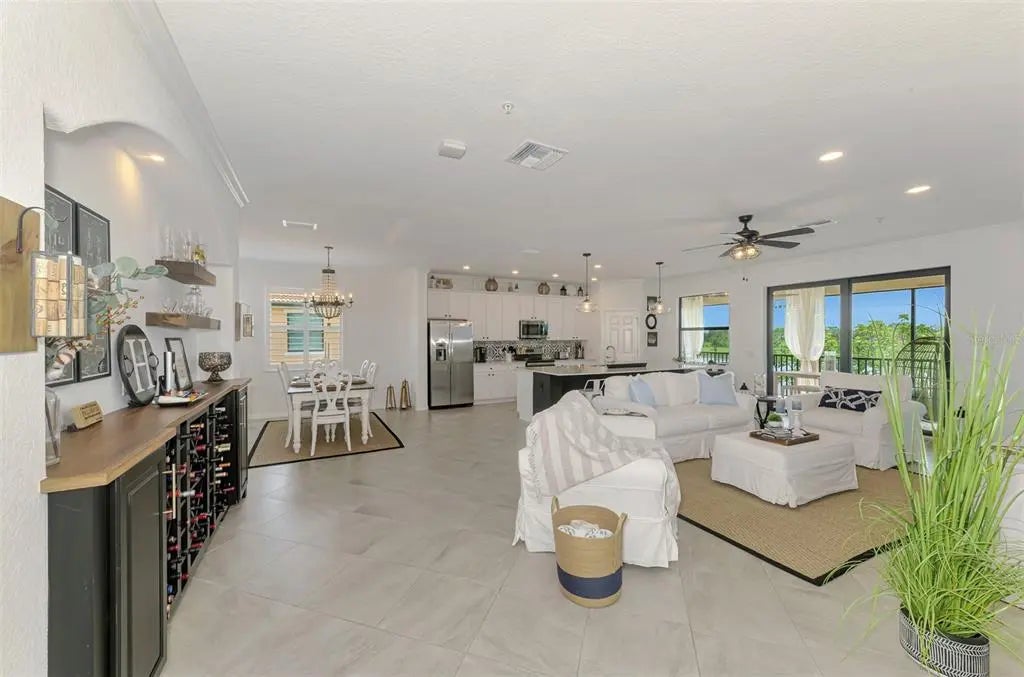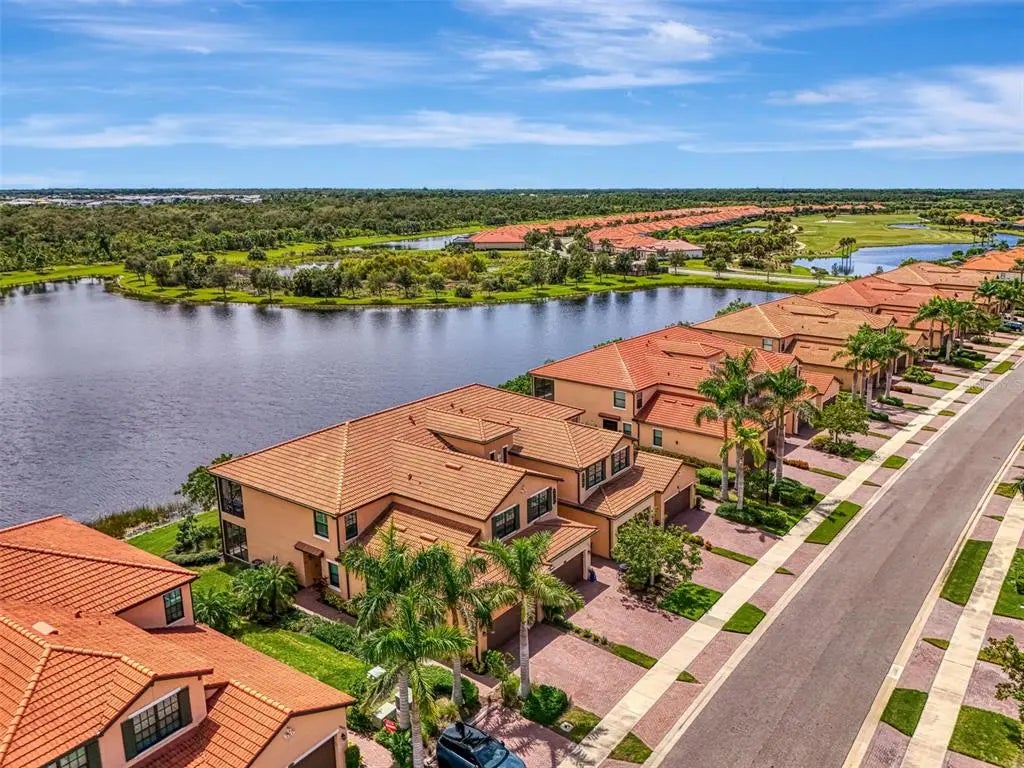 Now is your chance to own this lavishly upgraded TOP FLOOR END UNIT condo, located in the highly sought after guard gated golf community of Sarasota National. Enjoy SOUTH FACING water and preserve views right from the comfort of your oversized screened lanai. HURRICANE IMPACT GLASS throughout! Step through the front door to find an impressive 2-story foyer entrance that was re-imagined with custom installed stair treads with matching banister and a decorative tile landing. Once upstairs you will appreciate a large open floor plan that was made for entertaining. Impress your guests with the thoughtfully designed wine bar with hand crafted wood top and sleek floating shelves. The kitchen showcases an designer backsplash, an oversized island outfitted with decorative woodwork, and tasteful quartz countertops. There is a large pantry with custom shelving system, and the cook of the family will enjoy a sleek stainless steel appliance package. The large living room is a great space to gather with friends or to relax and unwind after an enjoyable day on the golf course. Enjoy spectacular water views from every angle as you move through the home. Other upgrades include tile on the diagonal in the main living areas, crown moldings, plantation shutters, and designer light fixtures and fans. The primary suite offers ample space with extra room to create a home office or sitting area. A set of sliders lead out to the lanai, and a large window allows you to enjoy the stunning view right from the comfort of your bed. 2 walk-in closets with custom closet systems provide impressive organization. The en suite bathroom showcases dual vanities with extra storage, an oversized walk-in shower with seamless glass enclosure, and a private water closet. On the opposite side of the condo, you will find 2 additional bedrooms equal in size, both offering generous walk-in closets. A second full bathroom is just off the two extra bedrooms and features a tub/shower combo. It is easy to create privacy for guests from the main living space by closing the hallway privacy door. There is an in-unit laundry room with an upgraded stackable washer and dryer, freeing up space for more storage. Also included is a large 2 car garage with a 3rd tandem space to create a workshop, home gym, or to store your toys. This building is completely maintenance free and includes all landscaping maintenance, pest control, cable tv, water, sewer, and trash pick-up. Your monthly HOA fee also includes 2 GOLF MEMBERSHIPS that require no extra buy-in fee! This condo is perfect to use as a full-time residence, a part-time seasonal home, or even a great investment... one that will generate substantial rental income! Live like you are on a 5-star vacation with a 30,000sf clubhouse with resort style pool, hot tub, outdoor tiki bar serving food and drinks daily, a coffee house, fine dining restaurant, 7,000sf fitness center with top-of-the-line equipment and classes, day spa, card room, bocce ball, pickle ball, tennis, dog park, playground, event lawn, and 18-hole championship golf course. Sarasota National is a guard gated 2400-acre International Audubon Bird Sanctuary that offers some of the most beautiful water and preserve views in all of Venice. This home is just minutes to the Atlanta Brave's spring training camp at the CoolToday Park Stadium, as well as the town center of Wellen Park. Explore 3 local beaches and historic downtown Venice, all less than 15 minutes from your front door!
