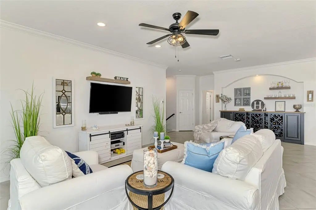 - Interior FeaturesCeiling Fan(s), Crown Molding, Eating Space In Kitchen, High Ceilings, In Wall Pest System, Kitchen/Family Room Combo, Living Room/Dining Room Combo, Open Floorplan, Solid Surface Counters, Split Bedroom, Thermostat, Walk-In Closet(s), Window Treatments