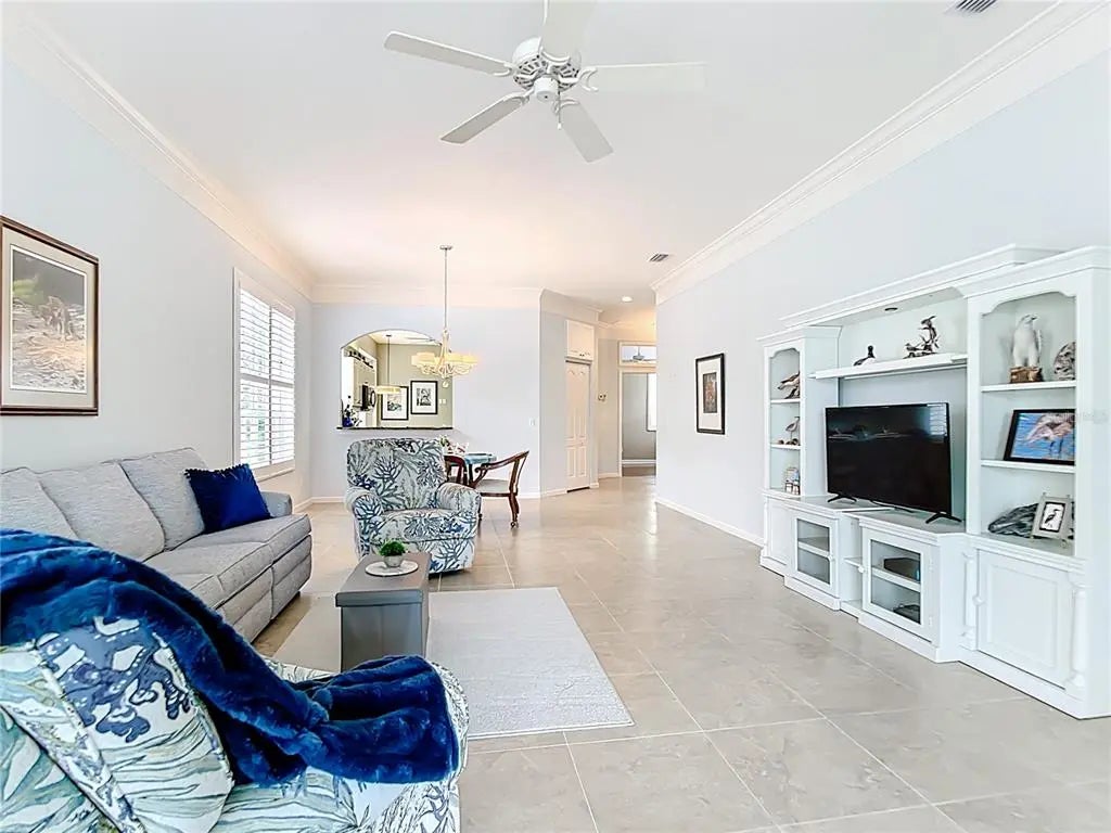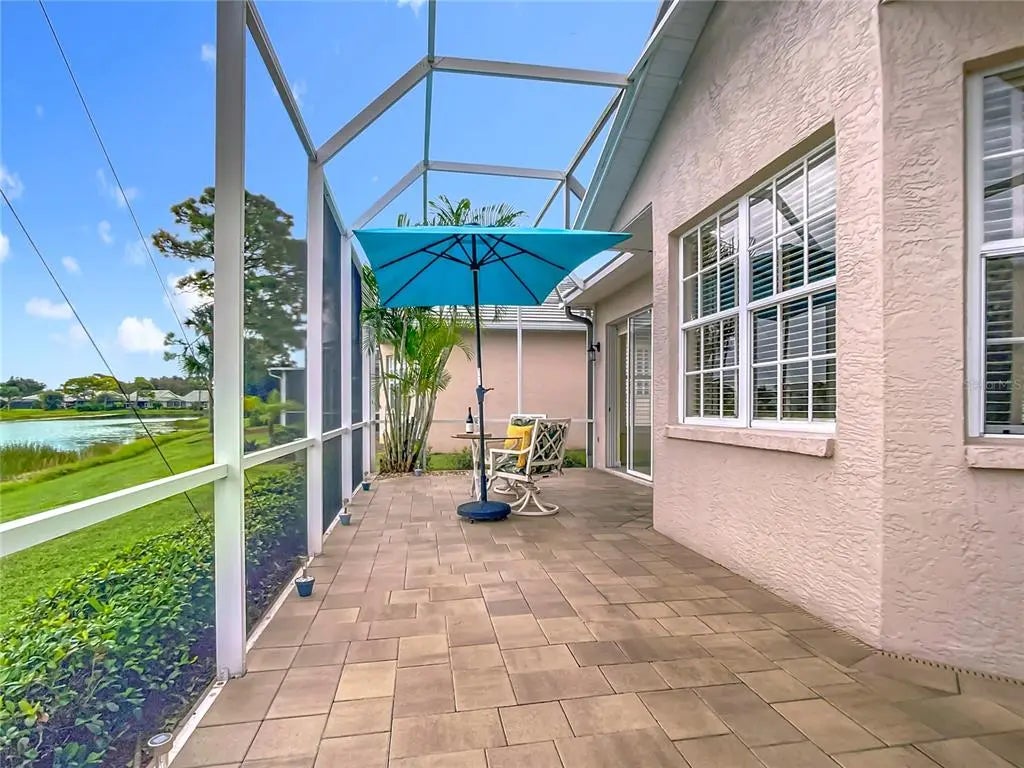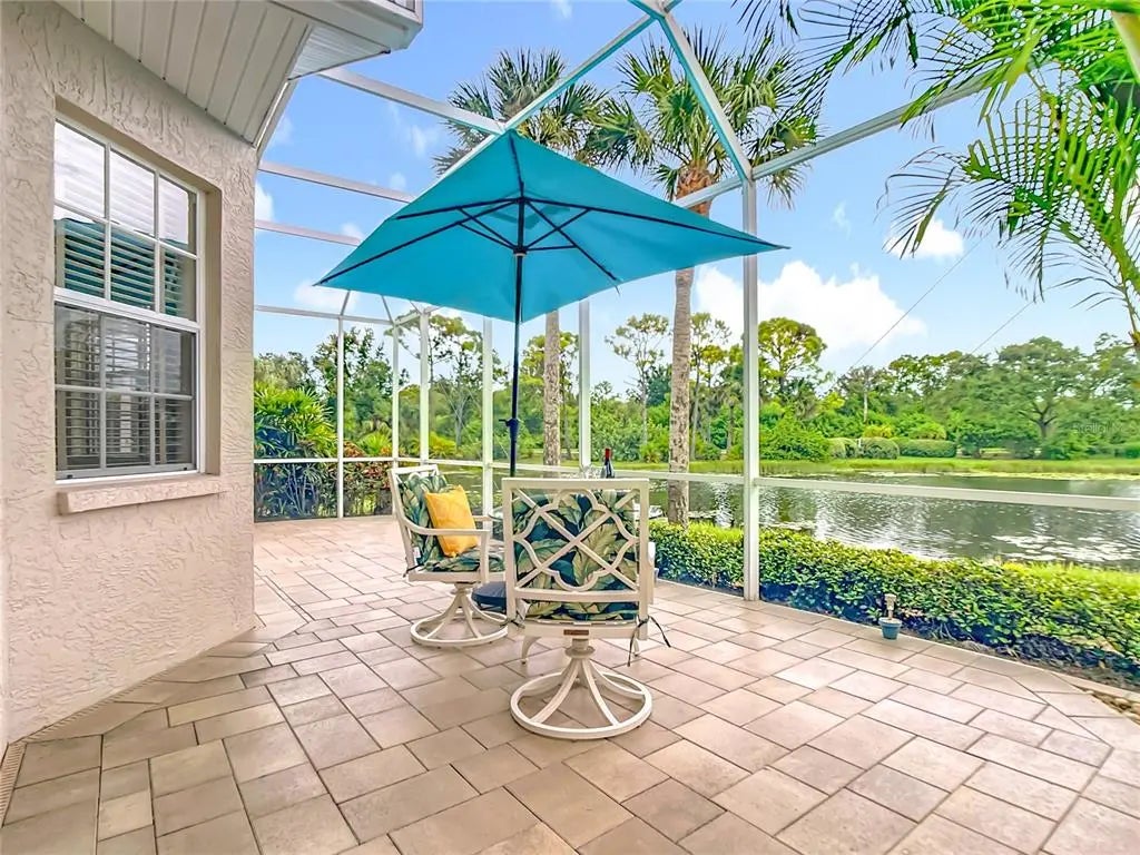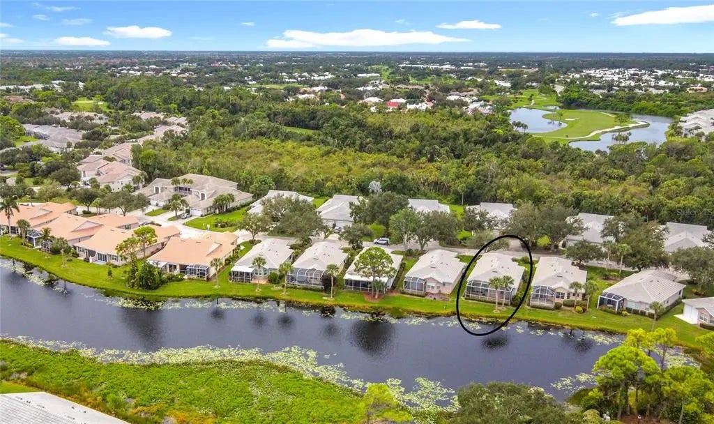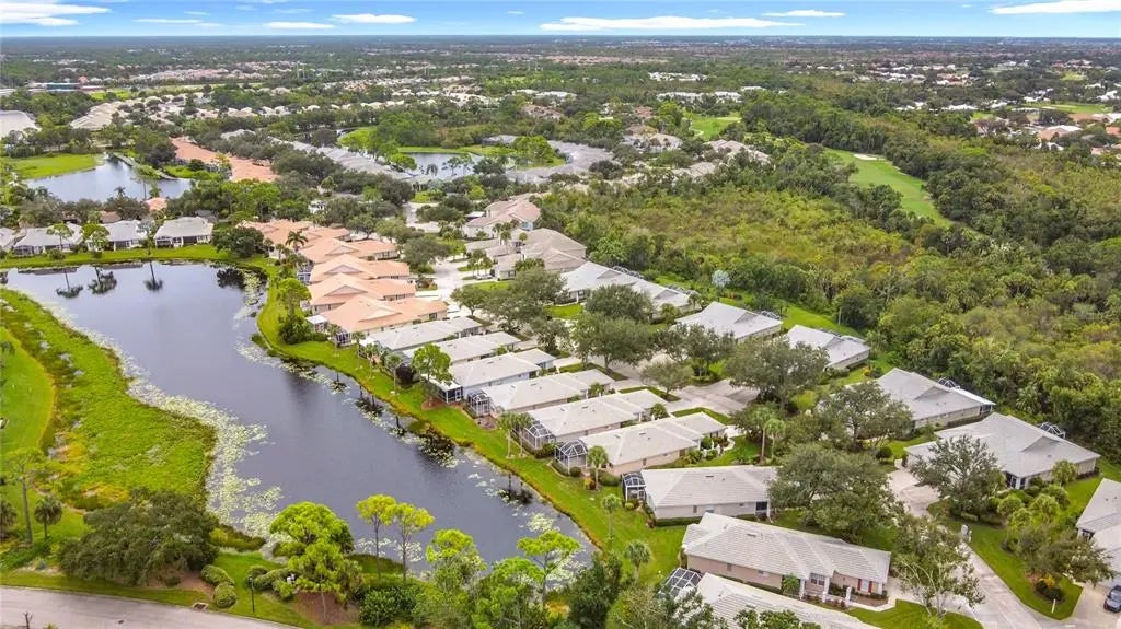 SWEEPING WATER VIEWS IN PLANTATION GOLF & COUNTRY CLUB! Experience the 'best of both worlds' - carefree condo living with the feel of a single-family home. This elegant 3 bedroom, 2.5 bathroom, 2 car garage detached villa offers nearly 2,000 sq. ft. of light-filled living space with lakefront views, high ceilings, crown molding, plantation shutters AND MORE! Recent improvements include a NEW ROOF (2023), NEW AC (2023), NEW HOT WATER TANK (2025), and wood-look flooring in bedrooms for easy care (no carpet here!). This home is a storage lover’s dream, featuring a spacious hall closet, LARGE WALK-IN CLOSETS in both the primary and guest bedroom, linen closets in both bathrooms, cabinetry in laundry room, and a generous kitchen pantry to keep everything organized. The gourmet kitchen features granite countertops, Noir stainless steel appliances, sliding cabinet shelves, breakfast bar, under-cabinet lights, and bay-window dining nook. When it's time to unwind, the spacious primary suite features a bay window with water views, soaking tub, frameless glass shower, and dual vanity. Enjoy seamless indoor-outdoor living with a screened front porch and EXTENDED REAR LANAI overlooking the serene lake, where you'll enjoy bird watching and nightly sunsets. The versatile bonus / sunroom creates the ideal spot for a craft area, music room, reading nook...the possibilities are endless. Laundry room has been thoughtfully upgraded with stylish cabinets, granite countertop and utility sink, leading to an epoxy-finished 2-car garage with convenience and style. Located in the desirable Plantation Golf & Country Club community of The Villas of St. Andrews II, this neighborhood has tree-lined streets and a majestic live oak adorned with orchids in your front yard. Residents enjoy maintenance-free living with reasonable and stable HOA fees — all assessments have been paid, ensuring peace of mind for the future. HOA fee includes roof reserves, exterior painting (to be completed this Fall), structural insurance, lawn care, irrigation, basic cable, and community pool just a short stroll away. OPTIONAL MEMBERSHIP at Plantation Golf & Country Club is available, giving residents access to two championship 18-hole golf courses, 13 Har-Tru tennis courts, 6 pickleball courts, state-of-the-art fitness center, a Jr. Olympic pool, exceptional dining and social events. This makes Villas II perfect for those seeking an active lifestyle, social events, and luxury amenities. Just minutes to Venice beaches, Wellen Park, shopping, dining, and the Atlanta Braves stadium. Don’t miss this rare opportunity for carefree lakefront living! (Disclaimer: some interior photos have been virtually staged)