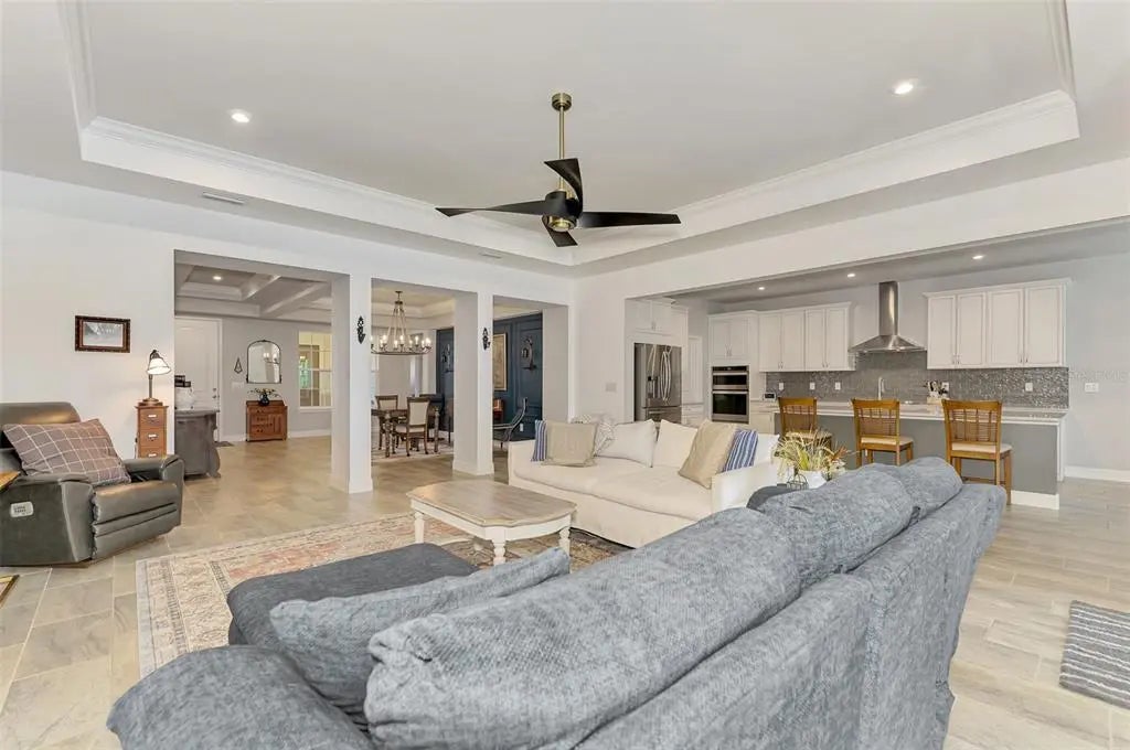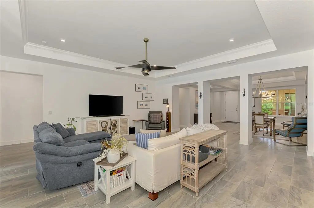 - Interior FeaturesCeiling Fan(s), Crown Molding, Eating Space In Kitchen, High Ceilings, Kitchen/Family Room Combo, Living Room/Dining Room Combo, Open Floorplan, Solid Surface Counters, Split Bedroom, Thermostat, Walk-In Closet(s), Window Treatments