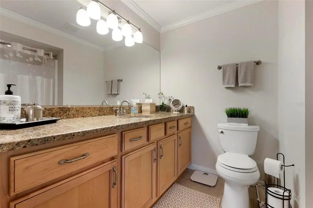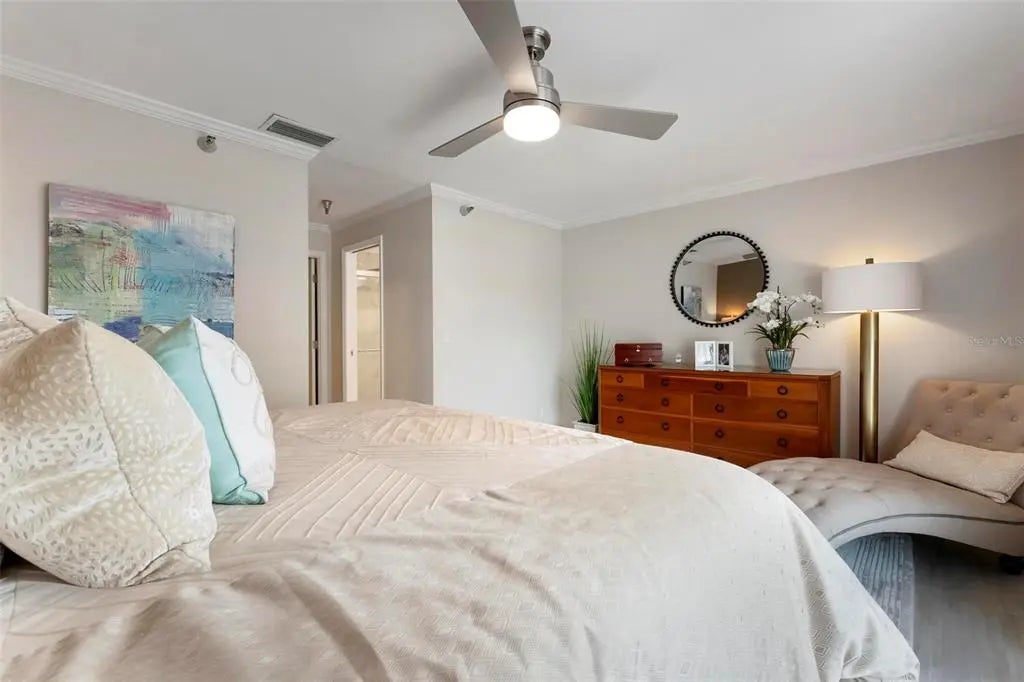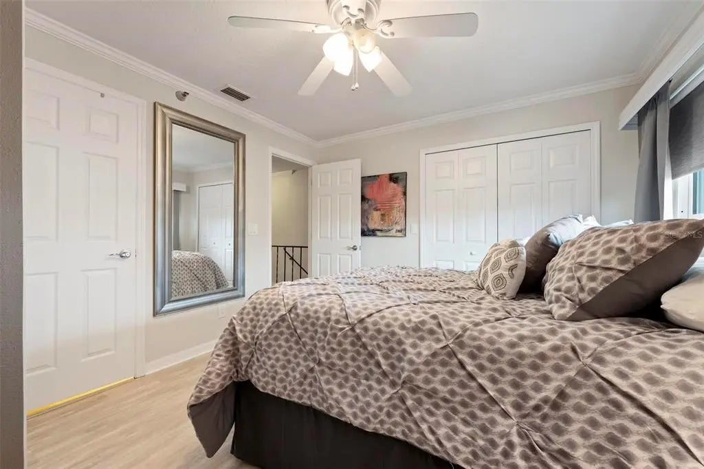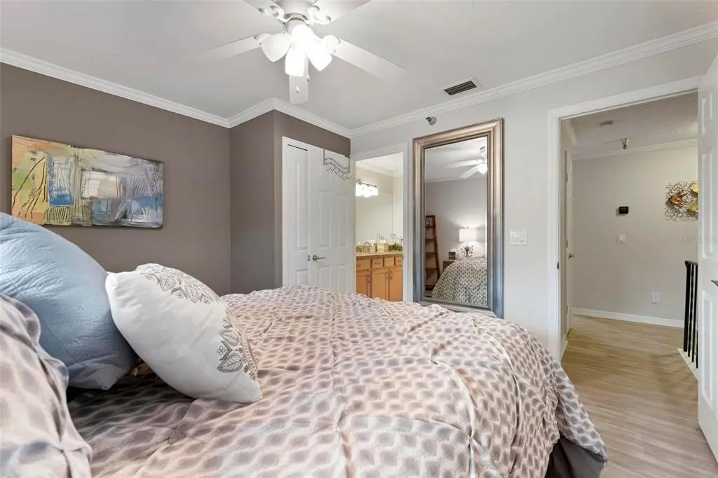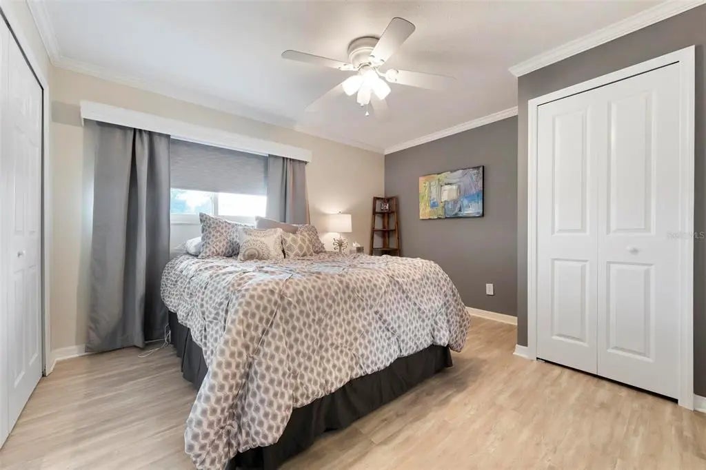 - Interior FeaturesCeiling Fan(s), Crown Molding, Solid Wood Cabinets, Stone Counters, Walk-In Closet(s), Window Treatments