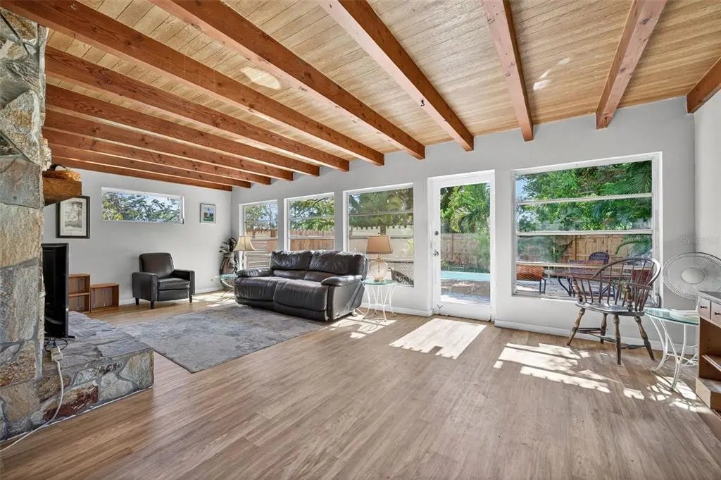 Welcome to 5075 Lemon Bay Drive, a private oasis in the heart of South Venice where old Florida charm meets modern updates on over half an acre of lush, unrestricted land. This beautifully refreshed 3-bedroom, 1.5-bath pool home offers approximately 1,500 square feet of light-filled living space. Step inside to an expansive great room with a dramatic wall of windows that frame the backyard and pool, inviting the outdoors in. A stone wood-burning fireplace anchors the space, creating a warm, welcoming centerpiece. The eat-in kitchen has been tastefully updated with stainless steel appliances, ample cabinetry, and generous prep space. Upstairs, two of the bedrooms open to a spacious balcony overlooking the backyard and pool. The home has been upgraded with a new roof, air conditioning system, flooring, and appliances. Situated on over half an acre lot that offers exceptional privacy and flexibility — whether you dream of gardening, parking your RV or boat, or even adding a guest house or workshop, there are no HOA restrictions to limit your imagination. As a resident of South Venice, you also have the option to join the South Venice Civic Association, granting access to the community boat ramp and the exclusive South Venice Beach Ferry, offering a truly unique coastal lifestyle. Just minutes from beaches, dining, shopping, and historic Downtown Venice, this home combines convenience, freedom, and charm in one of Sarasota County’s most desirable areas. Come experience the lifestyle that 5075 Lemon Bay Drive has to offer — and make it yours before someone else does.