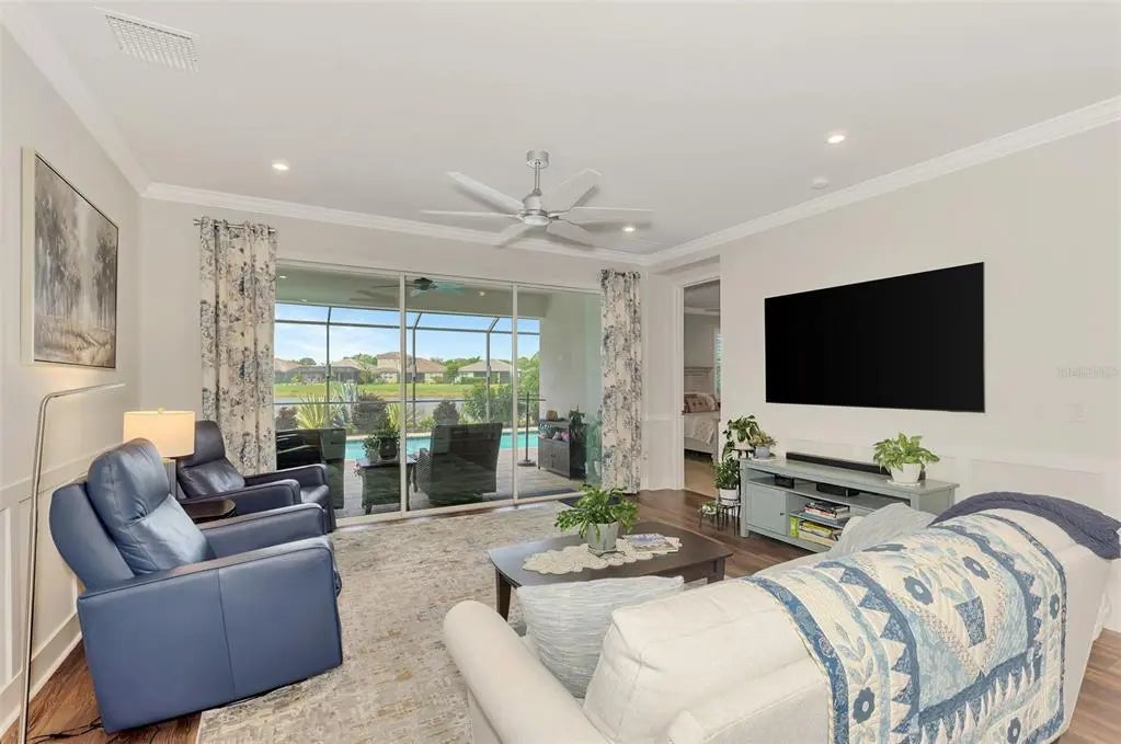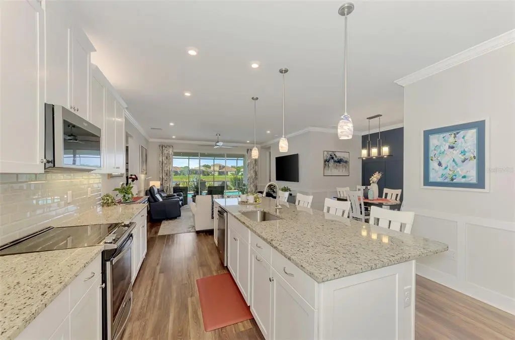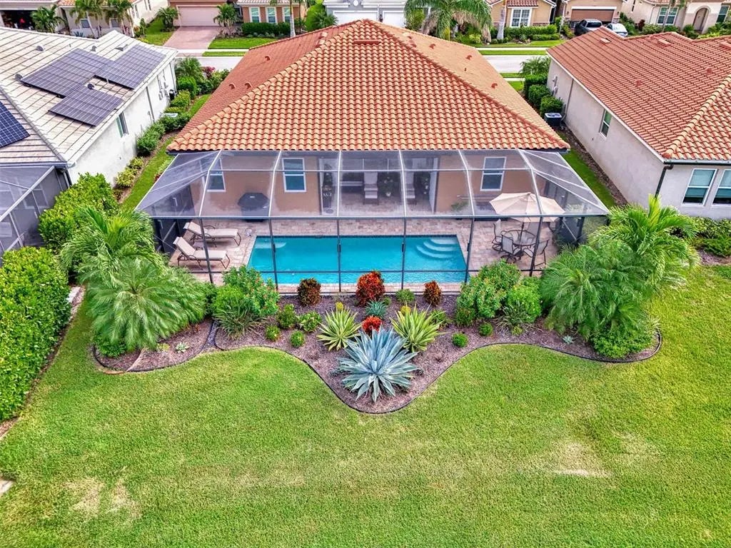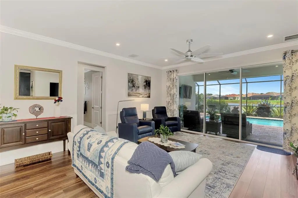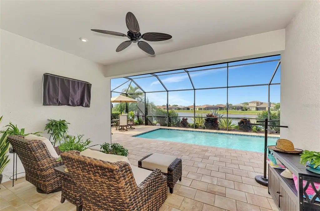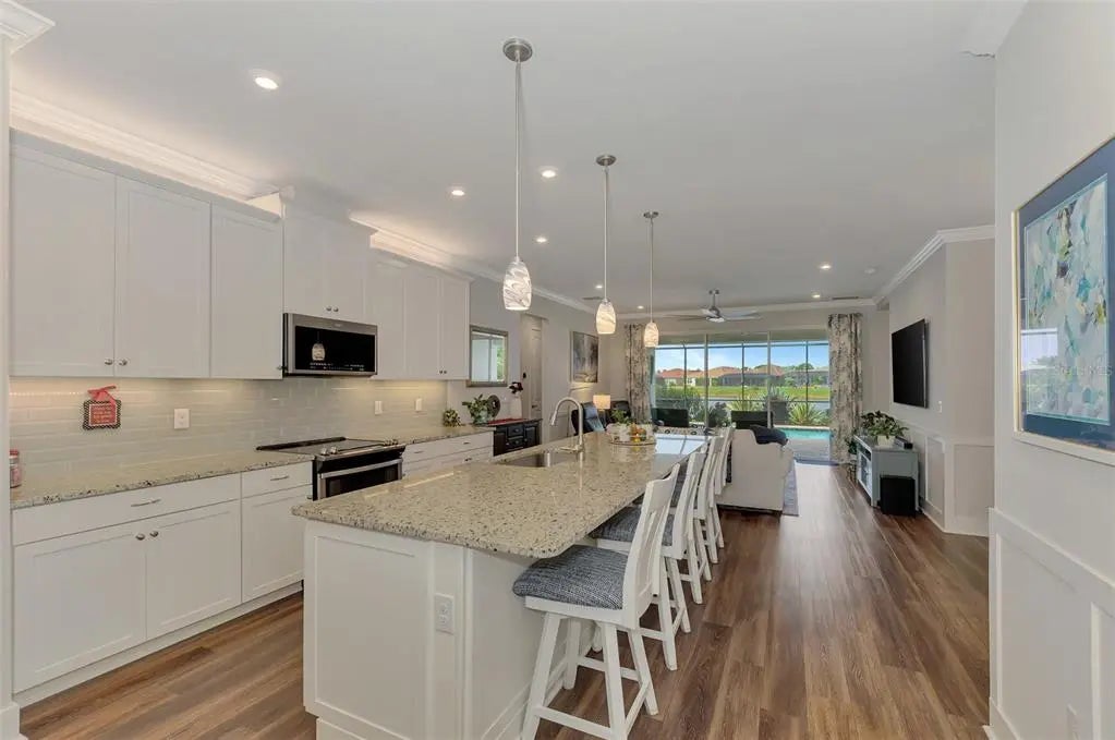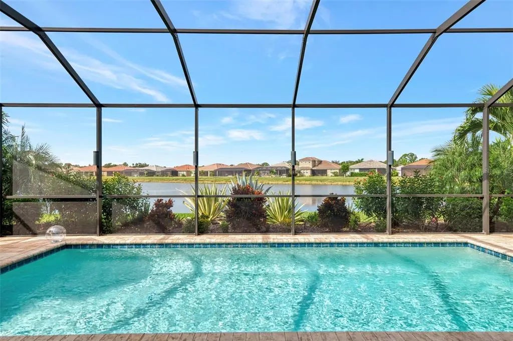 Spacious and inviting, this single level gem has 2332 square feet of living space with 4 bedrooms, flex room, 3 baths and a 2-car tandem garage for extra storage space. A must with Florida living! This home is what you need for a growing family or when the grandkids come to visit. This pool home offers comfortable living with an open floor plan, crown molding throughout and luxury plank flooring in the main living areas for that comfortable relaxed feeling. The kitchen is a cooks dream with its extra-large island and overlooking the dining and living spaces, perfect for entertaining. The owner's suite and one additional bedroom both include an ensuite bathroom and walk-in closets. The remaining 2 bedrooms both include walk-in closets and share a full bathroom. Enjoy seamless indoor-outdoor living with triple sliding doors that totally open to the outdoor retreat. Enhancements include hurricane windows and outdoor hurricane curtain on lanai, recently screened pool cage, added landscaping and lighting, whole house water softener and filtration system, AC soft start, insulation added in garage and driveway widened. Over $55,000 in upgrades! Located in the vibrant community of Renaissance at Wellen Park and just a golf cart ride away from downtown Wellen Park which is ranked #6 best-selling master planned community in the US where you can enjoy shopping, restaurants, entertainment and so much more. Don't miss this opportunity to own your piece of paradise!