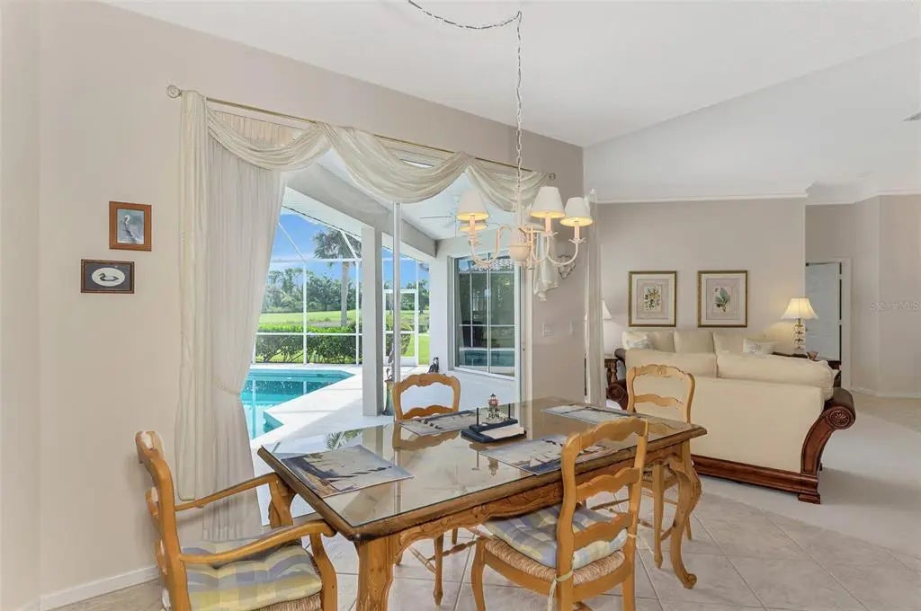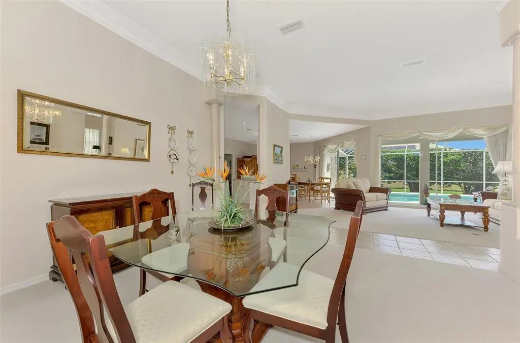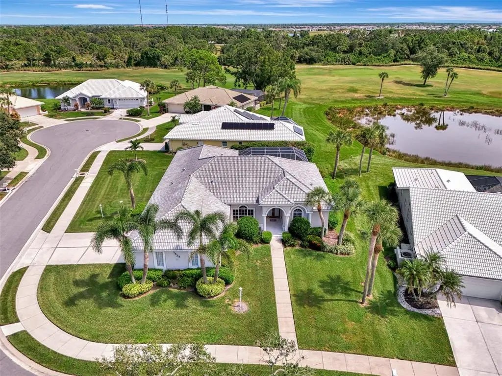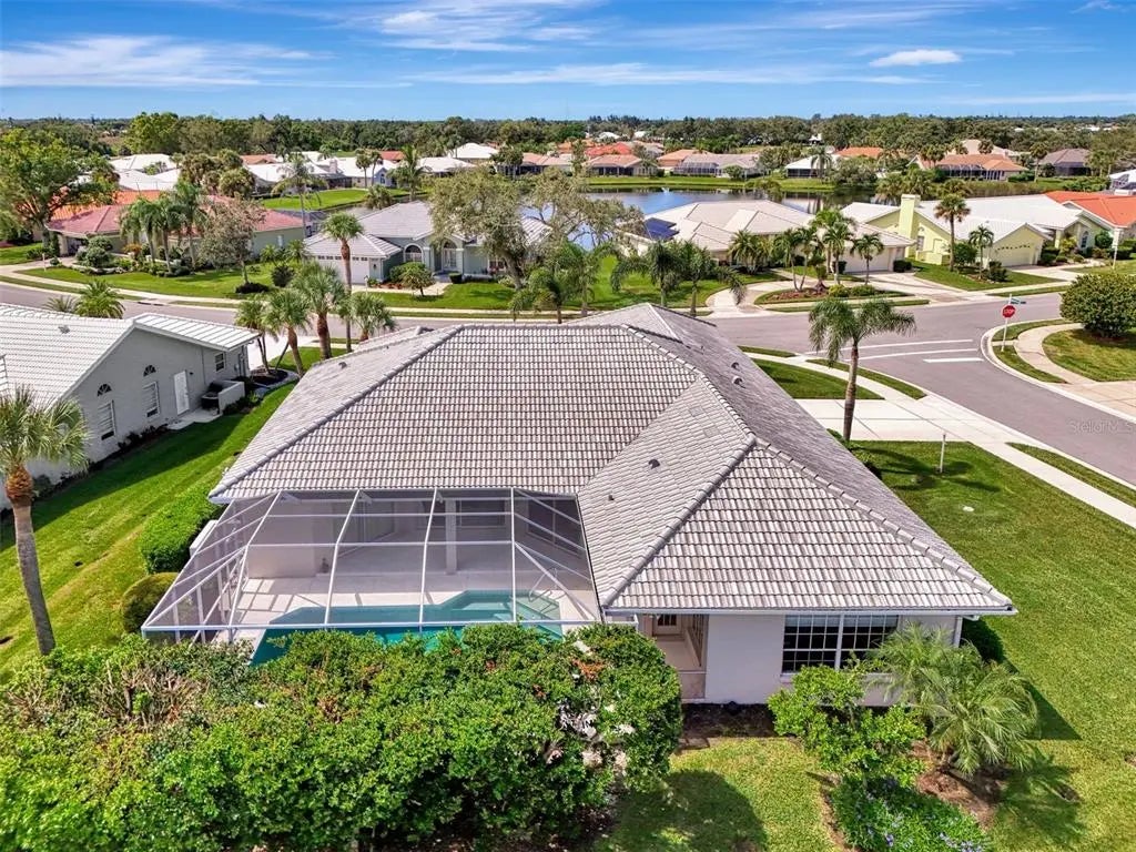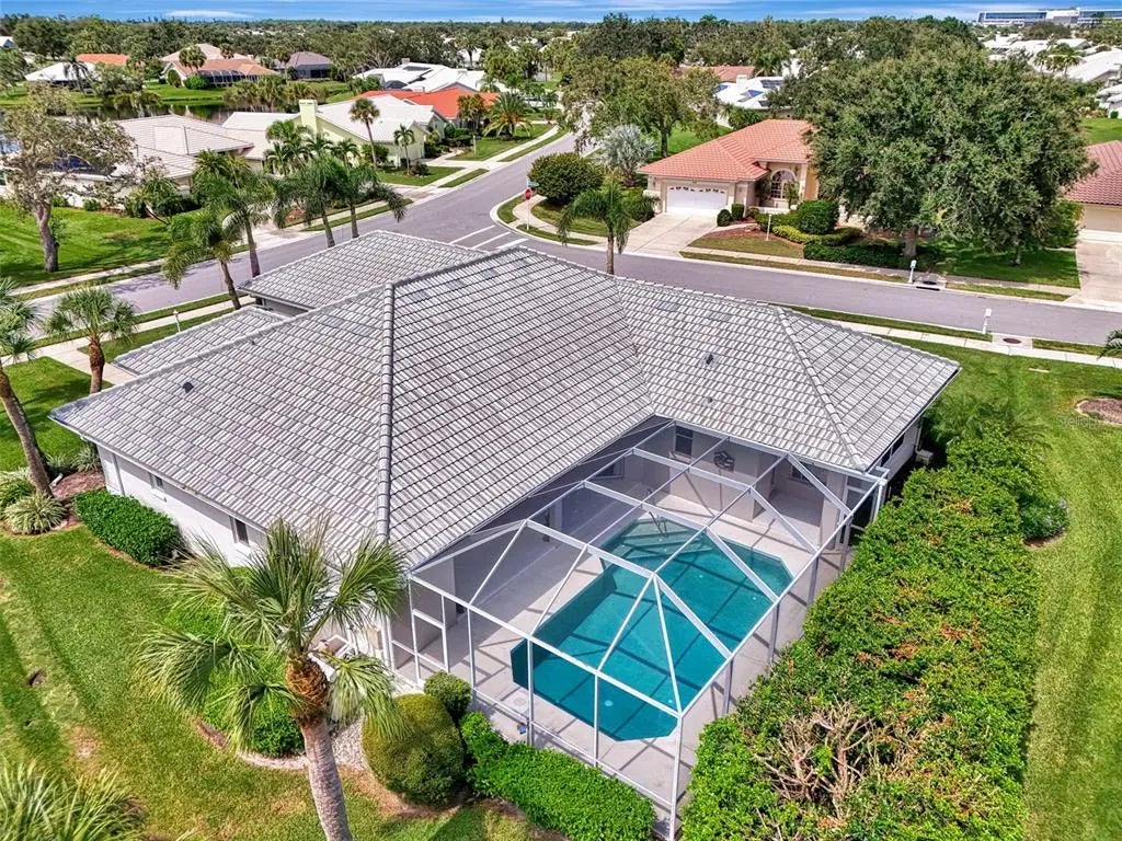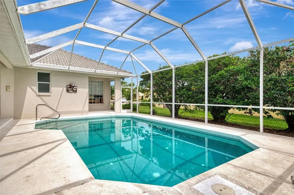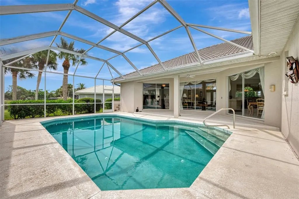 Attractive two bedroom, three bath, pool home, with golf course and water views. The home looks out onto the 7th hole of the Gleneagles course, in the highly desirable, Waterford Golf Community. The home features a gourmet kitchen, with center island, breakfast bar, Corian counters, a Viking double oven and a propane gas stove. There is a large eating area/breakfast nook looking out onto your pool. There is also a formal dining room. The large family room has French doors and could be used as a mother-in law suite with its attached full bath. The master bedroom has sliders out to the pool and two walk-in closets. The garage is an oversize two-car at 768 square feet. The home is being sold partially furnished. The roof was replaced in 2022 and the AC system was replaced in 2021. Be a part of this great community where golf membership on the 27 hole championship course is voluntary. The Waterford community amenities include a large heated pool and spa, clubhouse, fitness room and tennis courts. New pickleball courts are coming very soon! Come and see this beautiful home today!