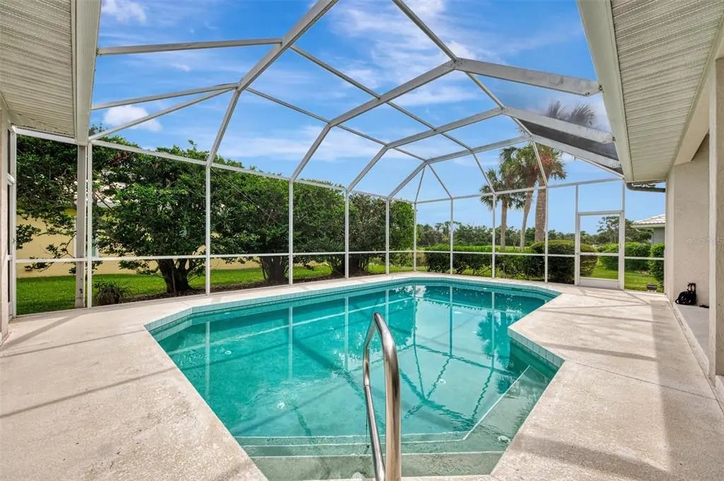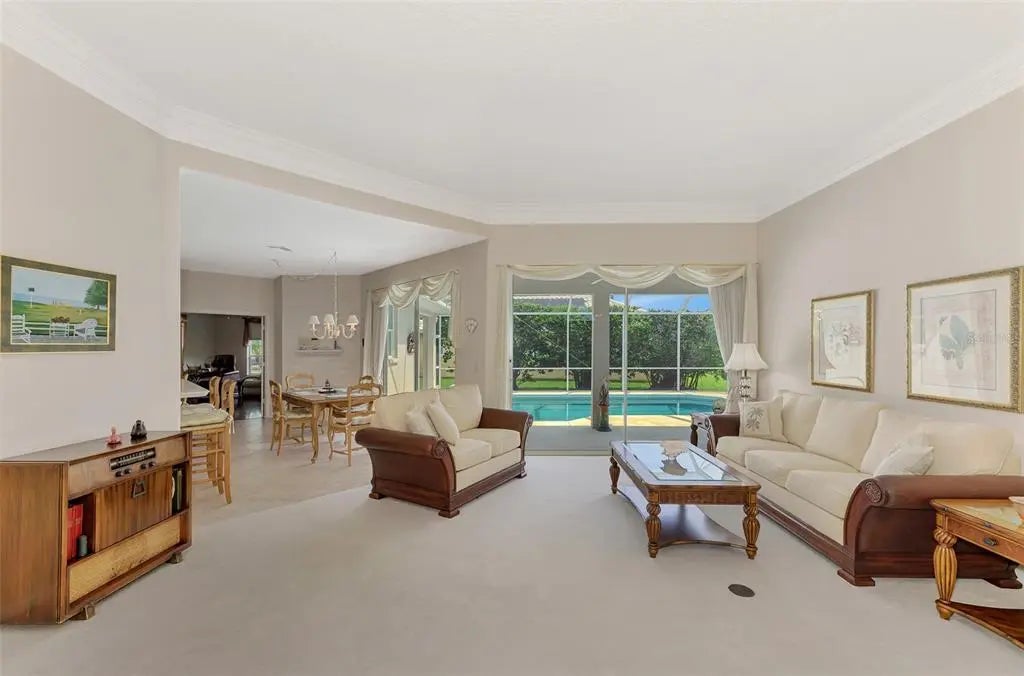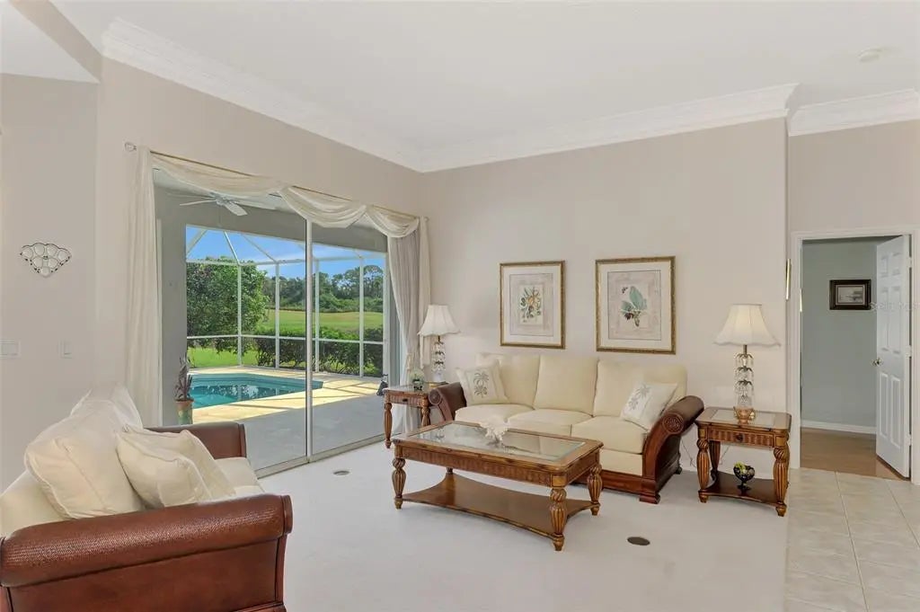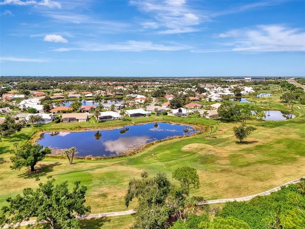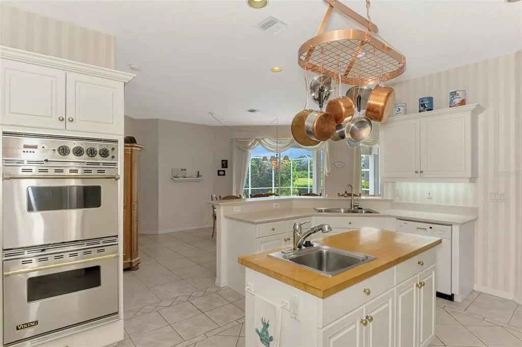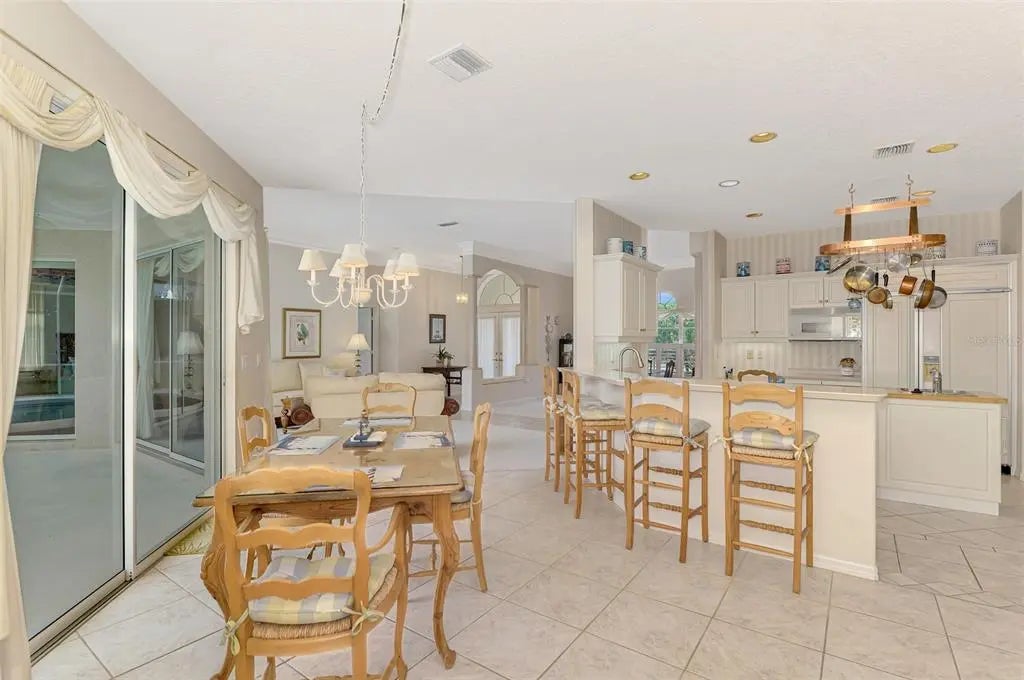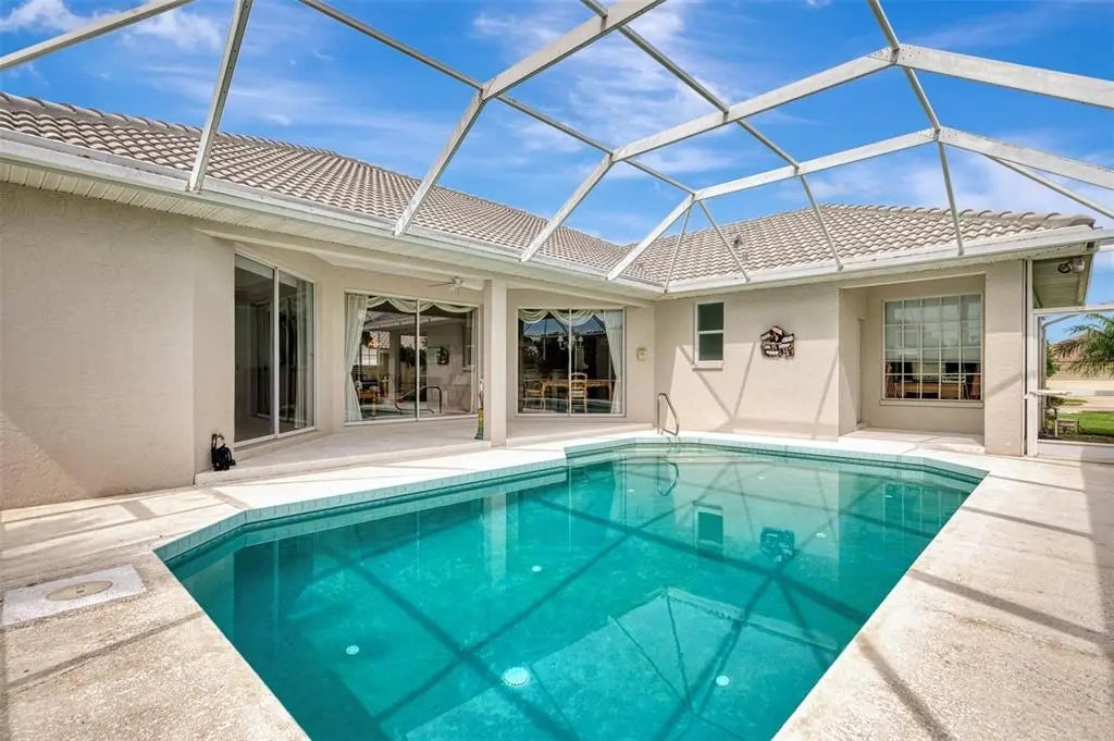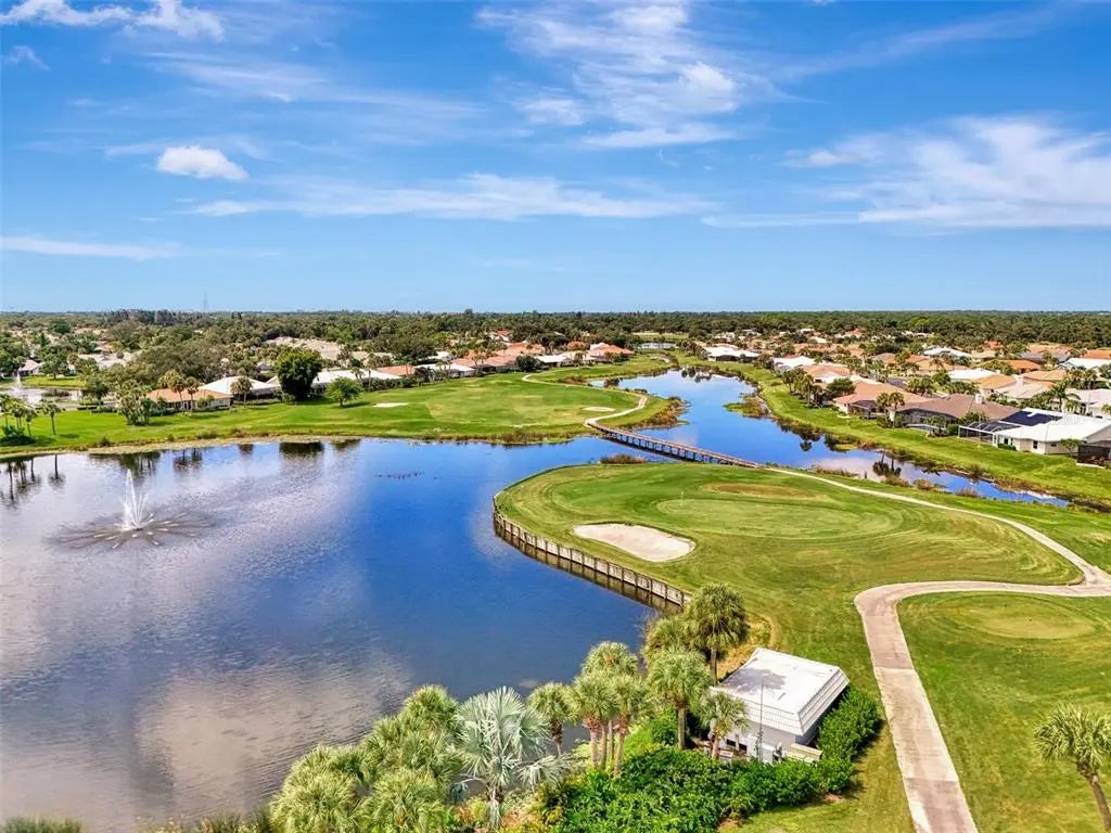 Attractive two bedroom, three bath, pool home, with golf course and water views. The home looks out onto the 7th hole of the Gleneagles course, in the highly desirable, Waterford Golf Community. The home features a gourmet kitchen, with center island, breakfast bar, Corian counters, a Viking double oven and a propane gas stove. There is a large eating area/breakfast nook looking out onto your pool. There is also a formal dining room. The large family room has French doors and could be used as a mother-in law suite with its attached full bath. The master bedroom has sliders out to the pool and two walk-in closets. The garage is an oversize two-car at 768 square feet. The home is being sold partially furnished. The roof was replaced in 2022 and the AC system was replaced in 2021. Be a part of this great community where golf membership on the 27 hole championship course is voluntary. The Waterford community amenities include a large heated pool and spa, clubhouse, fitness room and tennis courts. New pickleball courts are coming very soon! Come and see this beautiful home today!