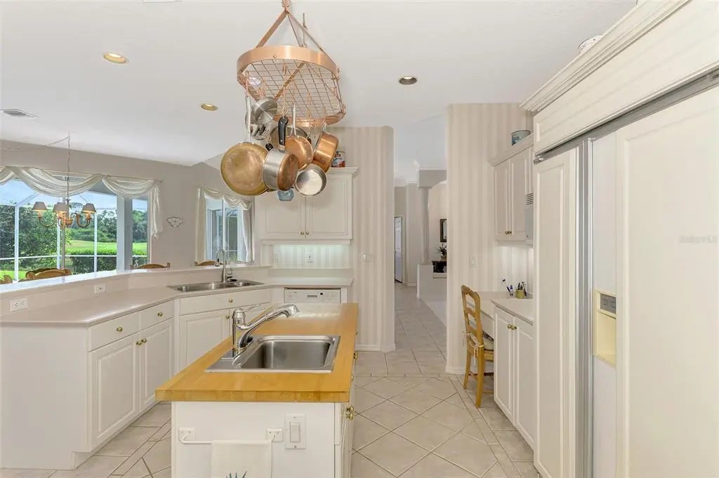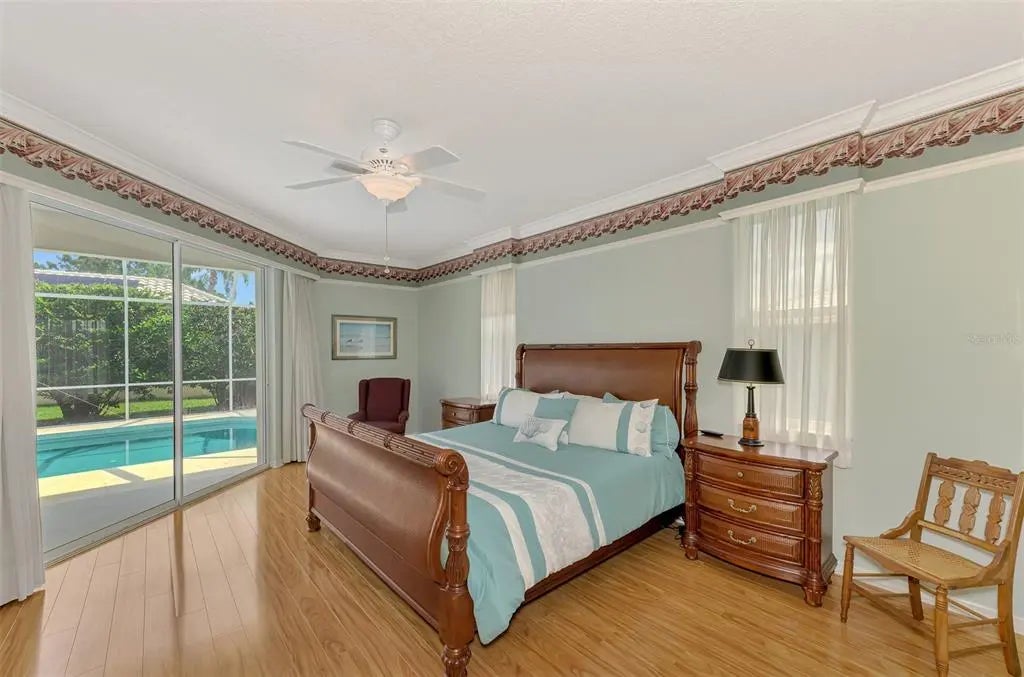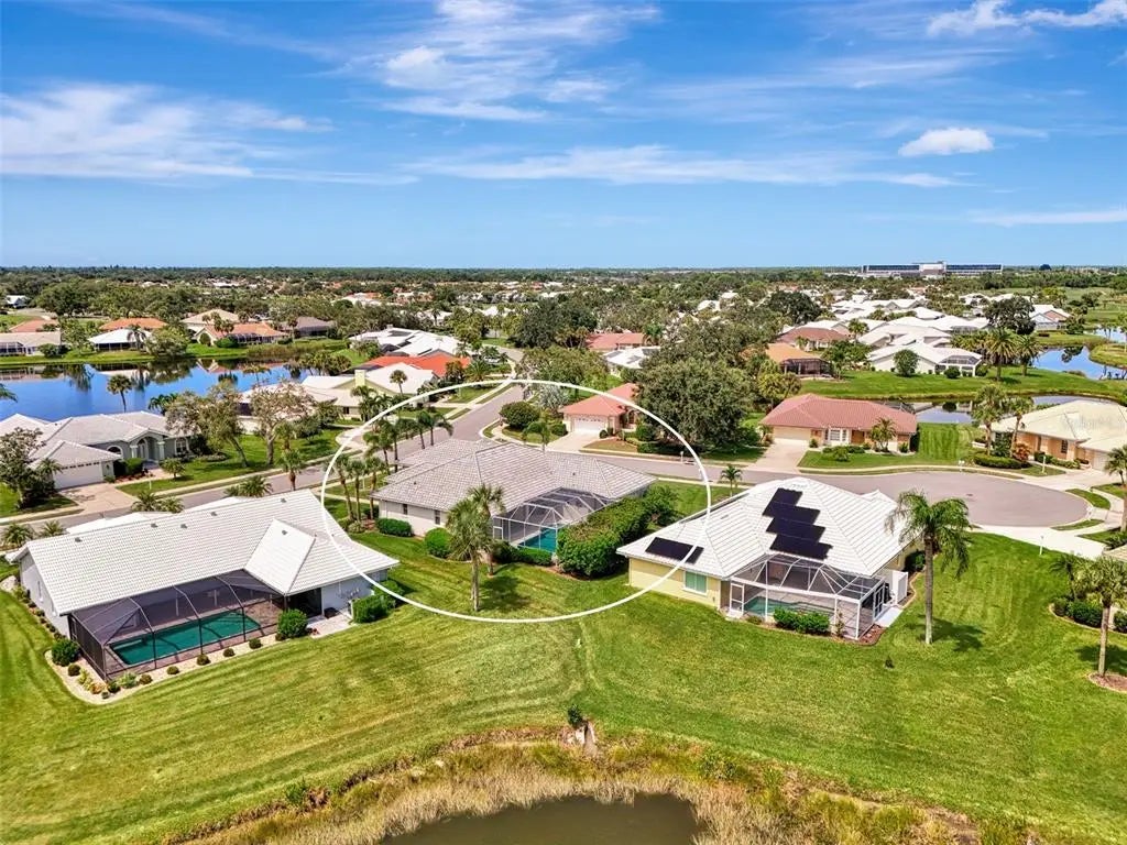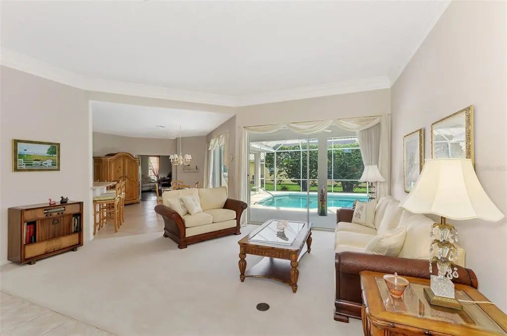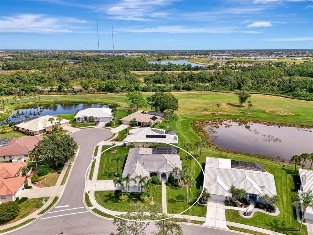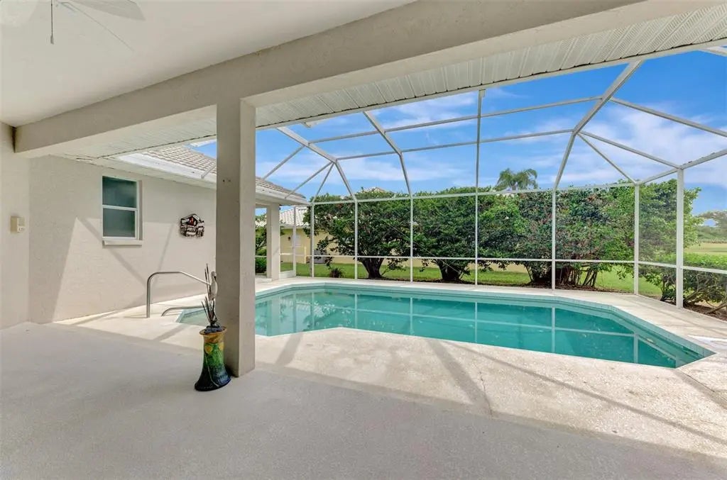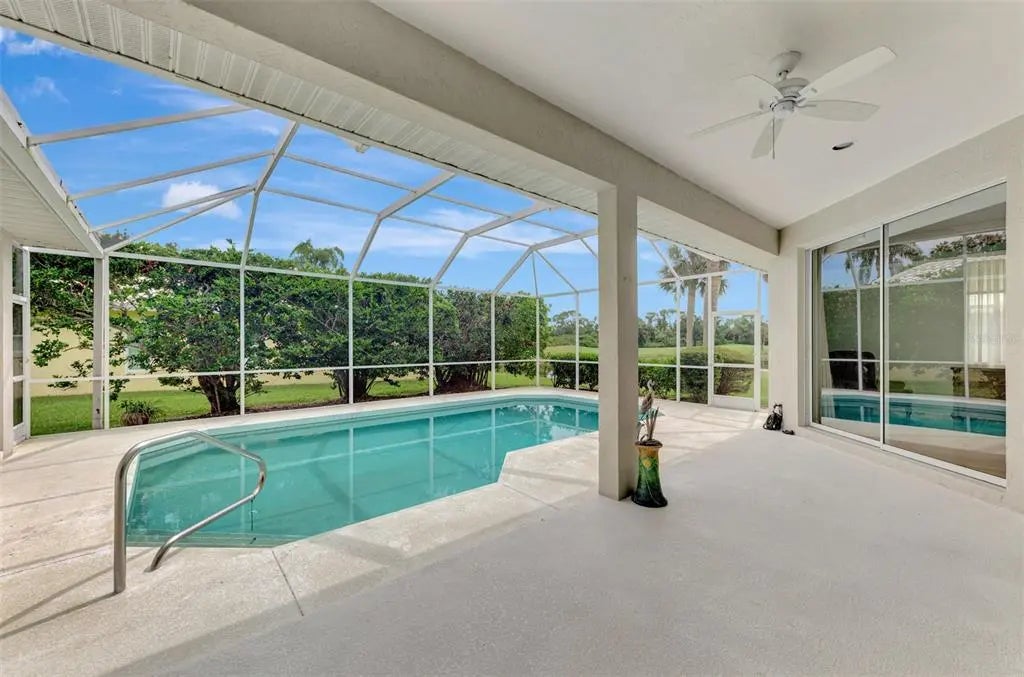 Attractive two bedroom, three bath, pool home, with golf course and water views. The home looks out onto the 7th hole of the Gleneagles course, in the highly desirable, Waterford Golf Community. The home features a gourmet kitchen, with center island, breakfast bar, Corian counters, a Viking double oven and a propane gas stove. There is a large eating area/breakfast nook looking out onto your pool. There is also a formal dining room. The large family room has French doors and could be used as a mother-in law suite with its attached full bath. The master bedroom has sliders out to the pool and two walk-in closets. The garage is an oversize two-car at 768 square feet. The home is being sold partially furnished. The roof was replaced in 2022 and the AC system was replaced in 2021. Be a part of this great community where golf membership on the 27 hole championship course is voluntary. The Waterford community amenities include a large heated pool and spa, clubhouse, fitness room and tennis courts. New pickleball courts are coming very soon! Come and see this beautiful home today!