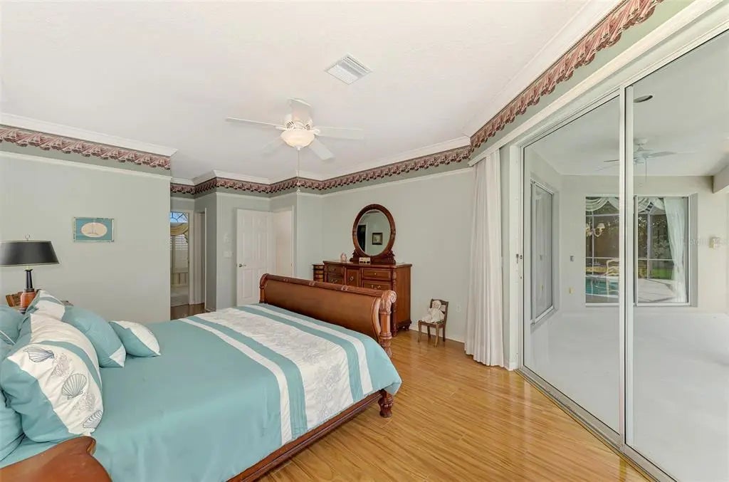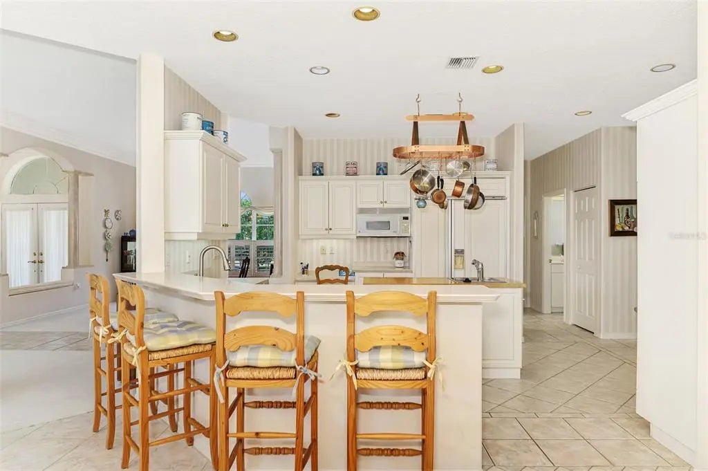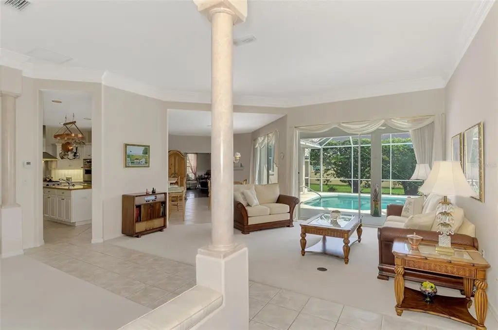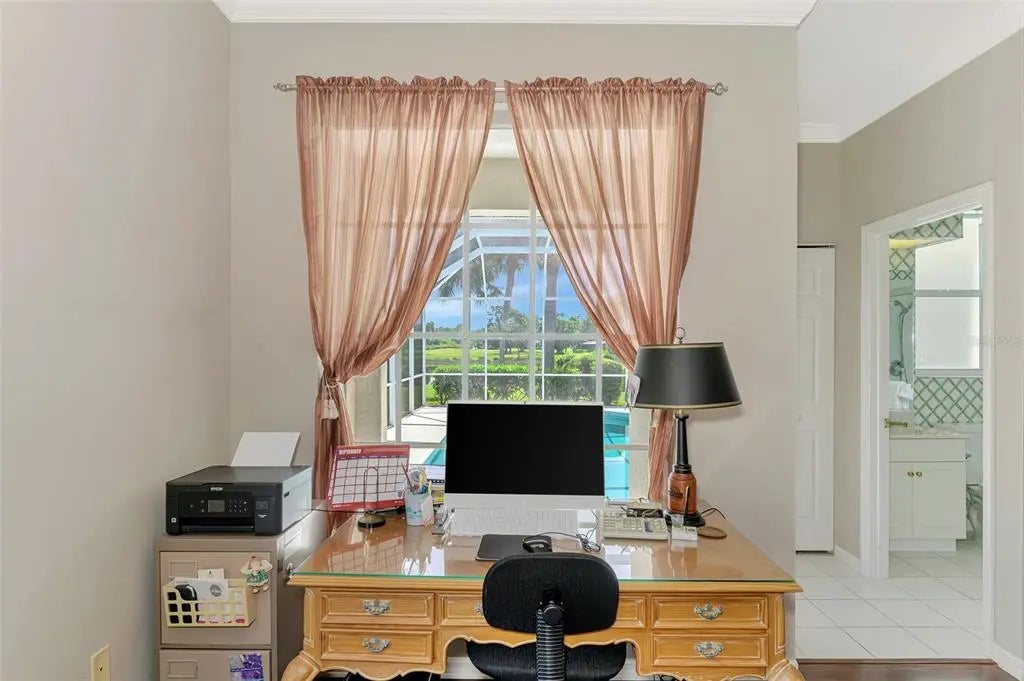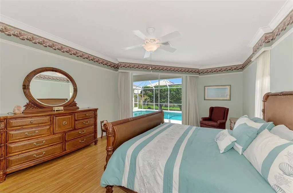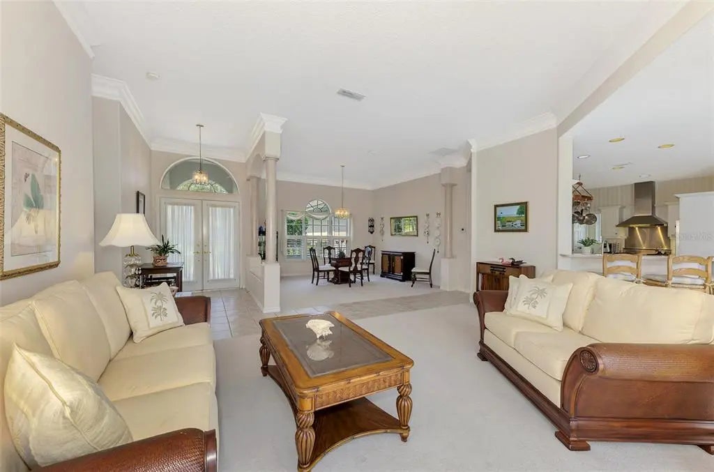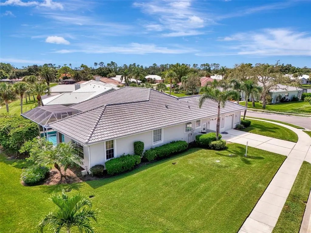 Attractive two bedroom, three bath, pool home, with golf course and water views. The home looks out onto the 7th hole of the Gleneagles course, in the highly desirable, Waterford Golf Community. The home features a gourmet kitchen, with center island, breakfast bar, Corian counters, a Viking double oven and a propane gas stove. There is a large eating area/breakfast nook looking out onto your pool. There is also a formal dining room. The large family room has French doors and could be used as a mother-in law suite with its attached full bath. The master bedroom has sliders out to the pool and two walk-in closets. The garage is an oversize two-car at 768 square feet. The home is being sold partially furnished. The roof was replaced in 2022 and the AC system was replaced in 2021. Be a part of this great community where golf membership on the 27 hole championship course is voluntary. The Waterford community amenities include a large heated pool and spa, clubhouse, fitness room and tennis courts. New pickleball courts are coming very soon! Come and see this beautiful home today!
