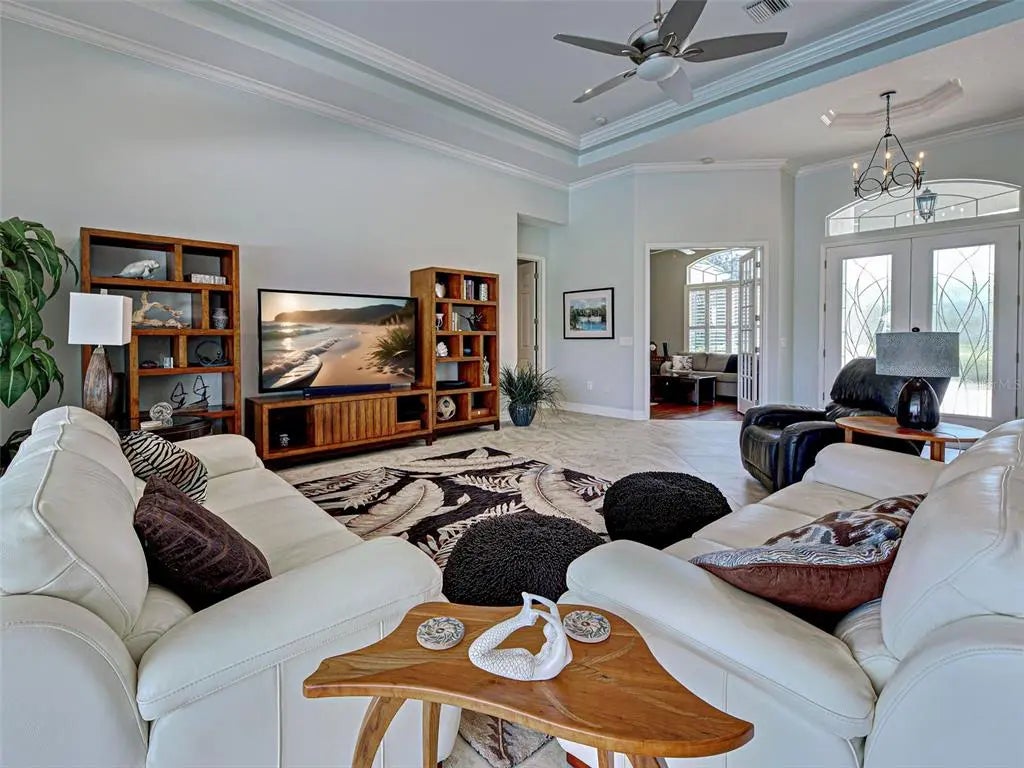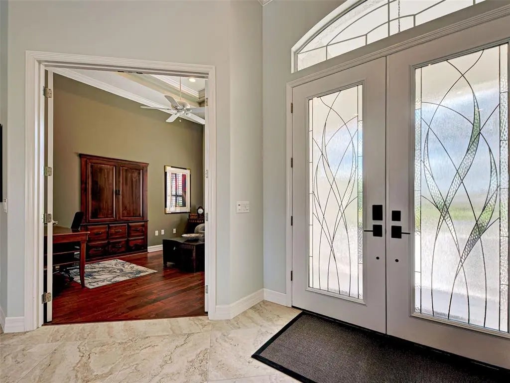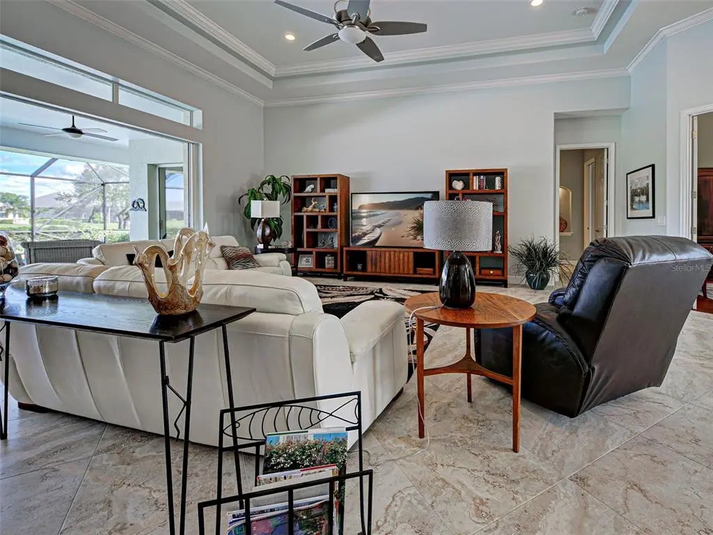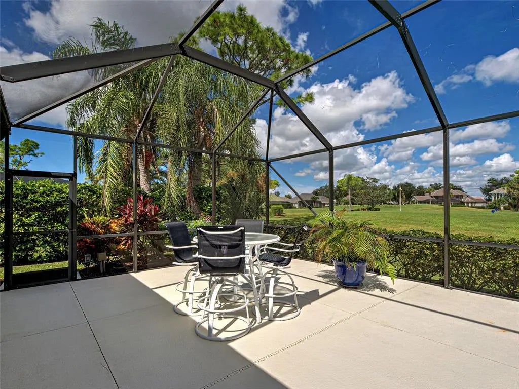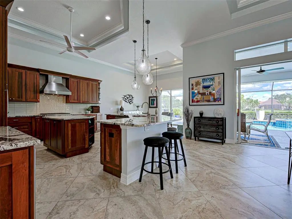You need to see The Reserve at The Plantation Golf and Country Club to appreciate how special a private gated community can be. Seventy-three custom homes nicely laced among the fairways and lakes of the Panther golf course, which is one of two championship courses at The Plantation and annual host of the LPGA qualifier tournament each October. This home overlooks the 8th tee with fairway and water views. Come watch these fantastic women athletes from ease of your own pool side chair. New roof completed 11/08/2025. The home was extensively remodeled in 2022 offering a fantastic great room concept that brings open air Florida living at its best. The property offers 3 bedrooms and 3 baths in a split wing design allowing both owner and guest privacy. Each wing and the great room have its own HVAC, all recently replaced. The home features 13’ double tray ceilings that give tremendous volume and light. New 24” tile flooring adds to the brightness and flow, running throughout the home except for the bedrooms and den. The remodeled kitchen and bathrooms all feature bronze-stained cherry cabinets and beautiful matching granite counters and accents. The kitchen is a double island design featuring built in oven, oven/microwave, gas cooktop, high power range hood, dish washer, wine cooler, and refrigerator. All stainless and new in 2022. Just off the kitchen is a remodeled laundry with additional pantry and storage space, a second refrigerator, washer, dryer, and sink area with the same matching granite. There are both formal and casual dining areas as well as kitchen island seating for 6 or more. A nice sized den/office area features wood flooring and built in cabinet and 6 file drawers. The primary bedroom suite also features the high tray ceilings and a pool side view. Dual closets with built in shelving lead to an elegant bath with two sinks set in 14’ of beautiful granite and cabinets. The large walk-in shower has a rain shower option to enjoy. In the guest wing you will find two bedrooms that easily handle king size beds. One bedroom has an ensuite bath/shower while the second bedroom is adjacent to the third bath. All can be closed off from the main house for privacy. All bathrooms have newly tiled showers and hardware. Outside living at its best with this expansive lanai. There is a 24x10 seating area just off the living room. A cabana that has grill, pot burner, exhaust hood, mini fridge, sink with disposal, and a bar counter for two. The approx. 30x12 pool and spa was resurfaced in 2024 along with a new heater. The three-car garage is spacious and has many built in cabinets. There is additional storage above the garage. The home has plantation shutters, central vac, on-demand circulating hot water, an in floor safe, and all new interior lighting. A whole house generator was added in 2024 for additional storm protection. Residents can take advantage of optional membership at the Plantation Golf and Country Club which offers an array of resort amenities, dining, and social events. All this is located just minutes from Venice’s Gulf beaches, the Atlanta Braves Spring Training Stadium, shopping, dining, and easy access to I75. See https://www.thereserveatpgcc.com for general information