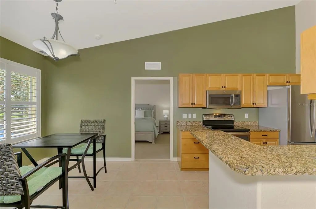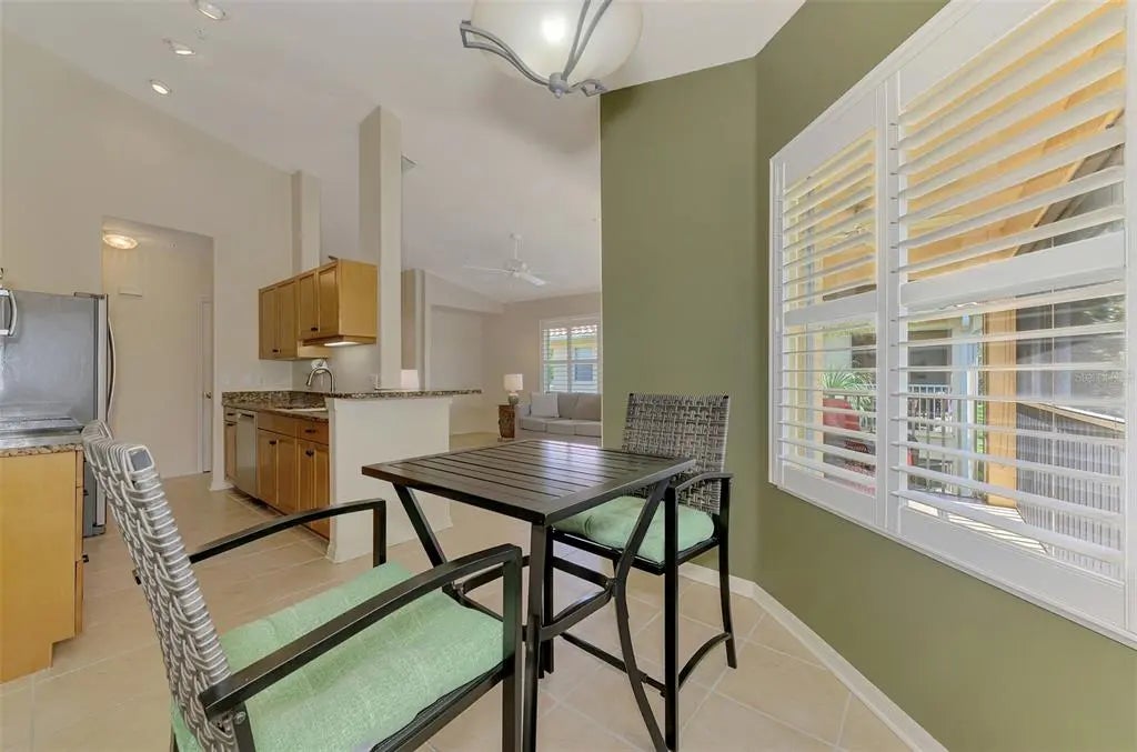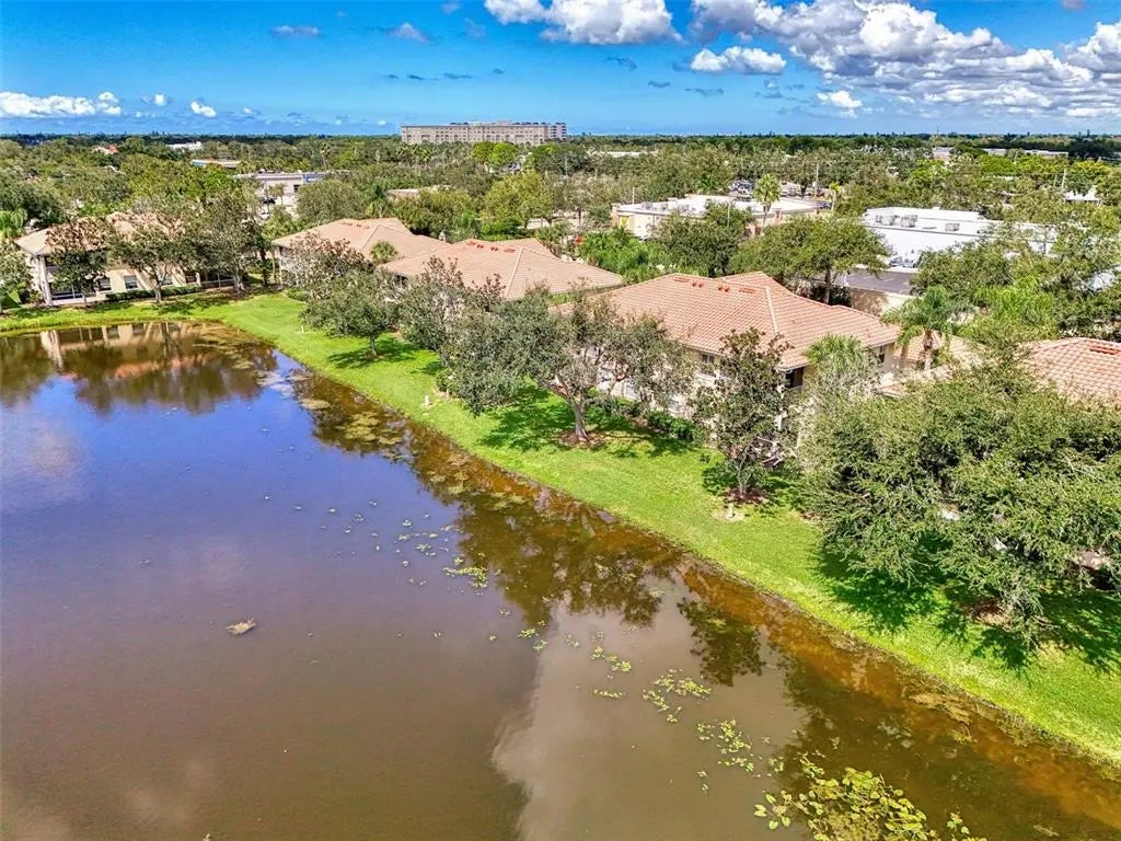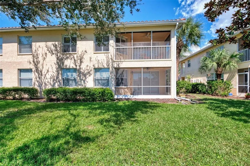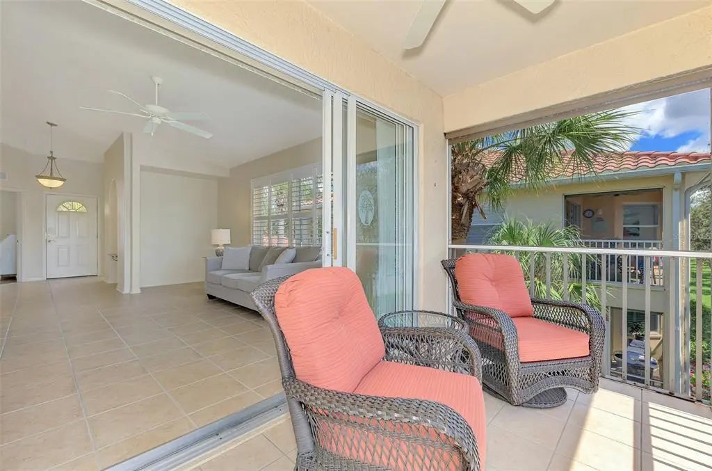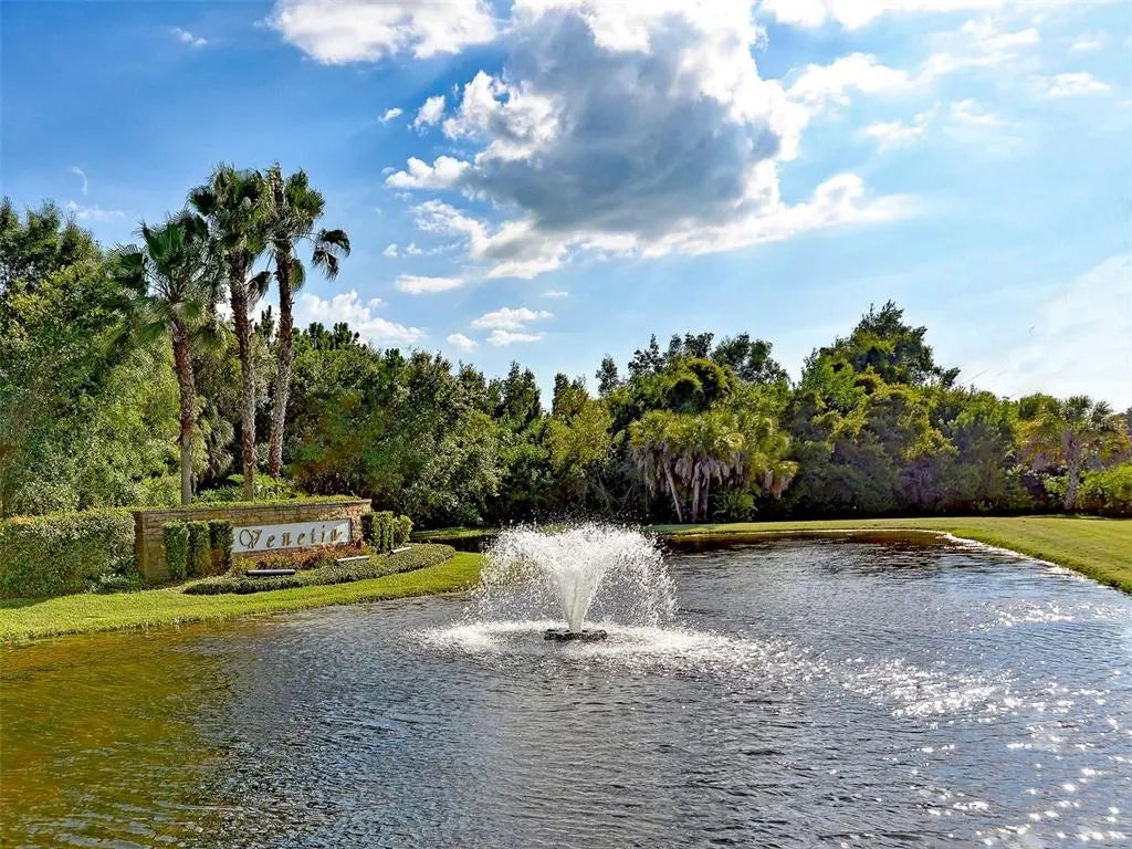 Now is your opportunity to own this Top Floor End Unit condo is Casa di Amici located in the highly sought after gated community of Venetia. This condo is flooded with tons of natural light and boasts 3 bedrooms, 2 bathrooms, a 1 car detached garage and a beautiful South facing water view. There is a large front porch with upgraded storm door that allows you to keep the front door open and enjoy the cross breeze through the unit throughout the day. Being sold partially furnished, this condo enjoys tile in all of the main living areas, plantation shutters on the windows throughout the unit, luxury vinyl plank flooring in the 2 guest bedrooms, and tons of storage. The unit features high ceilings and a kitchen with sparkling granite countertops and stainless steel appliances, including a Bosch dishwasher. The primary suite features two closets with built-in closet systems, a walk-in shower, dual sink vanity, and a separate water closet for privacy. The second bedroom is on the front of the unit and enjoys total privacy located in its own hallway, with a second full bathroom for convenience. The third bedroom is just off the foyer and can easily be used as a home office or den. There is an in-unit laundry room with utility sink and a Brand New Hot Water Heater that was just replaced in June 2025. The screened lanai has custom fit sunshades, and the view will bring you hours of peace and enjoyment as you overlook the largest pond in the community. With a prime location, you will find yourself close to area shopping, several local beaches, and just a short drive to both Historic downtown Venice and the new town center of Wellen Park! Casa di Amici at Venetia is a private gated community with clubhouse, pool, fitness center, tennis courts, and so much more! If you have been dreaming of owning a piece of Florida's paradise, this is the condo for you!