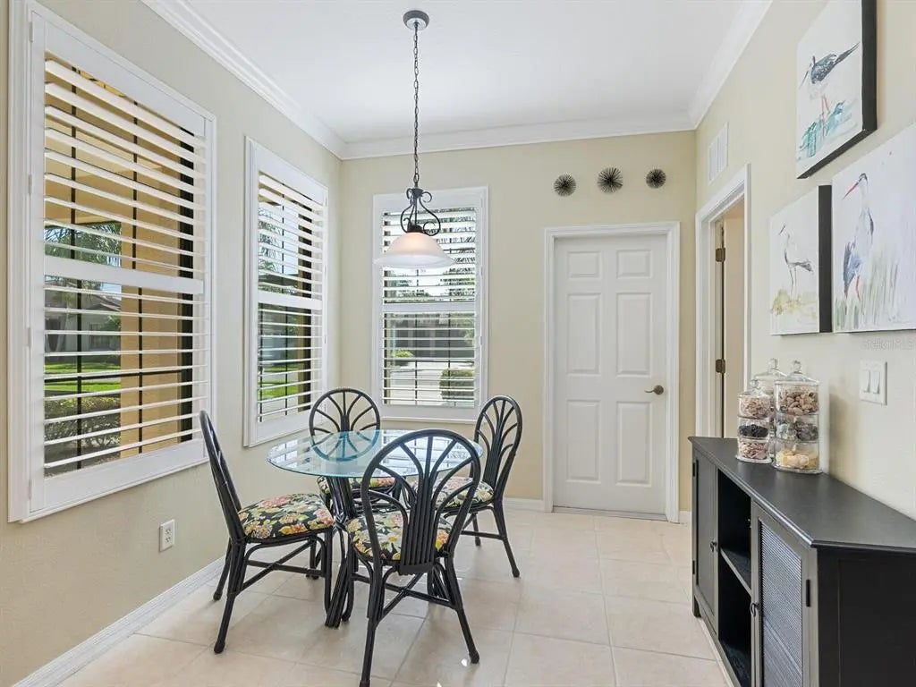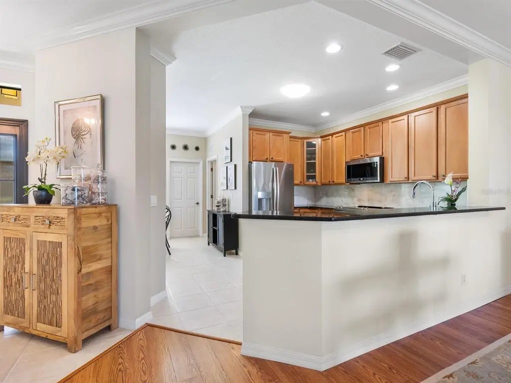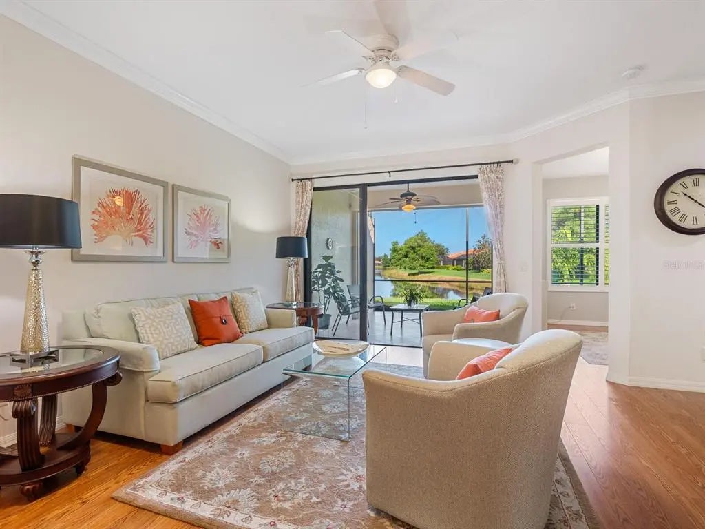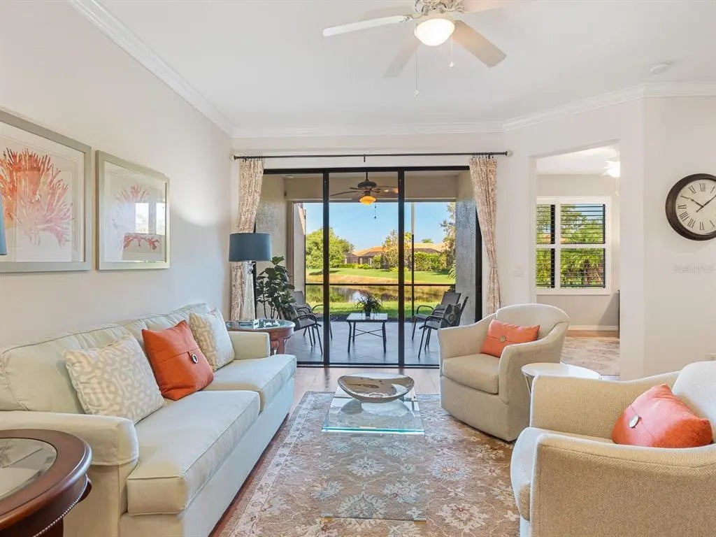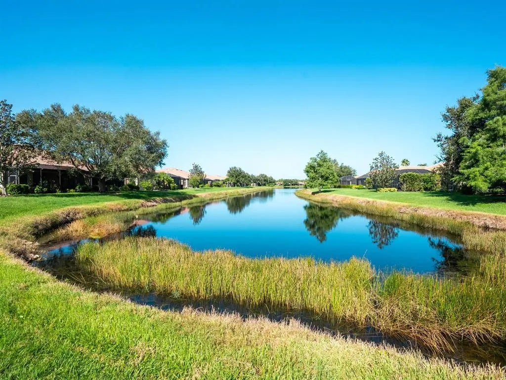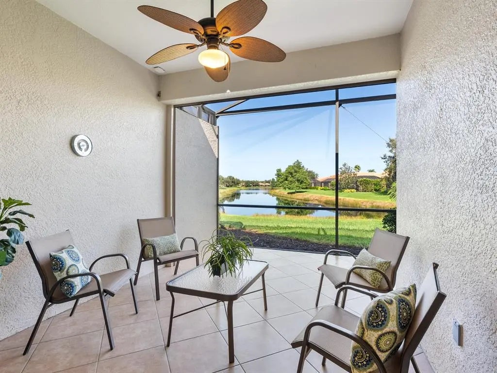 Under contract-accepting backup offers. Experience resort-style living at Venetian Falls in this immaculate Botticelli paired-villa! Located in an active, gated, 55+ community, this home offers peace of mind with impact windows and front door, reinforced garage door, and storm shield for the lanai—all providing extra protection and energy efficiency. Enjoy relaxing or dining outdoors on your lanai overlooking the serene, long lake views. Inside, the kitchen offers a bright, open layout with stainless steel appliances, granite countertops, 42” wood cabinets, skylight, dinette, and pantry. Further features include a screened front entry and sitting area, updated primary suite, crown molding, plantation shutters, skylight in the living room, and wood laminate floors in the main living areas, den, and guest bedroom. The oversized 2-car garage has a durable polyaspartic garage floor finish adding a clean look and ease of maintenance. Meticulously maintained and boasting excellent curb appeal, this villa is truly move-in ready. Venetian Falls offers resort-style amenities including a clubhouse with full-time activity director, heated lap pool, heated resistance pool, fitness center, billiards, bocce, on-site management, and so much more! The HOA fee covers lawn care and front shrub trimming, irrigation, roof cleaning, exterior paint, internet, and basic cable. Don't miss out on this beautiful, worry-free home in a gated community just minutes from Venice beaches, dining, and shopping!