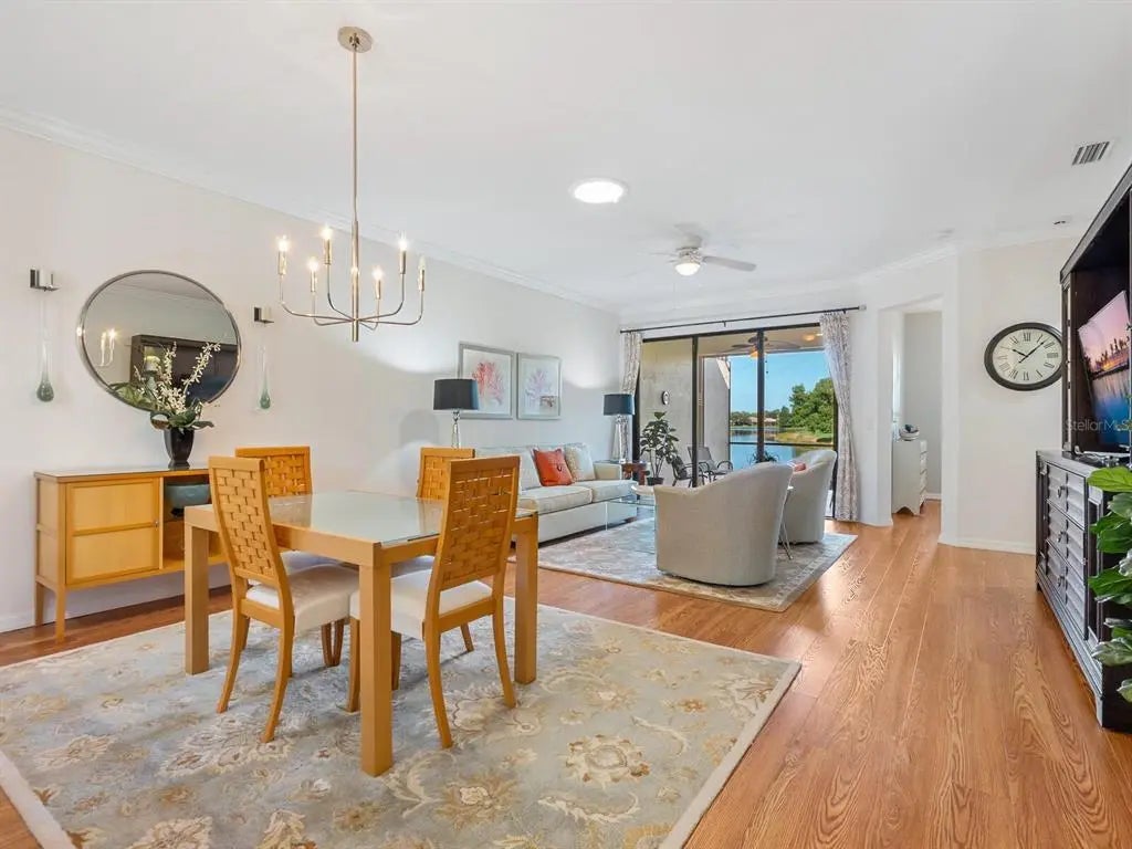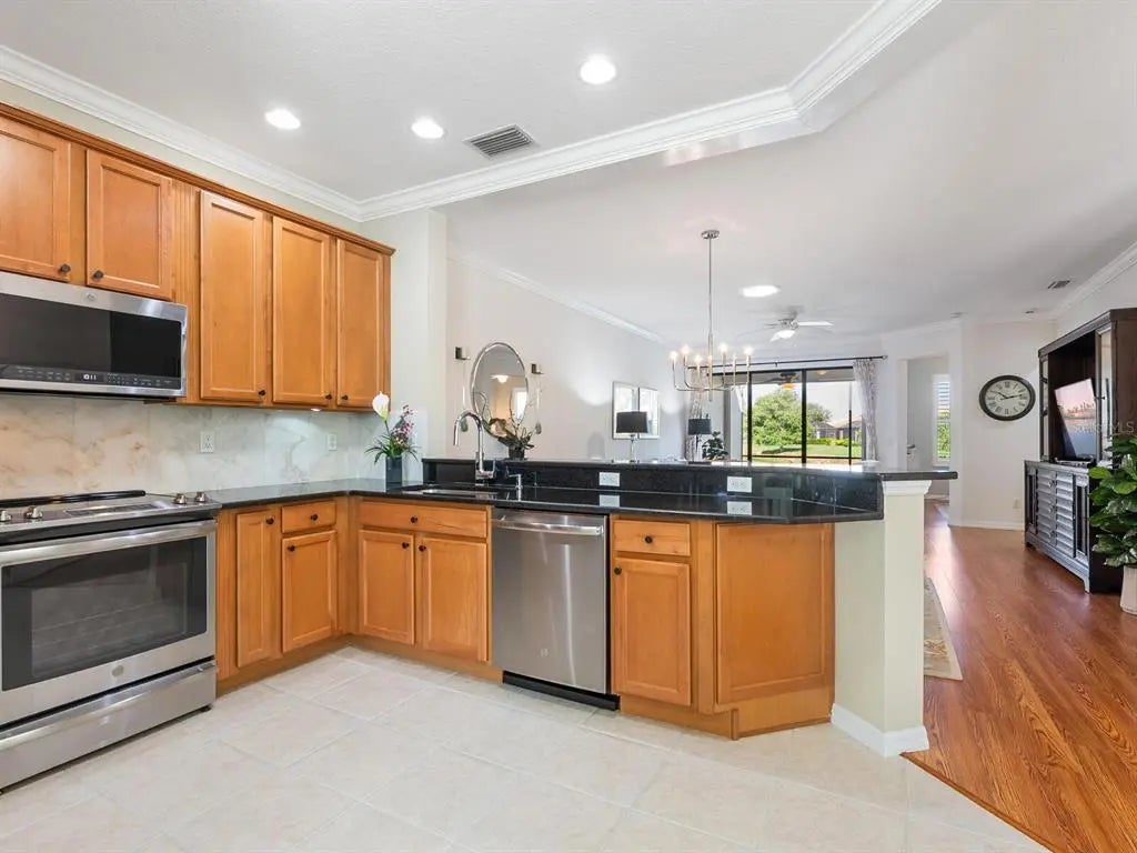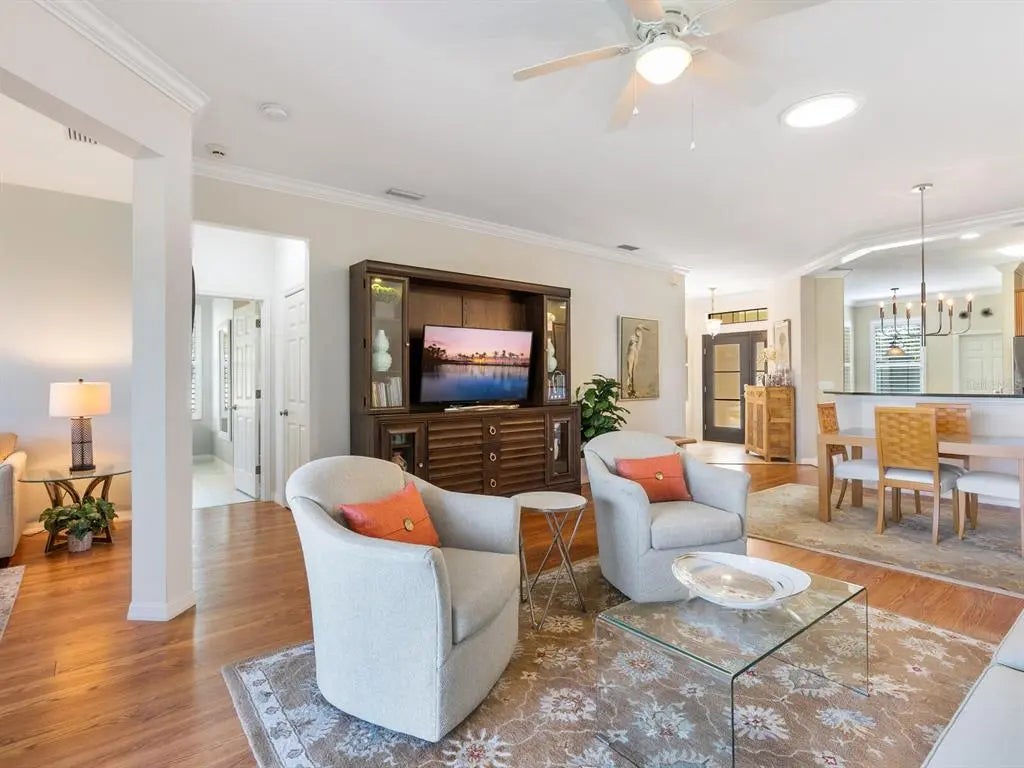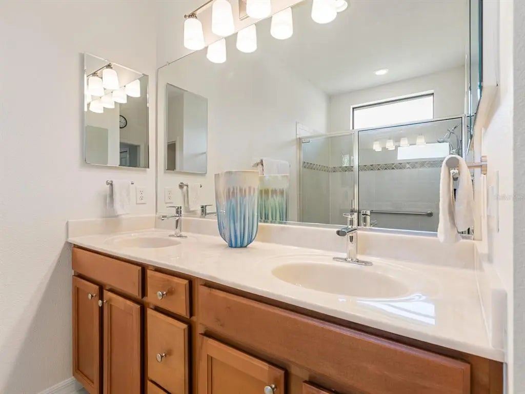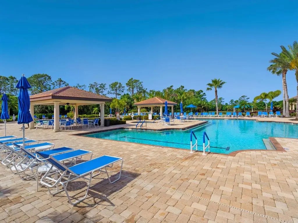 Under contract-accepting backup offers. Experience resort-style living at Venetian Falls in this immaculate Botticelli paired-villa! Located in an active, gated, 55+ community, this home offers peace of mind with impact windows and front door, reinforced garage door, and storm shield for the lanai—all providing extra protection and energy efficiency. Enjoy relaxing or dining outdoors on your lanai overlooking the serene, long lake views. Inside, the kitchen offers a bright, open layout with stainless steel appliances, granite countertops, 42” wood cabinets, skylight, dinette, and pantry. Further features include a screened front entry and sitting area, updated primary suite, crown molding, plantation shutters, skylight in the living room, and wood laminate floors in the main living areas, den, and guest bedroom. The oversized 2-car garage has a durable polyaspartic garage floor finish adding a clean look and ease of maintenance. Meticulously maintained and boasting excellent curb appeal, this villa is truly move-in ready. Venetian Falls offers resort-style amenities including a clubhouse with full-time activity director, heated lap pool, heated resistance pool, fitness center, billiards, bocce, on-site management, and so much more! The HOA fee covers lawn care and front shrub trimming, irrigation, roof cleaning, exterior paint, internet, and basic cable. Don't miss out on this beautiful, worry-free home in a gated community just minutes from Venice beaches, dining, and shopping!
