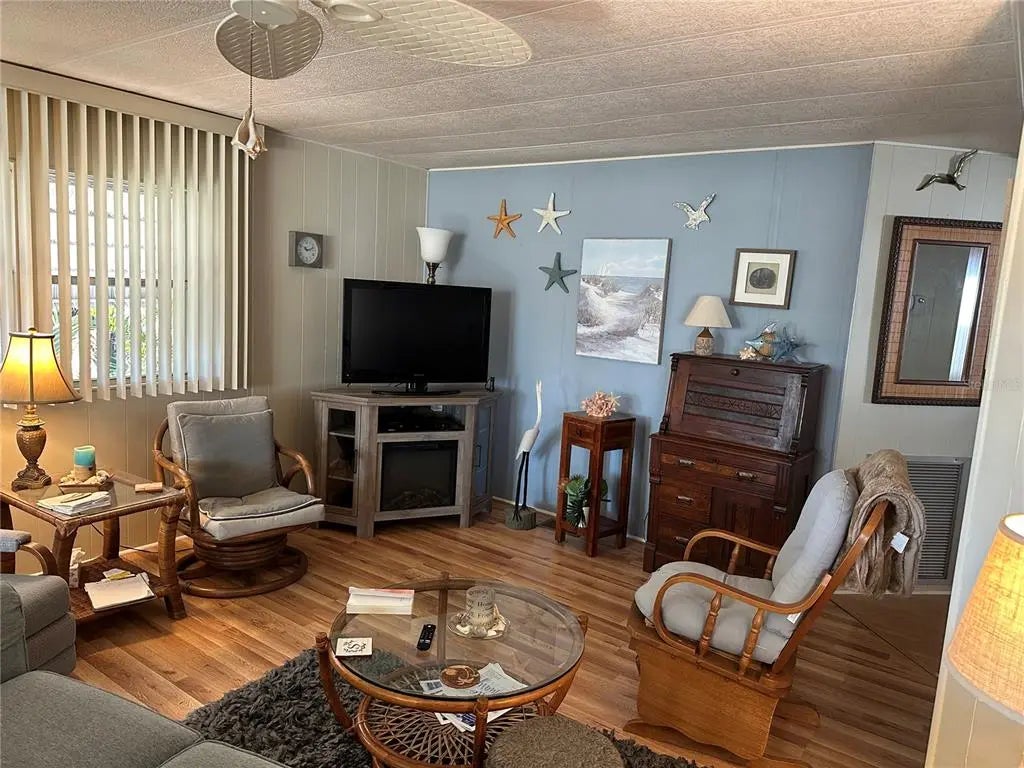 A two bedroom, two bathroom doublewide unit, ready to move in! You only need your suitcases for this furnished home! The home features laminate flooring throughout with tile in the bathrooms. The primary bedroom is large with an en-suite bathroom and walk-in closet. The guest room and bathroom are also very spacious. The circular kitchen give plenty of counter and cabinet space. The dining room features wonderful built in cabinetry. One of the best features of the home is the enclosed Florida room. With many windows and tons of natural light, it is the most used spot in the house! Outside you will find an extra long driveway that allows space for seating. There are also two sheds. Around the back is an outdoor shower! This home is located in Japanese Gardens, an active, resident owned 55+ community with many amenities such as pickleball, bocce, and pickleball courts. There is also a beautiful resort style pool and spa, a large clubhouse, and an activity room with billiards tables and a library! The community is the perfect location - about 1 mile to Manasota Beach!