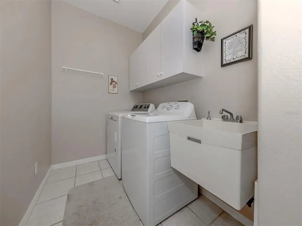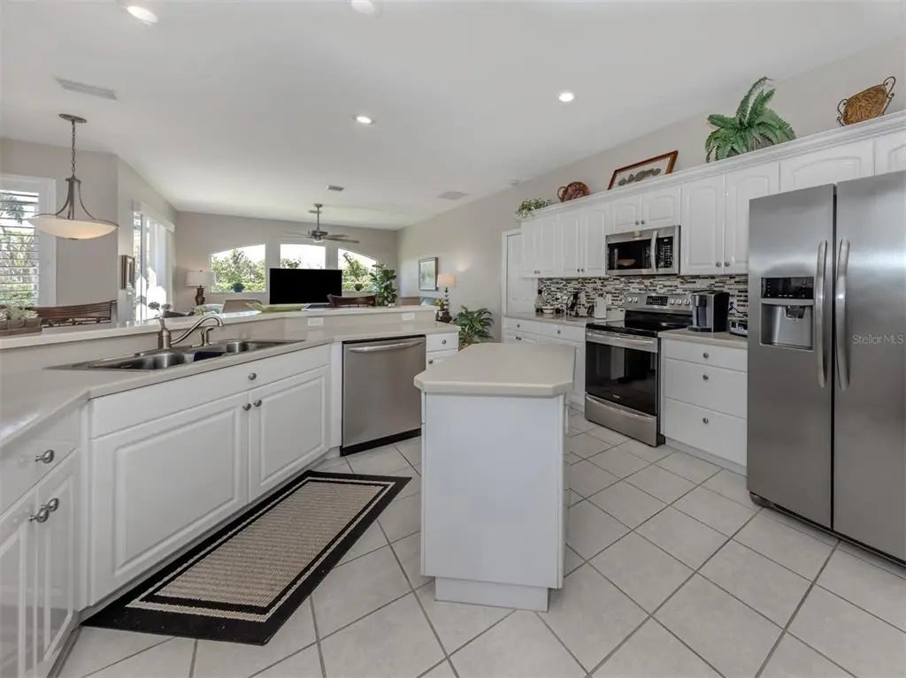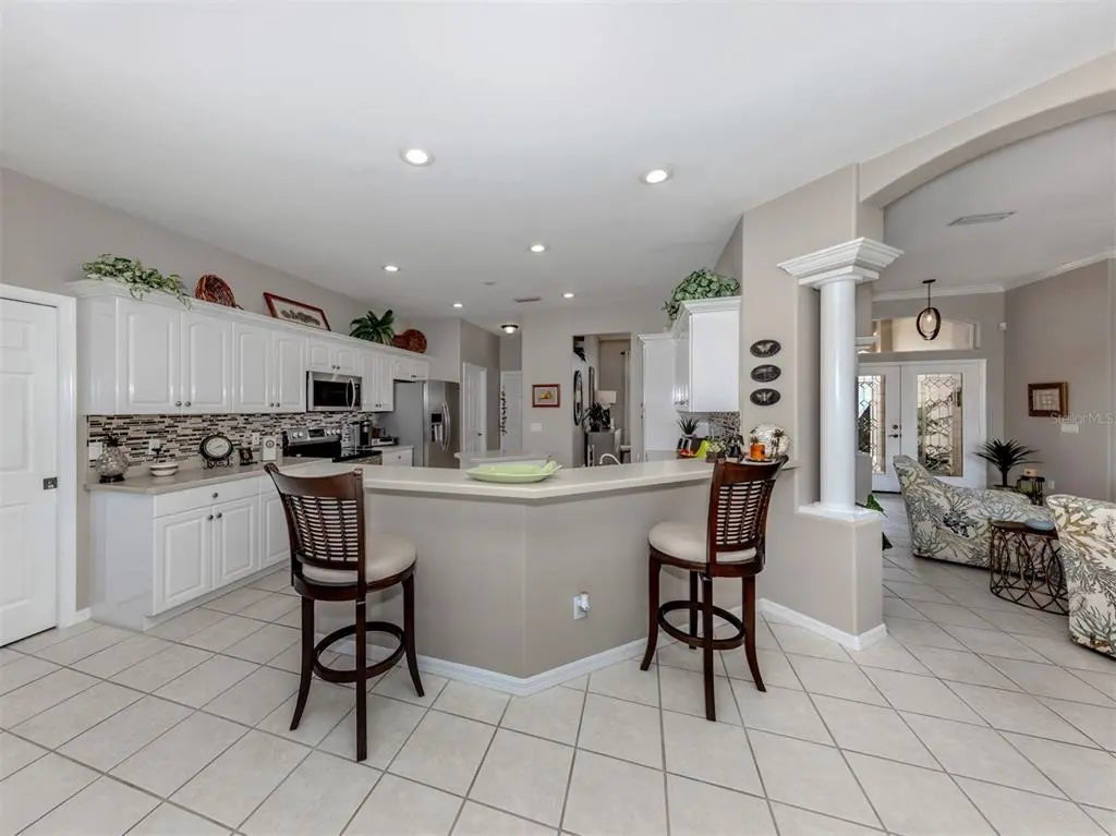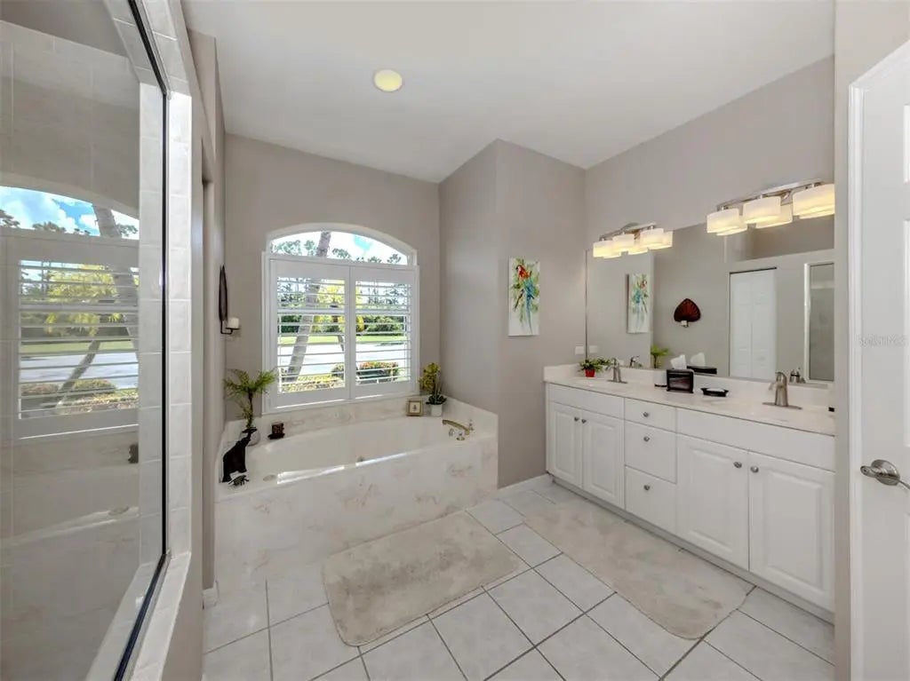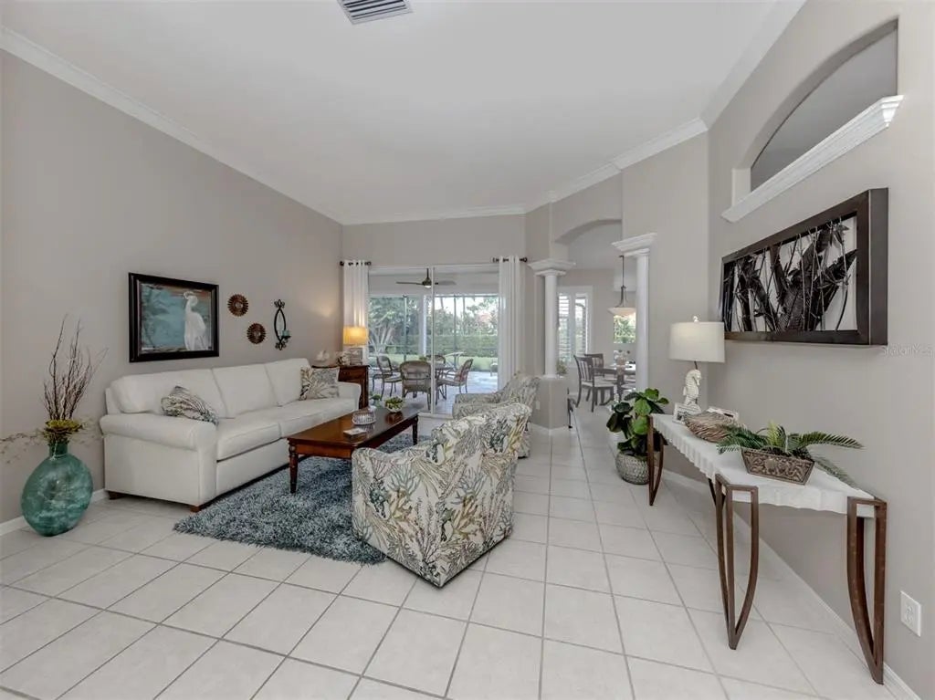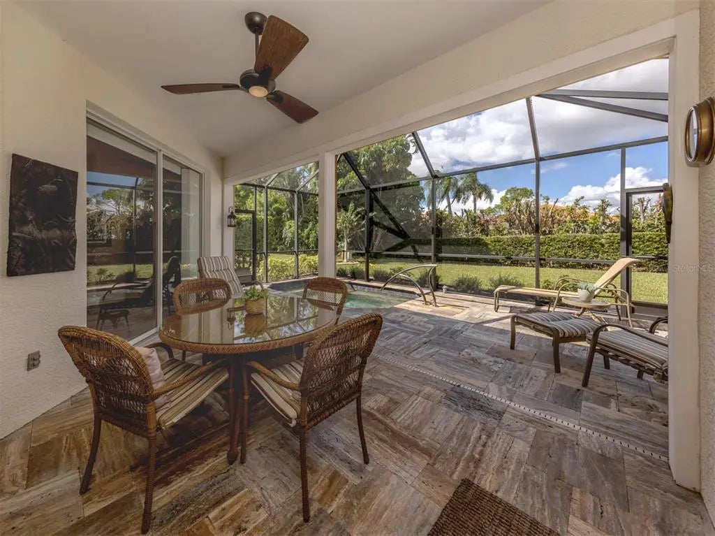 Welcome to your private retreat tucked away on a peaceful cul-de-sac in the highly sought-after Stonecastle at Southwood community. This beautifully maintained home combines comfort, style, and functionality in a setting designed for relaxed Florida living. A large screened-in entryway set the tone for the inviting interior, where tile flooring with a decorative border in the dining area complements the home’s fresh, welcoming atmosphere. From the moment you enter, your eyes are drawn to the sliding glass doors leading to the expansive screened lanai - an outdoor oasis featuring a stunning travertine-tiled deck and an impressive 8’ x 13’ heated in-ground SPA with 3.5’ water depth and seating for eight. Inside, thoughtful upgrades and timeless details are found throughout, including brand new carpeting (7/2025), ceiling fans in every room and elegant Plantation shutters on the windows. The brand-new roof (2025) offers peace of mind for many years to come, while updated light fixtures add modern appeal, and the interior paint (2018) keeps the home bright and inviting. The kitchen offers Corian countertops, a breakfast bar, an island, and a cozy breakfast nook overlooking lush landscaping - perfect for your morning coffee. Most appliances have been upgraded, including a microwave (2025), disposal (2024), washer and dryer (2019), and water heater (2018). The laundry room provides added convenience with a utility sink and built-in cabinetry. The spacious living room and separate family room features high ceilings and crown molding, creating an open and airy feel. The primary suite serves as a true retreat with direct access to the lanai and spa, two generous walk-in closets, and a luxurious bath featuring dual vanities, a soaking tub, and a separate walk-in shower. The split floor plan ensures privacy for guests, with the second bedroom also offering a large walk-in closet. Additional highlights include a central vacuum system for ease of maintenance. With its thoughtful design, numerous upgrades, and peaceful setting, this home is ideal for those seeking to enjoy the best of Florida living. Located in Stonecastle at Southwood, a well-established gated community with no CDD fees and no mandatory flood insurance, this home offers peace of mind and exceptional value. Conveniently close to Venice’s beautiful beaches, golf courses, shopping, dining, historic downtown, and Wellen Park, this residence is ready to welcome you home.
