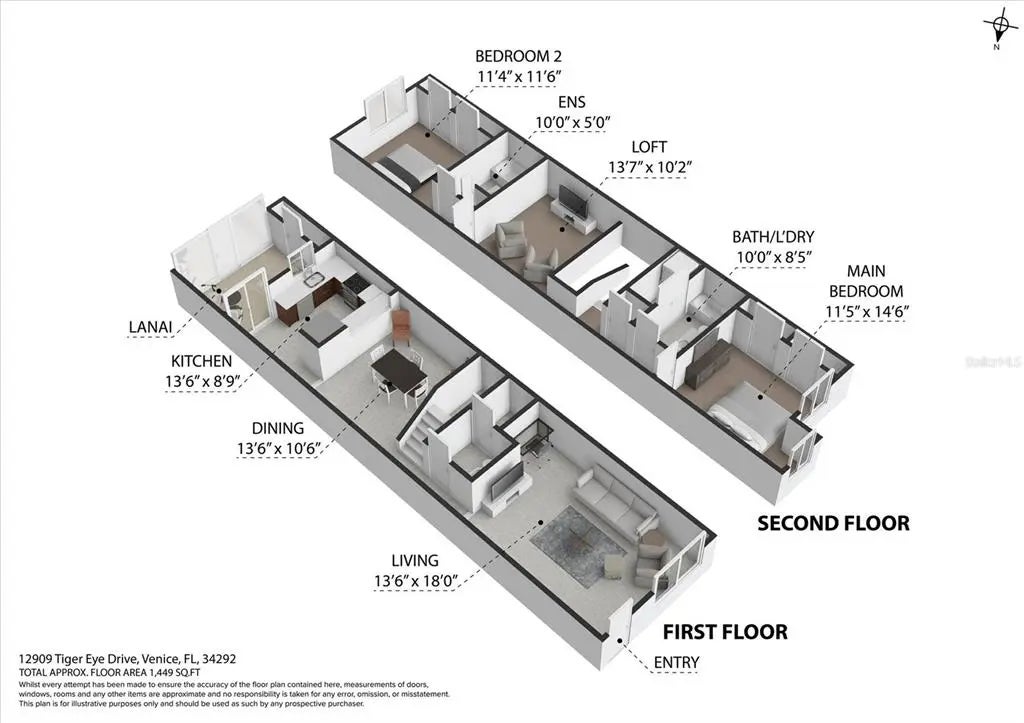 This impeccable townhome is being offered fully turn-key furnished, including all furniture, linens, and appliances for a truly move-in-ready experience. It is priced to sell, and you will not find a cleaner or more meticulously maintained home. Enjoy a beautiful lake view and peace of mind knowing it is not located in a flood zone, so flood insurance is not required. This beautifully updated waterfront townhome in Stoneywood Cove is the larger 1,539-square-foot floor plan and offers two bedrooms plus a loft. The home features a cozy and inviting living space with a relaxing water view from the kitchen, lanai, and primary bedroom. Ceramic tile flooring runs throughout the main living area, and new plush gray carpeting has been installed on the stairs and in the bedrooms. The kitchen is equipped with wood cabinets, granite countertops, and an LG ThinQ stainless steel appliance package. Many upgrades were completed in 2020 and 2021, including a new air conditioning system, carpeting, fresh interior paint, quartz countertops, and appliances. The sellers have used this property primarily for close friends and family when visiting, and it has been hardly lived in, which is evident in its like-new condition. The HOA fees cover exterior painting, landscaping, water, sewer, and community pool maintenance, providing true worry-free living. Stoneywood Cove residents enjoy a tranquil pool and cabana area that is perfect for relaxing and soaking up the Florida sunshine. The location is ideal, with convenient access to I-75, Venice Avenue, and the nearby beaches. It is also just minutes from Wellen Park’s shops, restaurants, Costco, lakefront walking trails, and the Atlanta Braves spring training stadium. Historic downtown Venice is also close by, offering boutique shopping, fine dining, theaters, and the famous Sharky’s Pier. **Sellers are obligated to honor a lease from January through April 2026 for a returning tenant who treats the home with exceptional care. The sellers are happy to close either prior to or after the tenant’s stay. This home represents an incredible value for anyone seeking a fully furnished, low-maintenance, and impeccably cared-for townhome in a sought-after location. For more information or specific details, please inquire today.***Check out the 3D Matterport tour, detailed floor plan, and stunning aerial video showcasing this magnificent property.