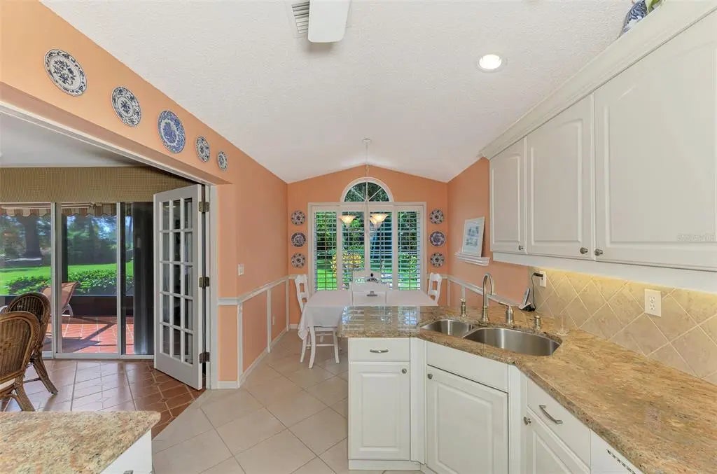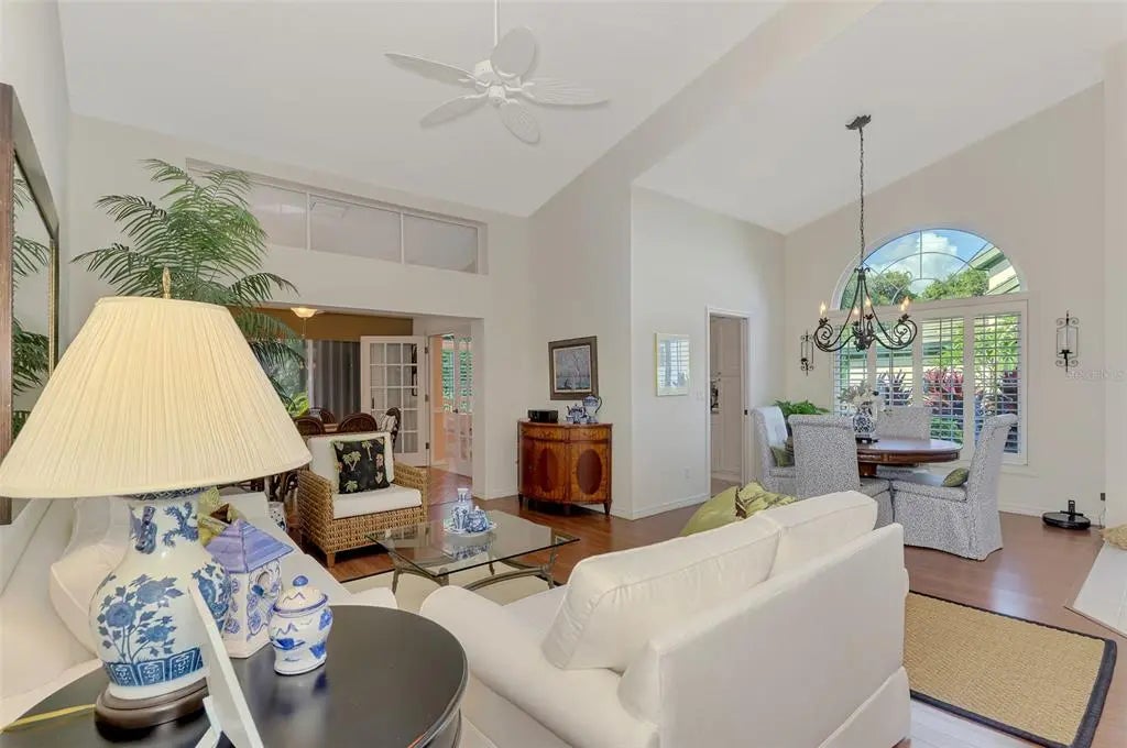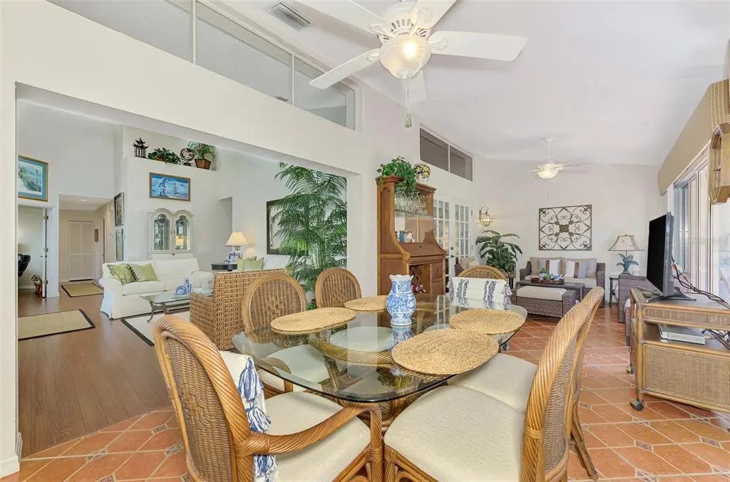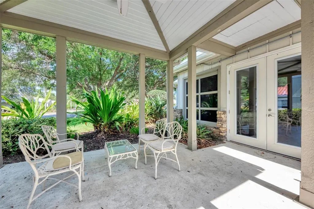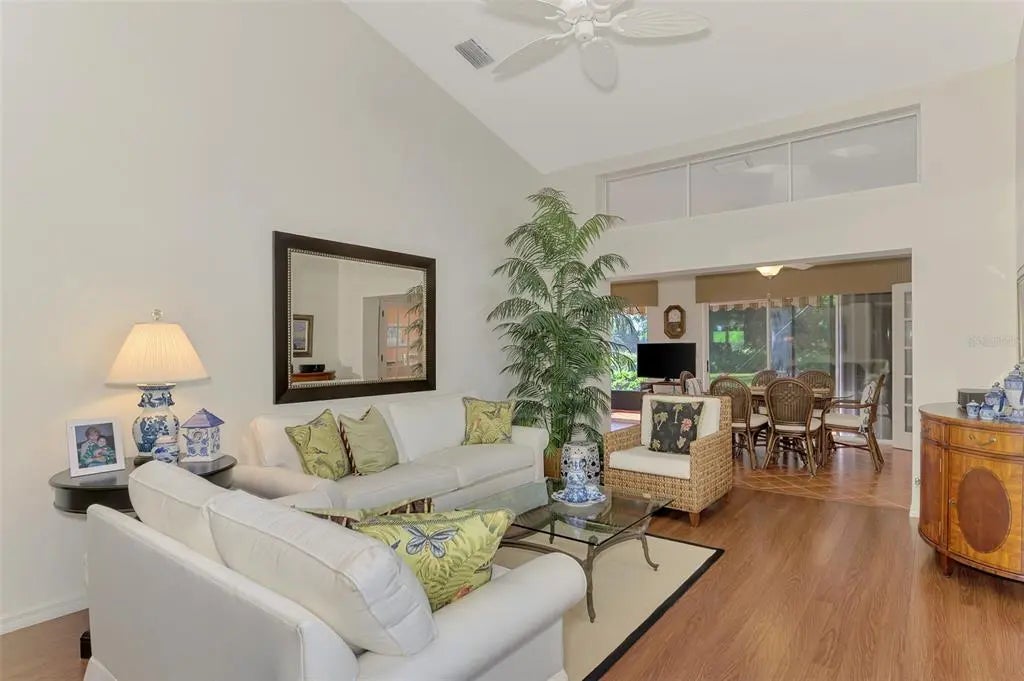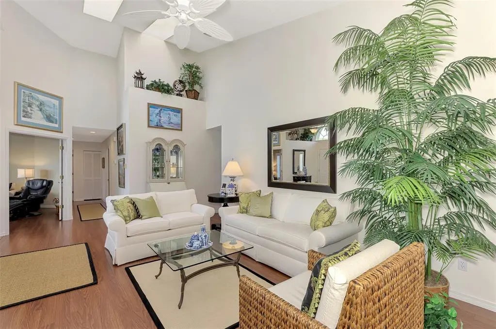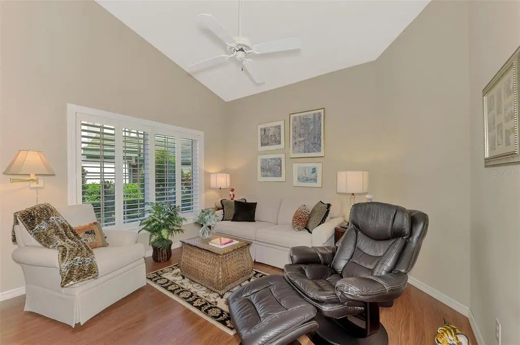 Attractive two bedroom, plus den, two bath, paired villa, in the much sought after Bridle Oaks Community, just off of Capri Isles Blvd. The villa features an open floor plan with cathedral ceilings with skylights in your living room, giving it an even more open and airy feel. Large Florida Room off of the living room with vaulted ceilings.(25X11) Sliders from the Florida Room to the newer caged back porch with an awning, looking out onto the water, golf course and woods. You have an open back porch as well. Kitchen has granite counters, stainless appliances and a breakfast nook. The master bedroom is on the back of the home and features two large California-type, walk-in closets. The home has been well-taken care of and move-in ready. It is being offered partially furnished. The windows were replaced with impact resistant, storm rated type. A brick-paver driveway was completed in 2024, along with a new garage door and water heater. The AC system was replaced in 2023. The tile roof was replaced in 2009. This gated, maintenance free community of 60 homes, offers a heated pool and spa, with clubhouse. This community is tucked beautifully off of Capri Isles Blvd. and Wellfield Park and a great central location and within 4 miles to beautiful downtown Venice and the beaches of the Gulf of America. Come see this great buy today!