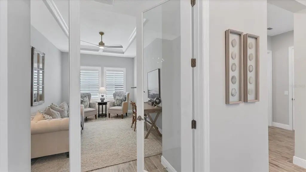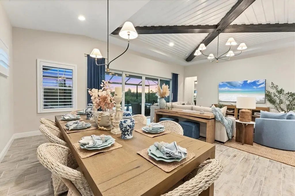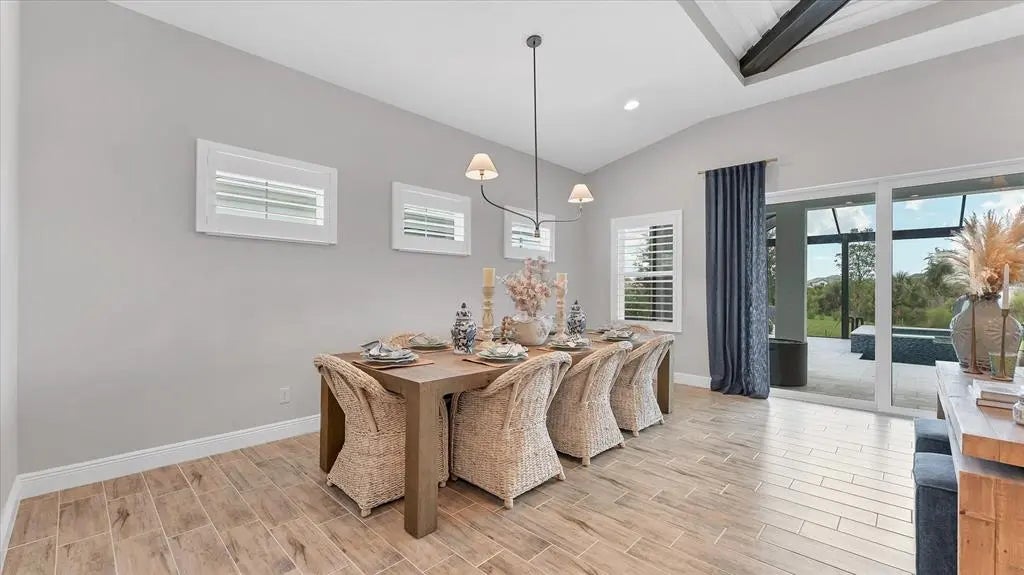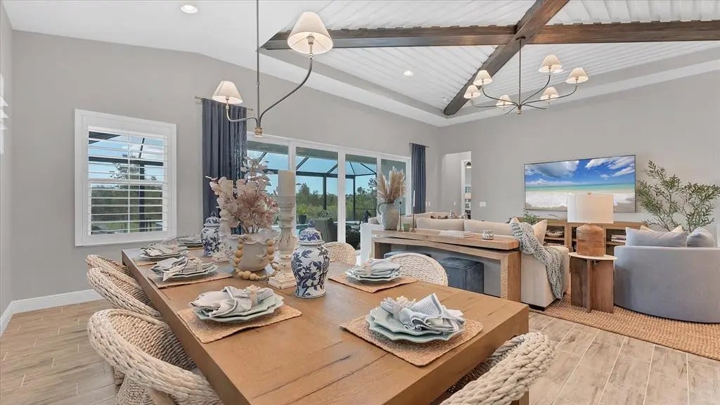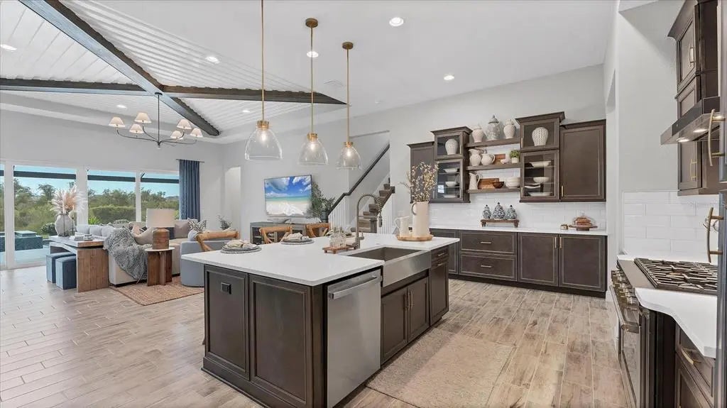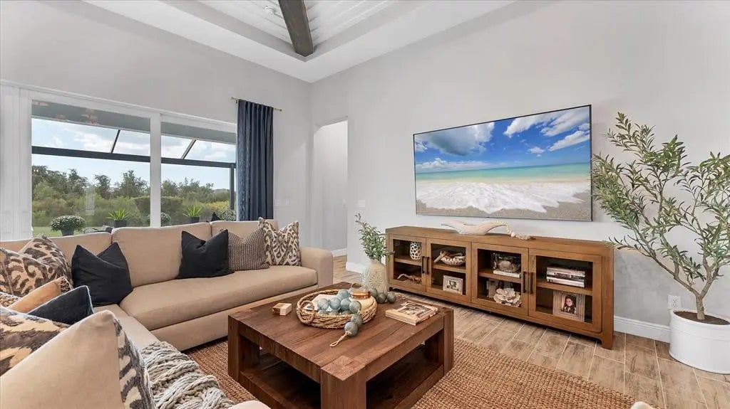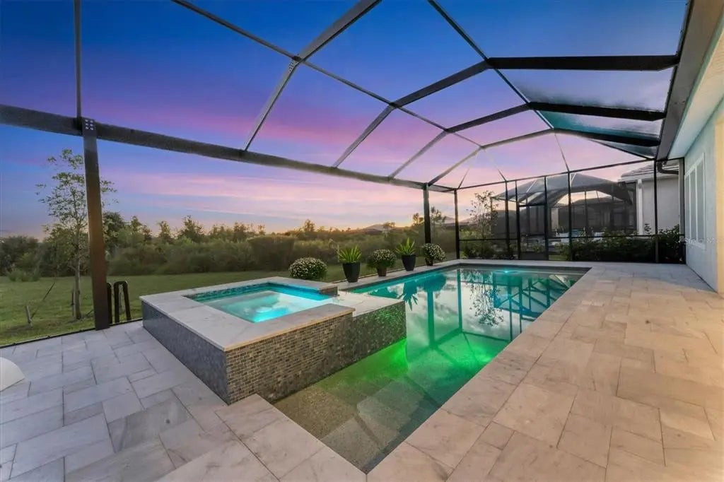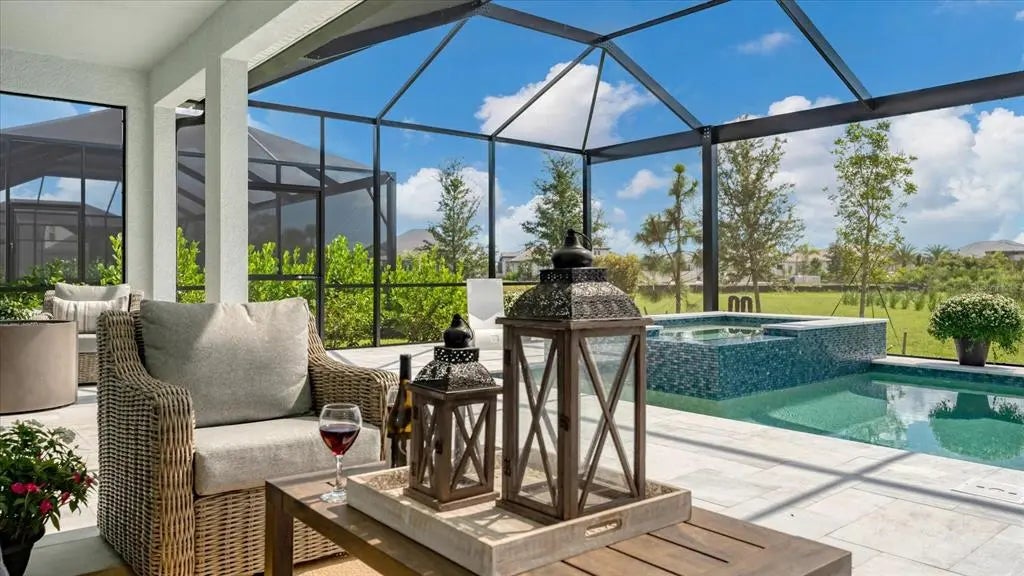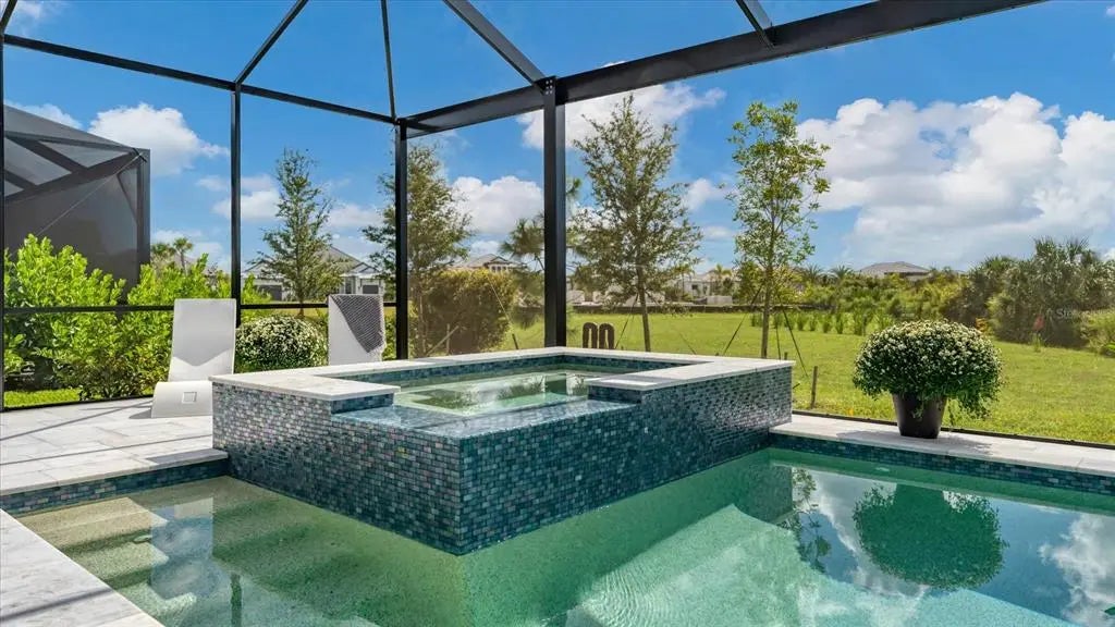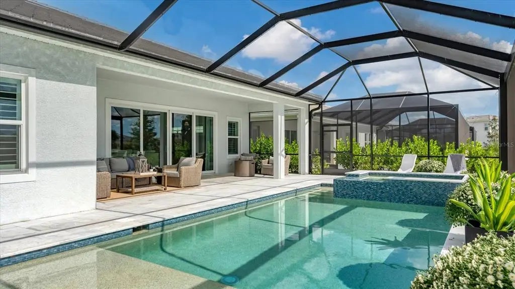Experience luxury living within Wellen Park’s Everly neighborhood, a private, amenity-rich, gated community designed for those who appreciate elegance, comfort, and connection. This exquisite residence embodies modern coastal living with over 3,600 square feet of refined interior space and an expansive outdoor entertaining retreat. Step outside to your custom-designed saltwater pool and spa, complete with a sun shelf and concrete sub-base deck—engineered to prevent settling and shifting of the main pool deck while providing easier long-term maintenance. The travertine tile lanai, generous covered spaces, and natural preserve backdrop create a peaceful and private oasis ideal for entertaining or relaxation. Inside, a soft neutral palette and designer-selected finishes create an atmosphere of warmth and sophistication. The gourmet kitchen is a chef’s dream, featuring Monogram appliances, gas cooking, two spacious pantries, and a custom layout perfect for hosting and gathering. A dedicated den or office offers flexible space for working remotely or enjoying quiet retreat time. The primary suite serves as a luxurious sanctuary, with a soaking tub, rain shower, and elegant design touches throughout. Three additional bedrooms and baths provide comfort and privacy for family and guests alike. The second floor expands the home’s versatility—offering a bedroom, full bath, and an open area ideal for a media room, gaming space, or children’s retreat. Car enthusiasts and golf lovers will appreciate the three-car garage configuration, with a front-facing two-car garage and a side-entry single-car garage—perfect for a golf cart or extra storage. Residents of Everly enjoy access to premier community amenities, including a resort-style pool and spa, state-of-the-art fitness center, pickleball courts, and an elegant clubhouse—all designed to complement the vibrant, active lifestyle that defines Wellen Park. Conveniently located and just a golf cart ride to downtown Wellen Park, near local beaches, Venice shopping and dining, Atlanta Braves Spring Training Facility, I-75, and area airports. Every inch of this home showcases impeccable craftsmanship and bespoke design, creating a residence that is as breathtaking as it is functional. Designed for both beauty and function, the home features impact-rated windows for weather protection, energy efficiency, and peace of mind. Every detail—from the coastal-inspired lighting to the thoughtful architectural flow—reflects a level of craftsmanship and design unique to Everly living. Whether entertaining by the pool, relaxing in the spa, or gathering in the heart of the home, this property offers an elevated coastal lifestyle in one of Wellen Park’s most prestigious neighborhoods. No waiting to build this winter- this extraordinary home is complete and ready to welcome you home.
