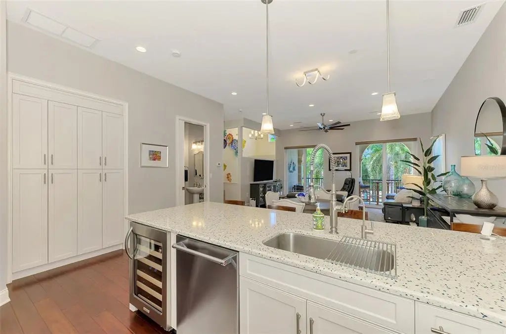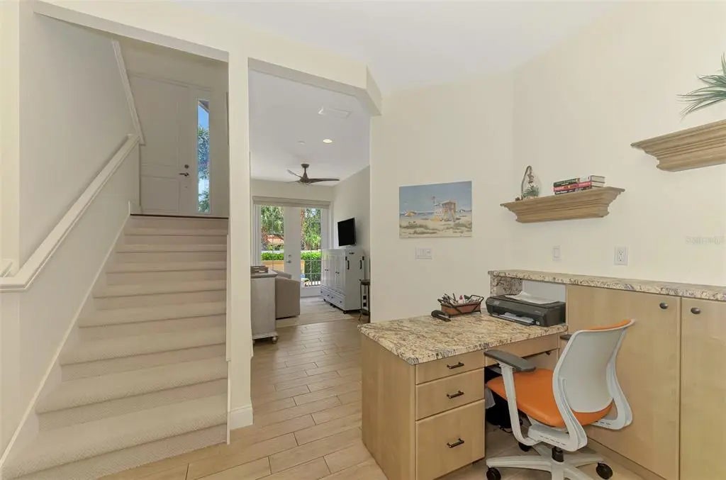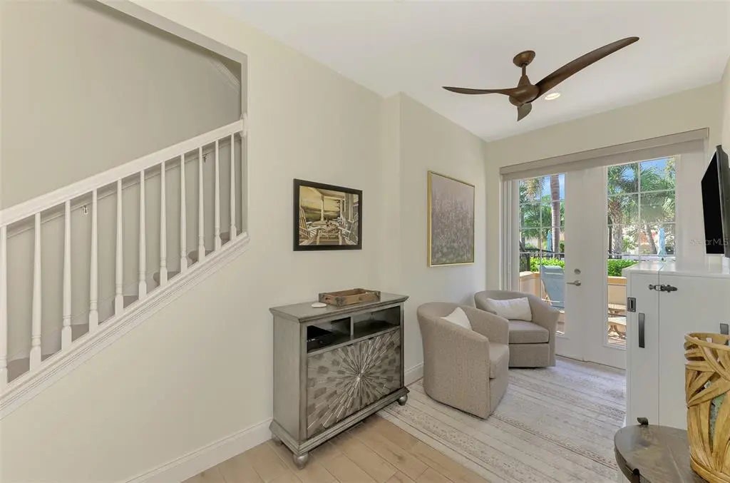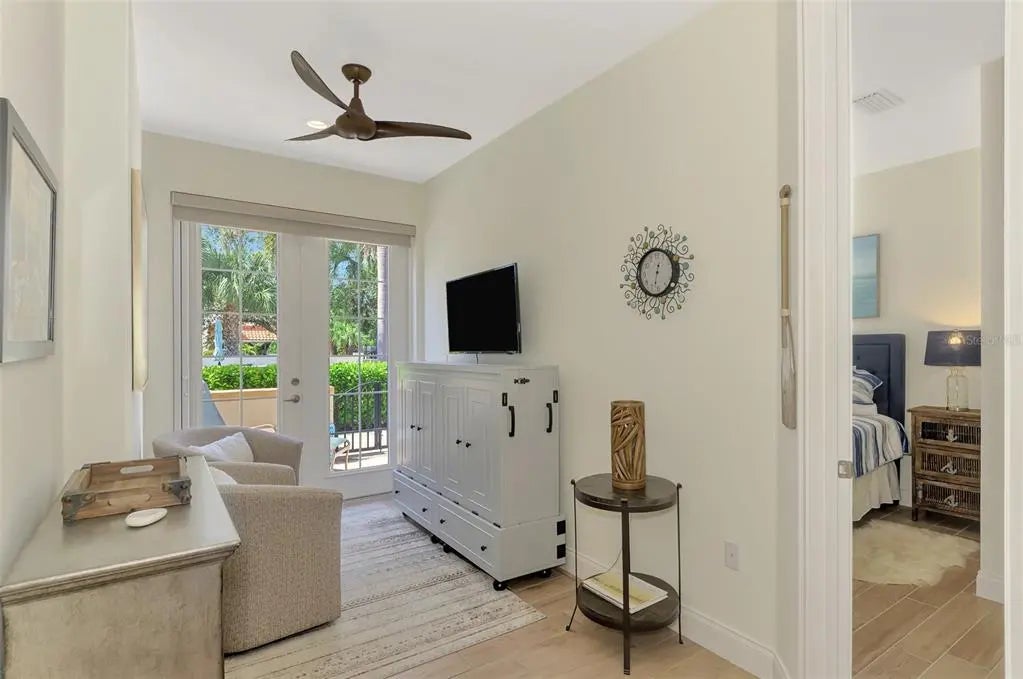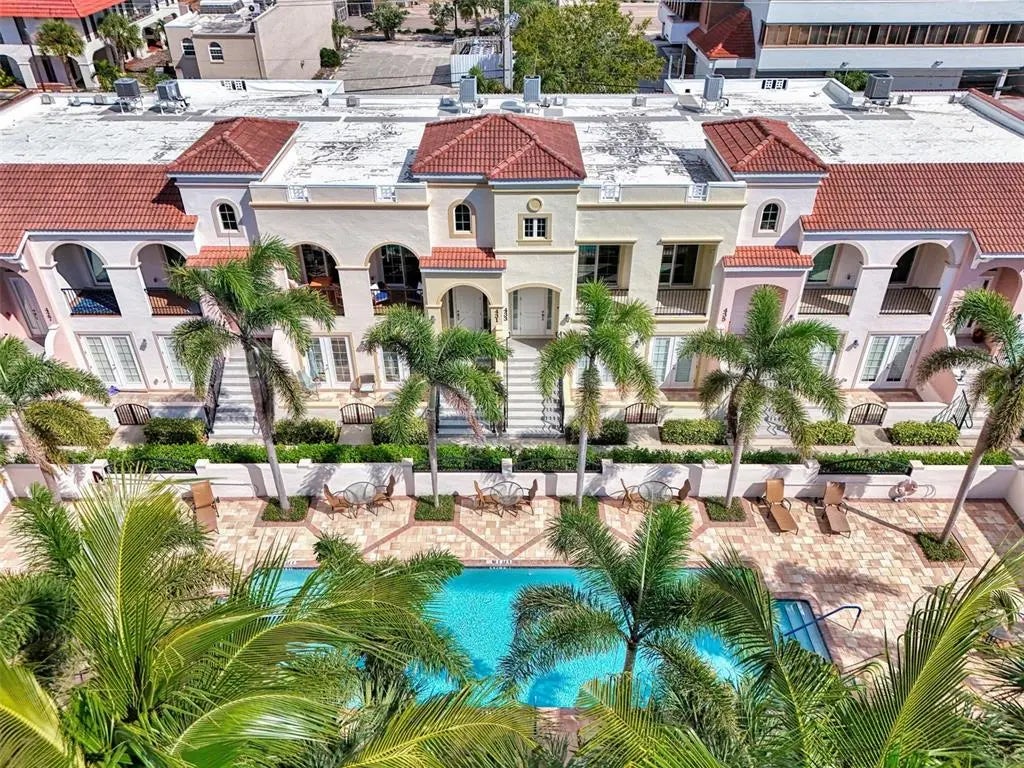 Island Life at its best Downtown Venice! LOCATION! LOCATION! LOCATION! This Exceptional Courtyard Style Condominium offers Easy Living on the Island of Venice! This 2 bedroom, 2.5 bathroom, with media room, den, ELEVATOR and two open Balconies is simply stunning! As you walk to the open foyer, your stair way can take you upstairs to main living of home(2nd floor) or you can take the ELEVATOR UP FROM (1st floor) located off near 2 car garage. The open floor plan offers Hardwood Engineer Wood Floors in all main living area, kitchen and primary bedroom. The Kitchen offers stainless steel appliances, quartz counter tops, beautiful glass backsplash, wine refrigerator, lots and lots of cabinet space with roll outs! Home is very light and bright, offers LED lighting thru-out! Owner loves view overlooking pool, park and many sunsets off Balconies! Primary Bedroom is very spacious with walk-in closet that offers built in shelving! Primary bathroom is large with walk-in title shower, large vanity granite counter top to include make up area and lots of storage too! Second bedroom is spacious with private balcony and is an ensuite with private bath too! Media room, Den and Laundry room is located perfectly in the Island Condo! Two Car Garage is rear of condo, and room for additional parking 2 more vehicles or your golf cart! Condo is very spacious offers water softener and RO System in Kitchen, NO CDD, IMPACT WINDOWS AND SLIDERS, CONDO IS BUILT IN 2015! Elevator wheelchair accessible holds up to 750lbs! Walk to grocery store's, shopping, dinning on the avenue! Venice arts and Library is across the street! ONLY 26 courtyard condos in this community, and rarely available. Look for your call today!