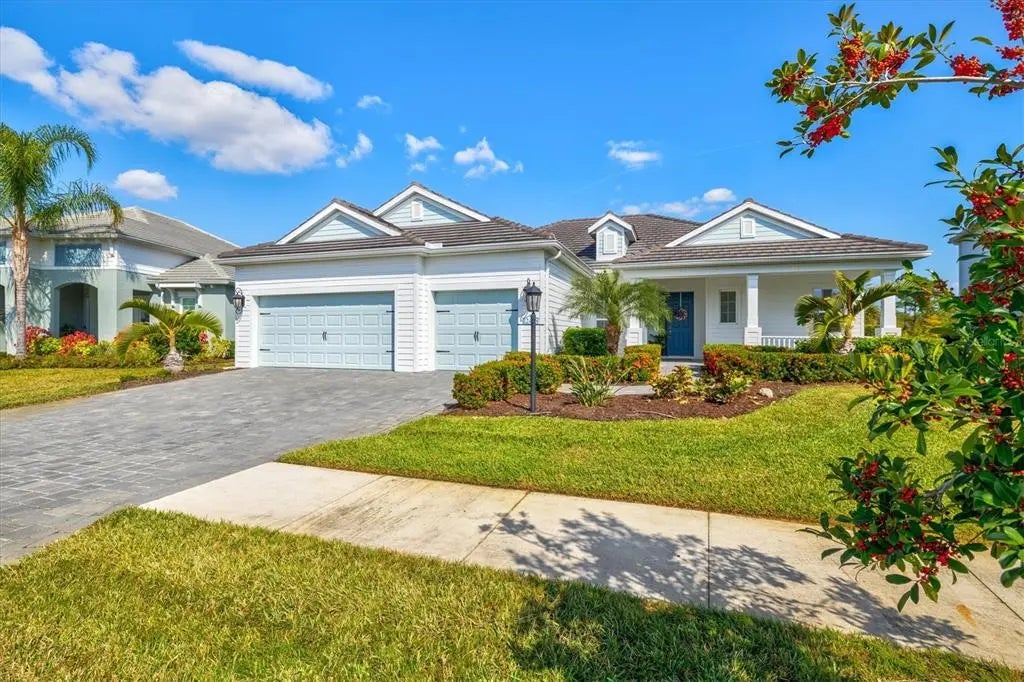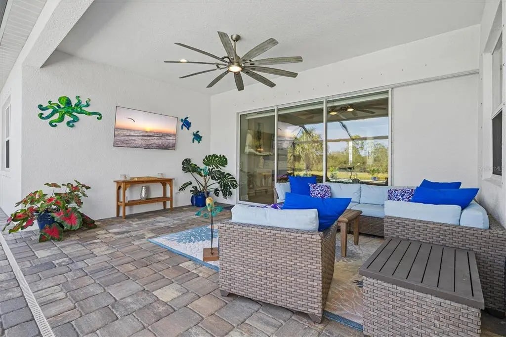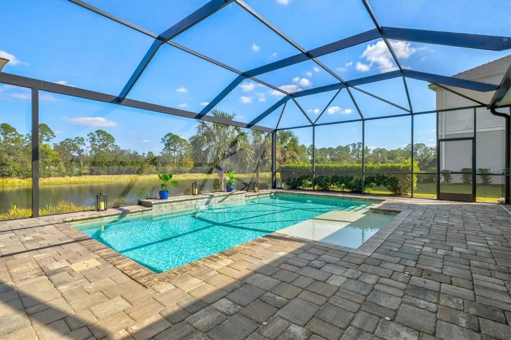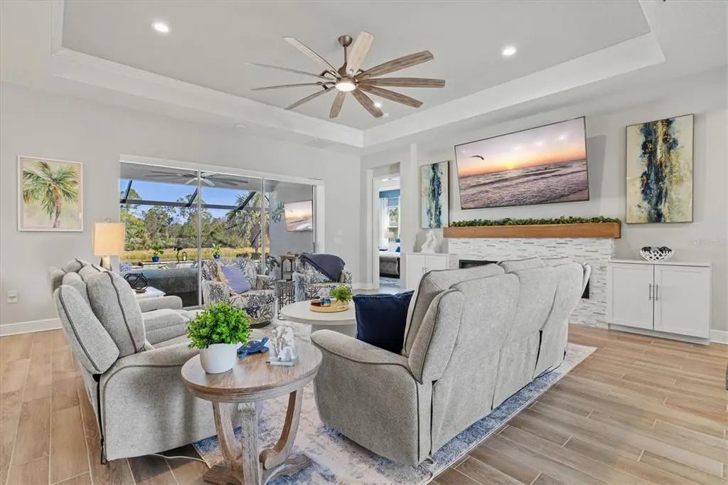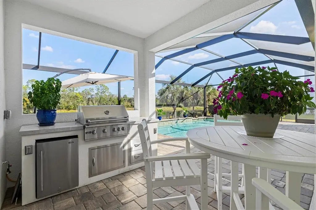 Under contract-accepting backup offers. Welcome to 12436 Destin Loop, a FULLY FURNISHED Sanibel model from the Coastal Series, located in Grand Palm’s exclusive private gated area within the community and near the vibrant Wellen Park community. Offered fully furnished, this turn-key home allows you to move right in and enjoy MAINTENANCE FREE Florida living at its finest. Step outside to your private Florida retreat—one of the home’s most impressive features. The sparkling saltwater pool is surrounded by a panoramic screen cage and includes a Paradise Grill and a TV. Everything is included for the buyer, making this space perfect for effortless entertaining and tranquil waterfront relaxation. Mature landscaping and expansive preserve and pond views provide complete privacy. A paver driveway and walkway lead to a charming covered front porch sitting area and a durable tile roof, setting the tone for the quality found throughout the home. Inside, you’ll appreciate 10-foot ceilings, 8-foot door openings, crown molding in the living room tray ceiling, and a custom built-in fireplace and mantel that create a warm and elevated living environment. The gourmet kitchen showcases quartz countertops, a stylish tile backsplash, 42-inch shaker cabinets, a natural gas range with a wood vent hood, a convection oven, GE stainless steel appliances, and a walk-in pantry with custom shelving. The spacious primary suite includes two large walk-in closets, dual vanities, a soaking tub, a walk-in shower, and refined finishes throughout. Custom closets are thoughtfully integrated for exceptional organization. Additional features include an Extended Club Room, roller blackout blinds, ceramic tile flooring, an epoxied three-car garage, and glass shower doors in all three bathrooms, and a WHOLE-HOUSE NATURAL GAS GENERATOR.