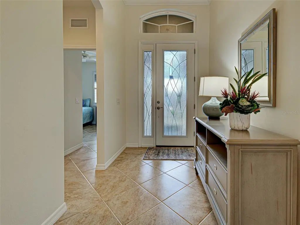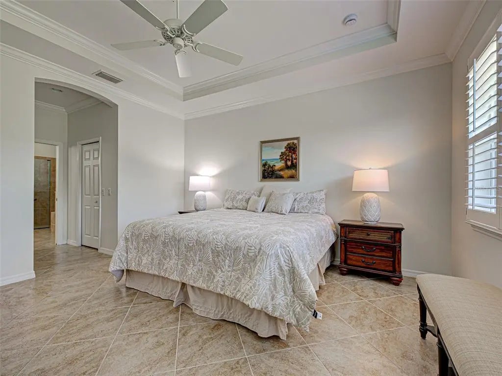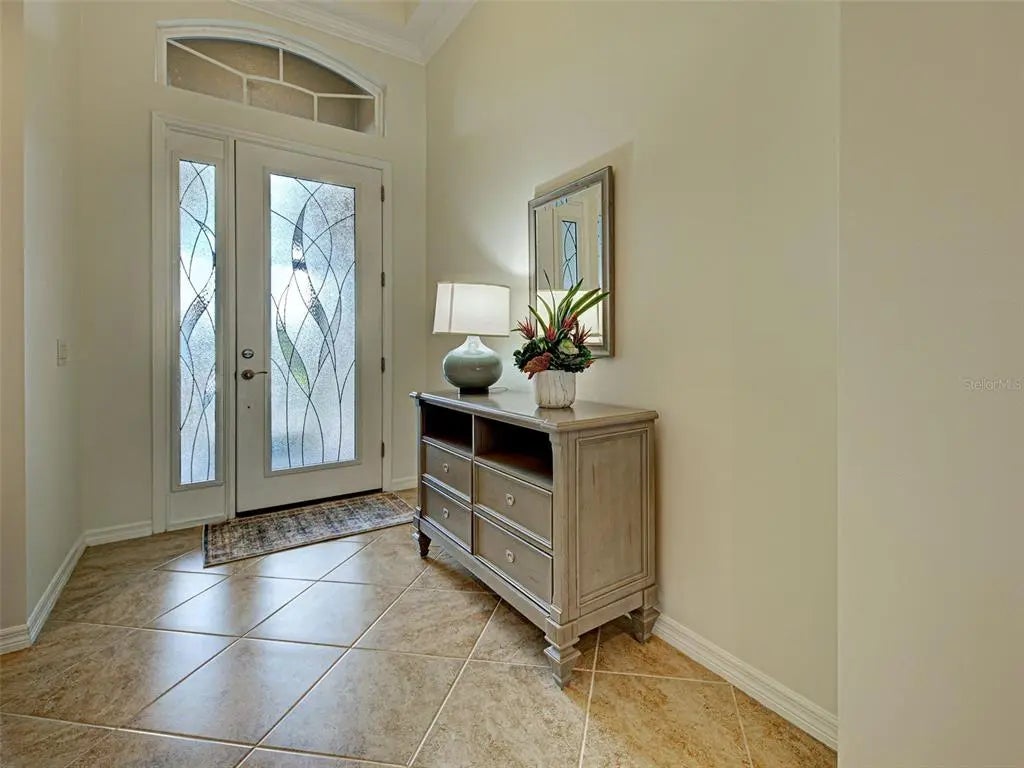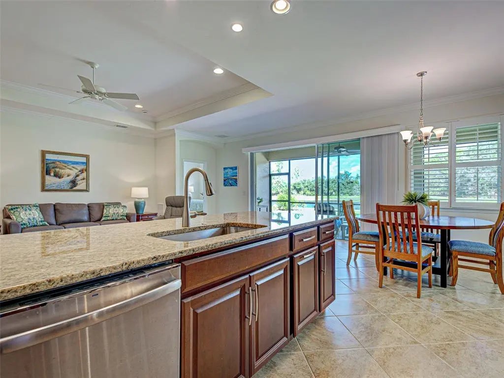 Experience the essence of refined living in this pristine home with a WATER AND PRESERVE VIEW! Embrace the warm welcome, serene surroundings and captivatin views that define this beautiful residence and community. The open-concept design draws you into the heart of the home, where panoramic waterfrount views take center stage. Designed for both style and functionality, this home space flows effortlessly with tile flooring throughout, coffered ceilings and crown molding , plantation shutters and much more. The gourment kitchen showcases premium applicances, granite countertops,large center island, wood cabinetry with custom drawers and a spacious walk-in pantry. The adjoining great room presents the ideal entertaining space with coffered ceilings and crown molding. Sliding doors create a seamless transition to the outdoor lanai, where the lake and wooded views set the perfect backdrop for your entertaining enjoyment. Retreat to the primary ensuite for a spa like feeling of relaxationwhile enjoying the large soaking tub, dual vanities, walk -in-shower, granite countertops. The primary bedroom is a tranquil retreat and is complemented by oversized walk in closets ,plantation shutters,tile flooring for ultimate comfort. The 2 guest bedrooms have a shared full bathroom with a separate linen closet. The split floor plan ensures privacey for all your guest to enjoy. The office / den features double doors for added privacy to enjoy your private space. A large laundry room with sink and custom cabinets making laundry day "loads of fun". A 2 car garage with epoxy flooring with lots of space for storage. Caribbean Village community offers a community pool, gym, gathering area , gated, low HOA and no CDD fees, close proxmity to pristine beaches, historic downtown Venice, fine dining, shopping ,golf courses ,entertainment and minutes to Wellen Park, Braves Stadiium, Costco and hosptials . Schedule a private showing today and make this home YOURS !