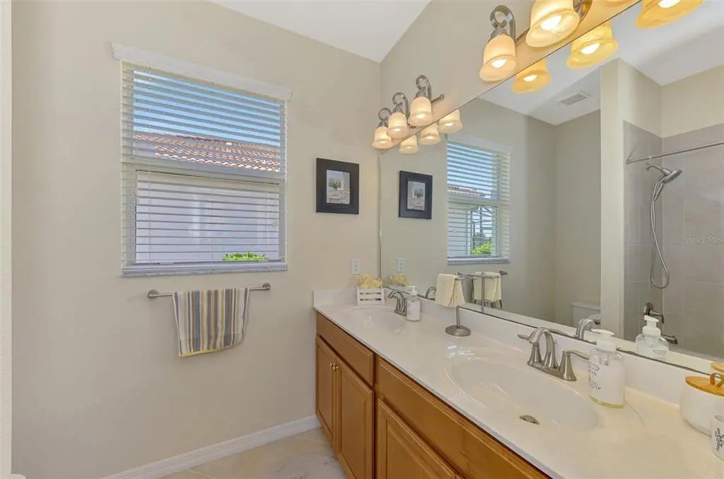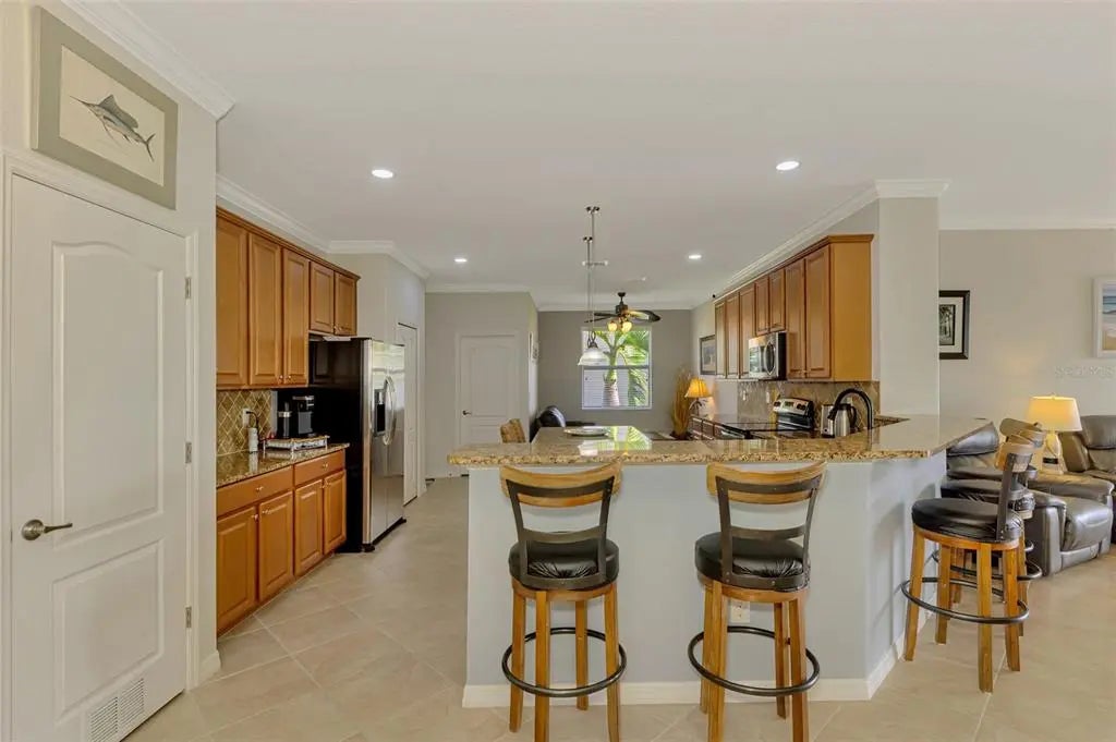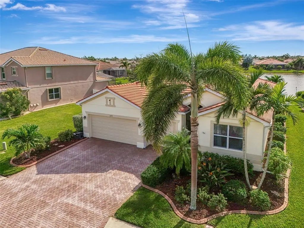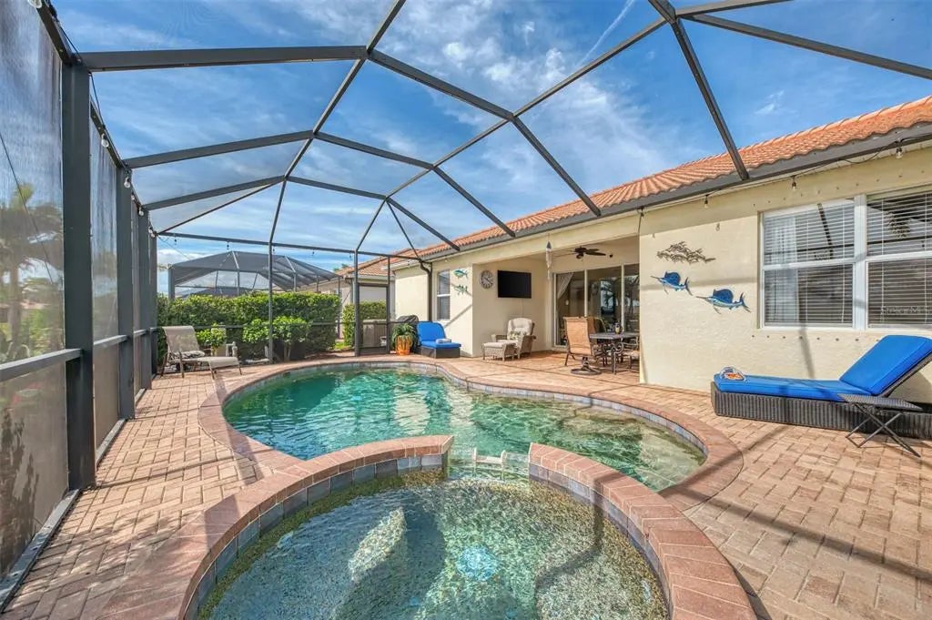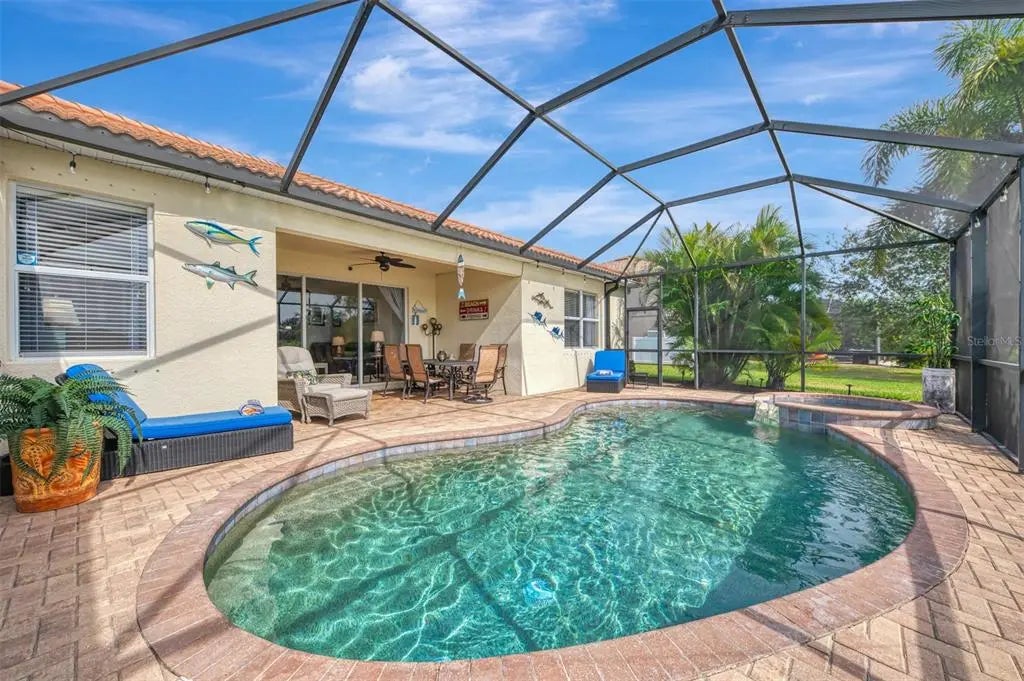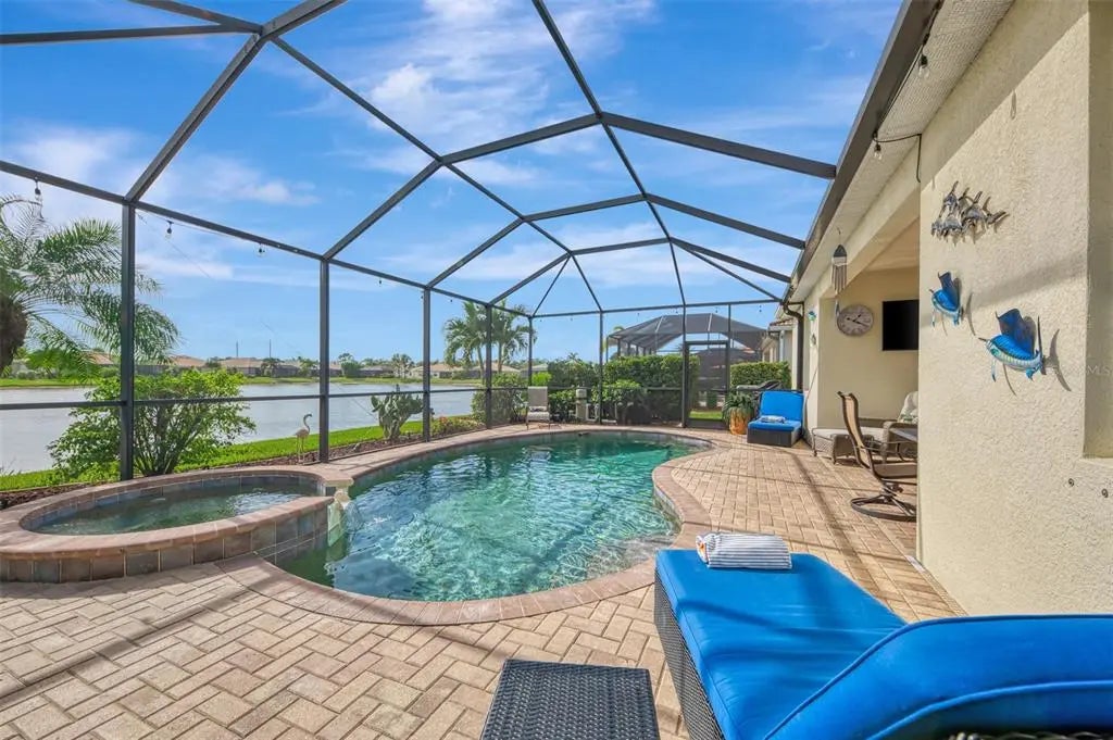 Under contract-accepting backup offers. Well appointed, spacious and pristinely maintained 4 bed 3 bath home with heated pool, spa and water views on large premium lot being sold "Turnkey" to include the beautiful furniture and decor so you can just move in and enjoy your new Oasis. You will love the welcoming open airy feel, the indoor/outdoor living and stunning sunsets and pool side water views. This split bedroom floorplan with extra den/office area offers both privacy and ample gathering spaces for all your personal and entertaining needs. Huge gourmet kitchen with center island, large snack bar, lots of cabinets and counter space is ideal for large family and friends to gather. Main Suite is a true retreat offers spa style bathroom with separate toilet room and extra large walkin closet. Bonus- Pool/Spa is updated and has Remote Monitor System for easy maintenance while out of town. Loads of closet space and a 3 Car Garage means there is plenty of room and extra storage area for all of your hobbies and recreational activities. This beautiful gated community of Stoneybrook provides many social activity opportunities with an extensive list of Amenities [Fitness Center, NEWLY RENOVATED Swimming Pool, Sand Volleyball Court, Baseball Field, Basketball, Playground, Tennis Courts, Pickleball Courts, Shuffleboards, Fishing] and it's ideal location has easy access to Venice Island, Gulf Coast Beaches, Golf Courses, Boating, Wellen Park and Interstate 75. Recent Updates include- New AC 2024 and some furniture.