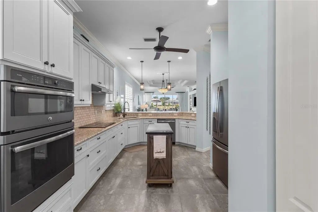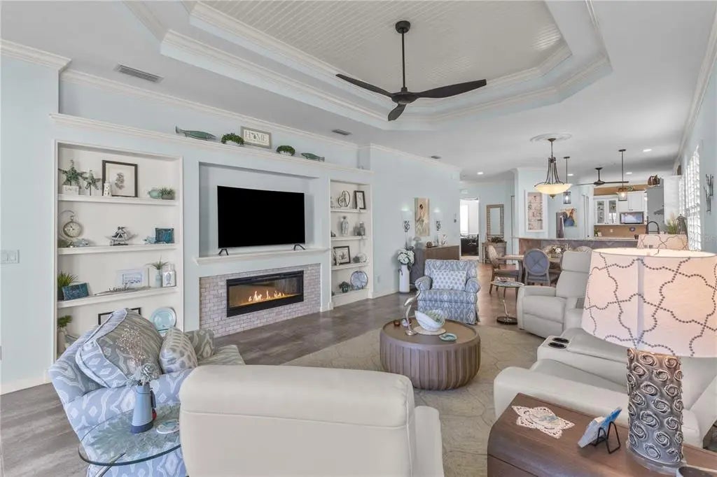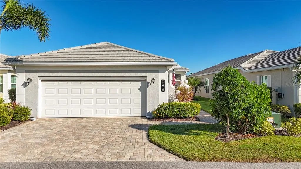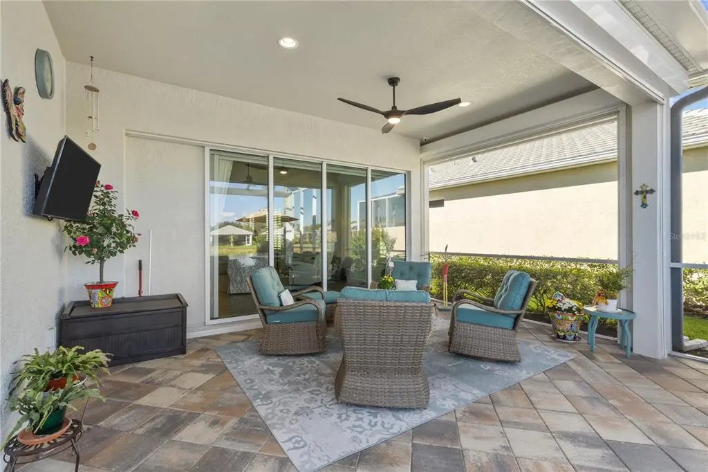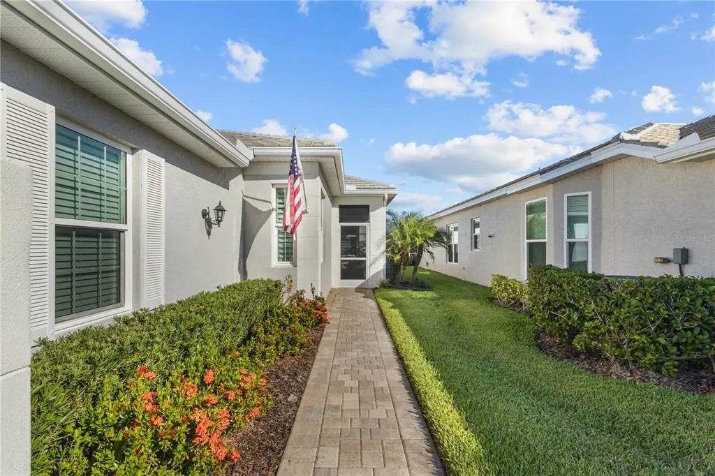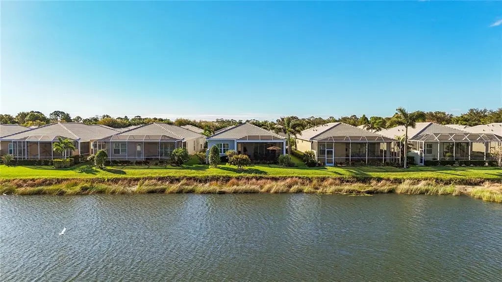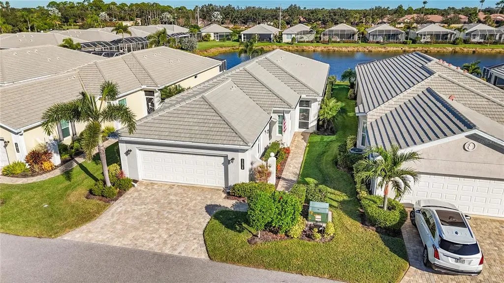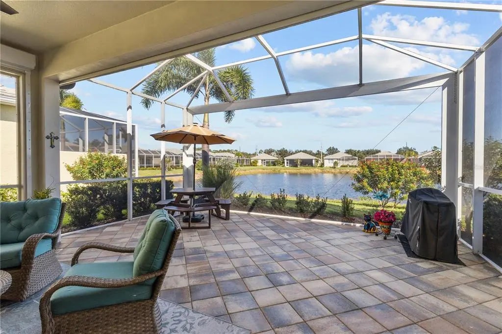 Maintenance-Free Patio Home with Lake View in St. Andrews East at The Plantation Golf & Country Club. Experience the best of Florida living in this beautifully upgraded 3-bedroom, 2-bath patio home with a 2-car garage and tranquil lake view. The open floor plan is bright and inviting, highlighted by high ceilings, crown molding, plantation shutters, custom accents, and an electric fireplace. The spacious kitchen features fingerprint-resistant slate appliances, an induction cooktop, granite countertops, custom cabinetry with glass inserts, a breakfast bar, and a charming breakfast nook framed by bay windows. The great room opens to an oversized screened lanai with a new Clear View screen enclosure, perfectly framing the unobstructed lake view. The primary suite offers two walk-in closets, dual sinks, and a Roman-style shower. Guests will appreciate their private suite with an oversized walk-in closet—ideal for extra storage—and a luxurious bath with a walk-in shower. The third bedroom currently serves as a den, and the home is equipped with a central vacuum system. Hurricane protection is effortless with impact-rated insulated windows and electric roll-down hurricane shades on the lanai, making it storm-ready in minutes. For added convenience, the garage features an electric roll-down screen door, allowing fresh air and light while keeping the space comfortable. With condominium ownership, exterior maintenance is fully taken care of—perfect for frequent travelers or anyone seeking a carefree lifestyle. There is no CDD fee, and residents enjoy an active clubhouse and two community pools. Optional membership at The Plantation Golf & Country Club provides access to two 18-hole championship golf courses, 13 Har-Tru tennis courts, six pickleball courts, Bocce Ball, fitness center, Jr. Olympic pool, and exceptional dining and social events. Perfectly located near beautiful beaches, shopping, dining, Wellen Park Downtown, the Atlanta Braves Spring Training Stadium, and convenient access to I-75—this home embodies the ideal Venice lifestyle.
