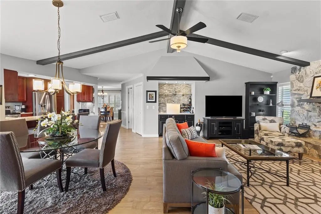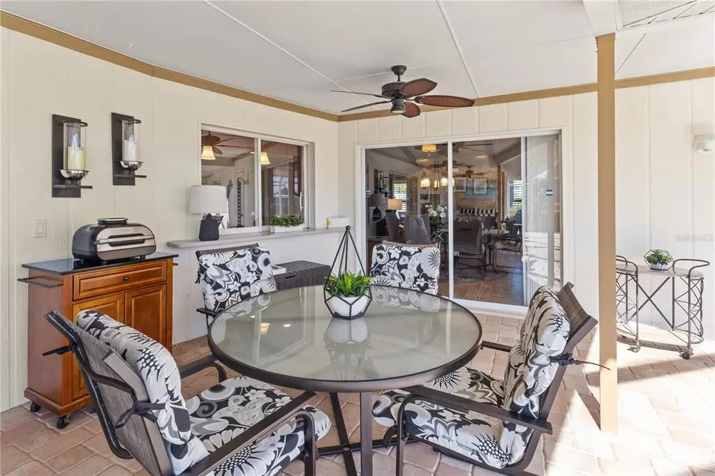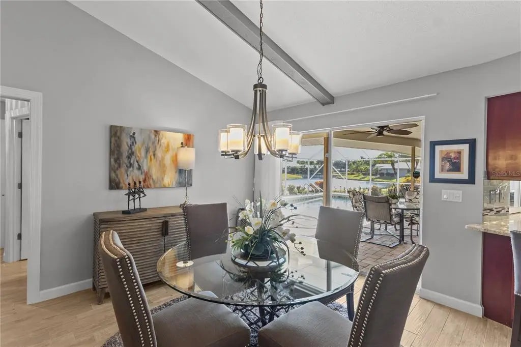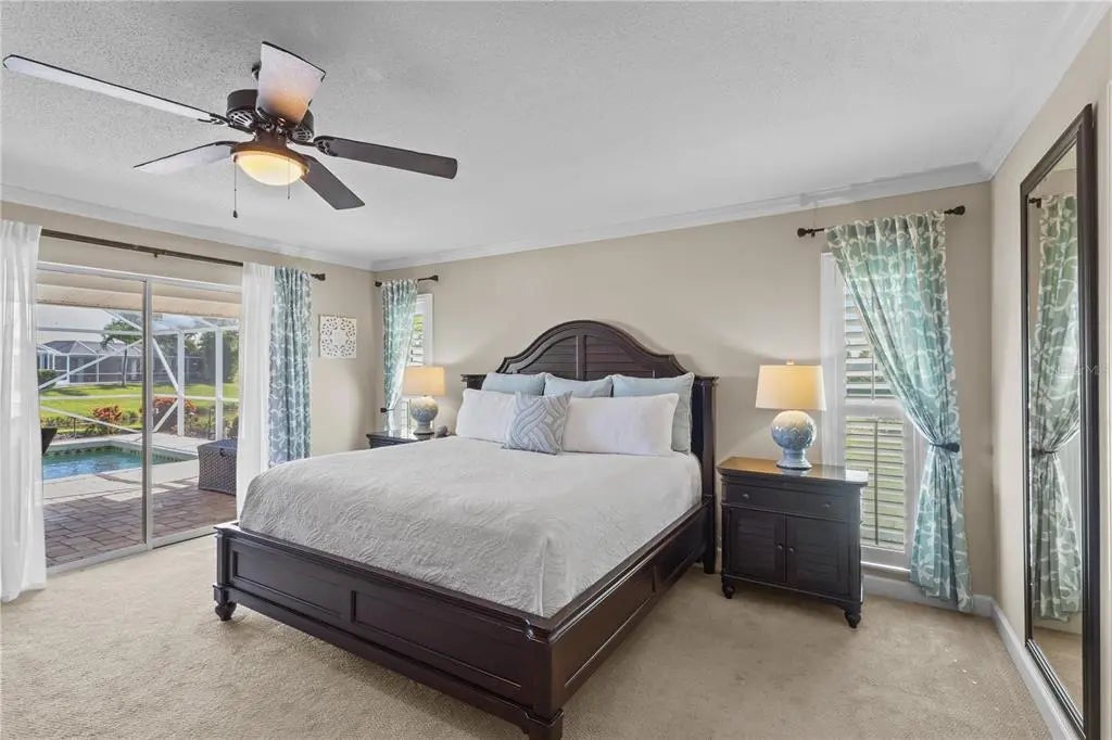 Under contract-accepting backup offers. Experience the perfect balance of elegance and ease in this beautifully updated 3 bedroom, 2 bath pool home with a tranquil lake view, tucked away on a quiet cul-de-sac in the highly desirable Plantation Lakes neighborhood at Plantation Golf & Country Club. This community is unique within Plantation, offering remarkably low HOA fees of just $550 per year. From the moment you step through the double wood doors with glass inserts, the home’s warmth and thoughtful design immediately stand out. Expansive views draw your eye straight to the pool and the shimmering lake beyond, setting the tone for relaxed Florida living. Inside, high-end porcelain plank tile floors, plantation shutters, and plush bedroom carpeting create a refined yet comfortable atmosphere. The open family room is an inviting focal point, featuring a beamed cathedral ceiling, custom stone fireplace, and a built-in wet bar with glass shelving—ideal for entertaining. The kitchen blends function and style with granite countertops, custom wood cabinetry, stainless steel appliances, and a pass-through window with serving bar to the pool area. Step outside to a spacious screened lanai surrounded by lush landscaping, where the solar-heated pool and peaceful lake view provide the perfect setting for outdoor living. Quality updates include replacement of most of the windows to impact hurricane windows in 2023, HVAC system (2020), new security system (2023), updated irrigation system (2022) drawing from the lake, and a new solar pool heater and pump (2024). The pool cage was replaced in 2013 and upgraded with stainless steel screws in 2020, and the water heater was replaced in 2023. Additional gutters have also been added for improved drainage. Optional membership at The Plantation Golf & Country Club offers access to two 18-hole championship golf courses, 13 Har-Tru tennis courts, six pickleball courts, Bocce Ball, a fitness center, Jr. Olympic pool, dining, and a vibrant calendar of social events. This exceptional home captures the essence of Florida living—refined, inviting, and truly move-in ready.