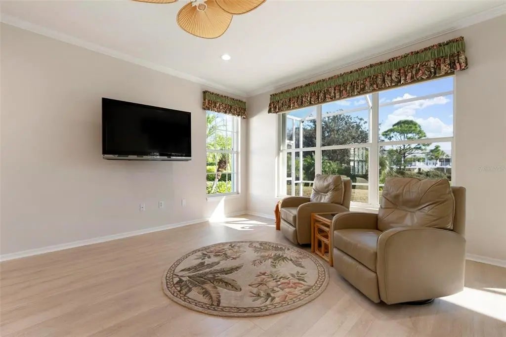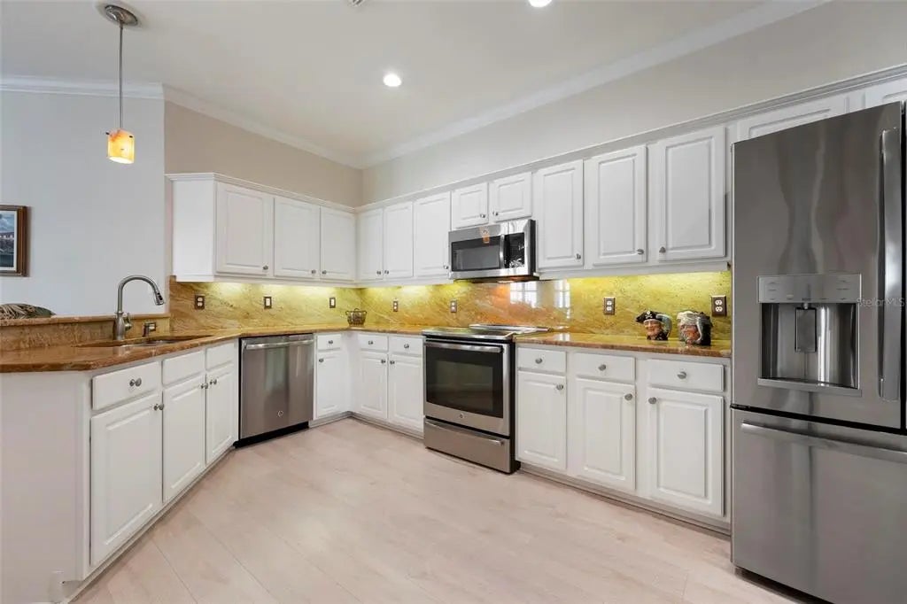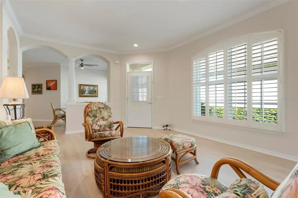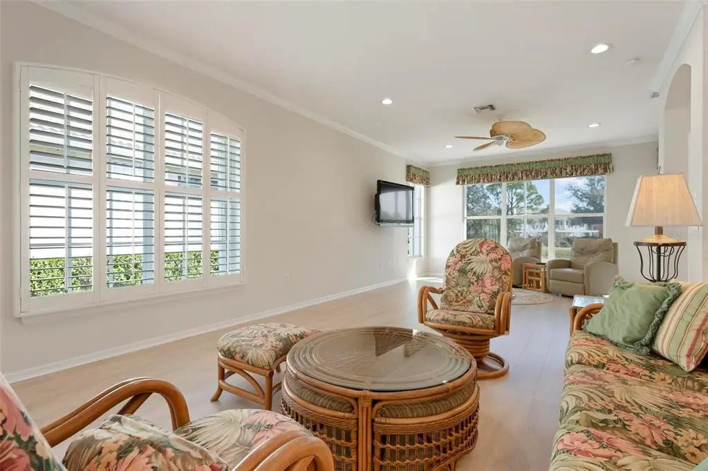 Live beautifully and perfectly at ease in this stunning, move-in ready sanctuary. Furniture available under a separate contract. This residence has been exquisitely remodeled to today's contemporary standards, offering an unparalleled blend of comfort and style. Step inside to discover a gorgeous interior featuring seamless cream in tone wood-like laminate flooring, elegant crown moldings, high and tray ceilings that create an open, airy ambiance. The all-renovated chef's kitchen and spa-inspired baths offer modern luxury, complemented by light-filtering plantation shutters and an extended lanai for indoor-outdoor living. The second bedroom has been transformed into an office with built-in desk. Peace of mind is assured with significant structural upgrades: a new tile roof (2023), new water heater (2024), and durable accordion shutters. The epoxy-finished 2-car garage adds to the home's impeccable presentation. Enjoy an extraordinary, vibrant lifestyle with exceptionally reasonable association fees. Benefits include exterior maintenance, exterior painting, high-speed internet/cable, 24/7 guard gate, and full social membership at the club with amenities galore: 27 holes of semi-private golf, fitness area and dining, tennis/pickleball courts; 2 heated pools, and an active women's association (45+ groups). Just minutes away from your doorstep, explore the quaint shops, dining, beaches, and cultural venues of Historic Venice Island, burgeoning Wellen Park, and the greater Sarasota County area. This is more than a home; it's a lifestyle upgrade. Schedule your private showing today! '