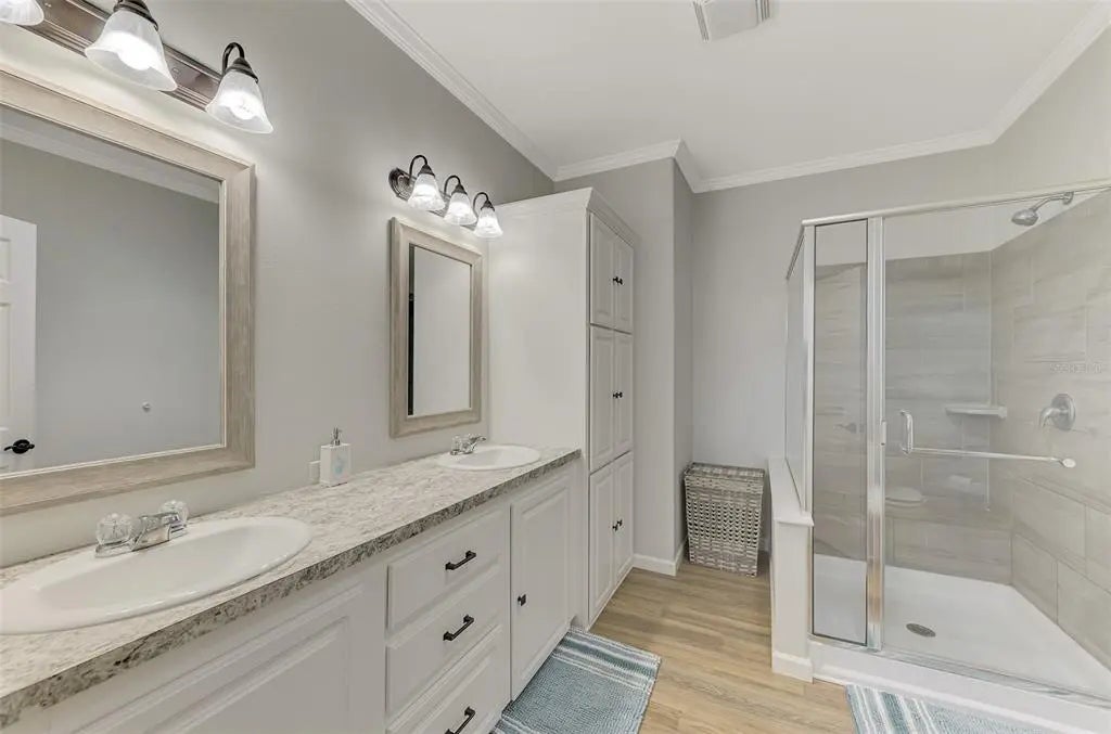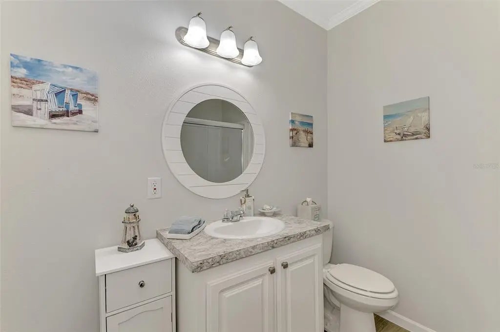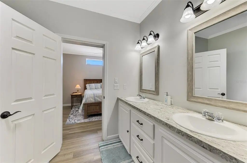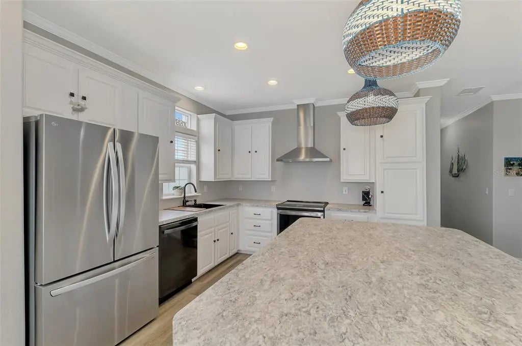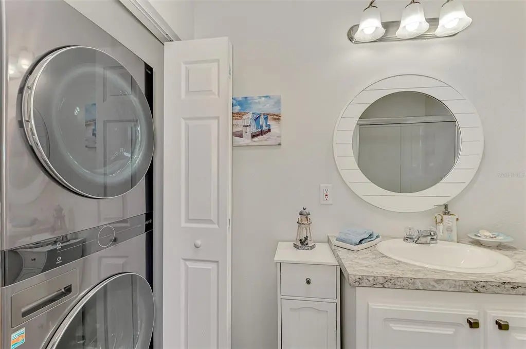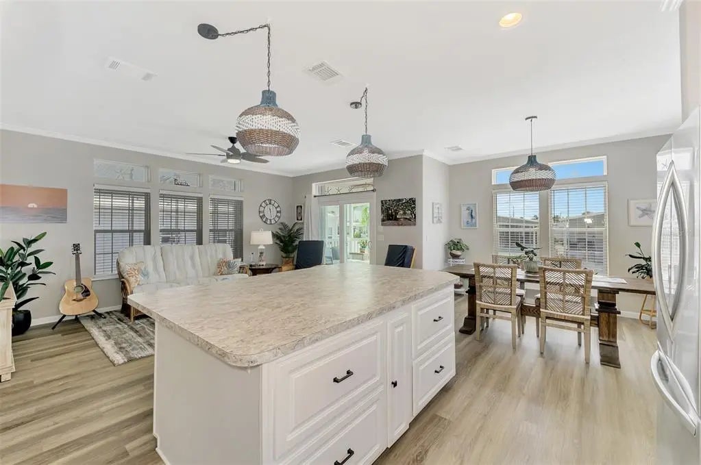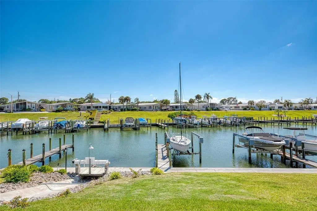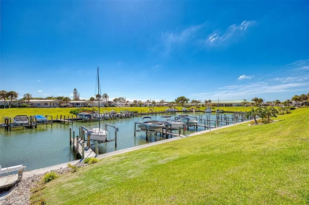Immaculate, Better than New, 2 year old home in Dream Location for Boaters and Beach Lovers! Welcome to Country Club Estates, a premiere 55 plus, waterfront boating community with 120 slip private intercostal Harbor on the Island of Venice. This thoughtfully designed two-bedroom, two-bathroom home offers an open floor plan featuring large windows with transoms, allowing for plenty of natural light. Attractive luxury vinyl flooring and crown molding throughout creates a warm and inviting atmosphere. The large kitchen boasts an oversized island with plenty of cabinet space, energy-saving appliances - refrigerator, induction range, dishwasher and garbage disposal. All appliances were new in 2023 and still have the remainder of their 5 year warranty. The primary bedroom has a walk in closet and an ensuite with a step in shower and dual sinks. The second bedroom includes a deluxe Murphy bed package with a queen size bed perfect for family or guests. This room could be used as a home office or craft room offering ample closet space and easy access to the second full bath. A stackable washer and dryer located behind louver doors in the second bathroom makes for a dedicated laundry space. The home also offers a relaxing front porch and large screened in lanai allowing for additional entertaining space. Attached oversized storage/shed with shelving and cabinets. Hurricane shutters installed over all windows in June 2025. Home wired for electric generator hook up. The picturesque harbor offers affordable boat slips and docks just seconds from the Intracoastal Waterway. Gulf beaches and golf courses close by. Access to Venetian Waterway and Legacy bike trails right out of your driveway. Venice Historic district offering shopping, restaurants and entertainment is just a short walk or golf cart ride away. Owner has priced this beautiful home well below what they invested.