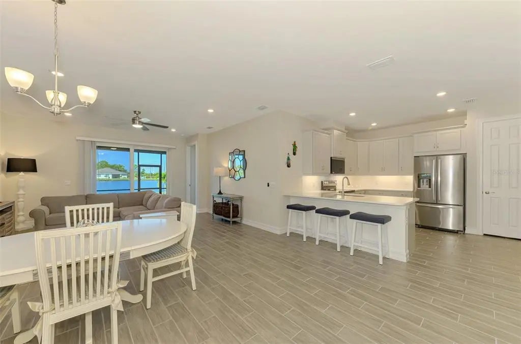 Welcome to this like-new WATERFRONT villa in the highly desirable Palencia community of North Venice! With low monthly fees and no CDD, this home shows great long term value. This well-maintained 2-bedroom, 2-bathroom villa includes a spacious den featuring glass French doors for additional flexibility and privacy. The open-concept floor plan showcases beautiful water views throughout! High end features including ALL IMPACT windows and glass sliding doors for peace of mind. A chef-inspired kitchen with quartz countertops, tile backsplash, stainless steel appliances, under-cabinet lighting, and soft-close cabinetry with pull-out drawers. Two separate kitchen pantries including one upgraded with California closets. Tile plank flooring throughout all the main living areas, den, kitchen, and bathrooms. The primary bedroom is large with newer luxury vinyl plank flooring, en-suite bath with walk in shower, and a generous walk-in closet updated with California closets for great storage. Step outside to your cozy lanai, perfect for enjoying Florida’s sunshine and wonderful lake views. Other great updates include new screens and frames for all windows, gutters around whole villa, remote control fans throughout, and SMART home features including doorbell, thermostat, front door lock, and garage opener. Palencia is a great low cost and maintenance free community featuring lawn care PLUS a wonderful community pool with clubhouse and fitness. The community also features bocce ball, walking trails, and multiple dog runs. A convenient North Venice location with quick access to i75, shopping, and dining. Plus quick access to Downtown Venice and Gulf Coast Beaches. Don’t miss the chance to make this waterfront retreat your new home. Schedule your showing today!