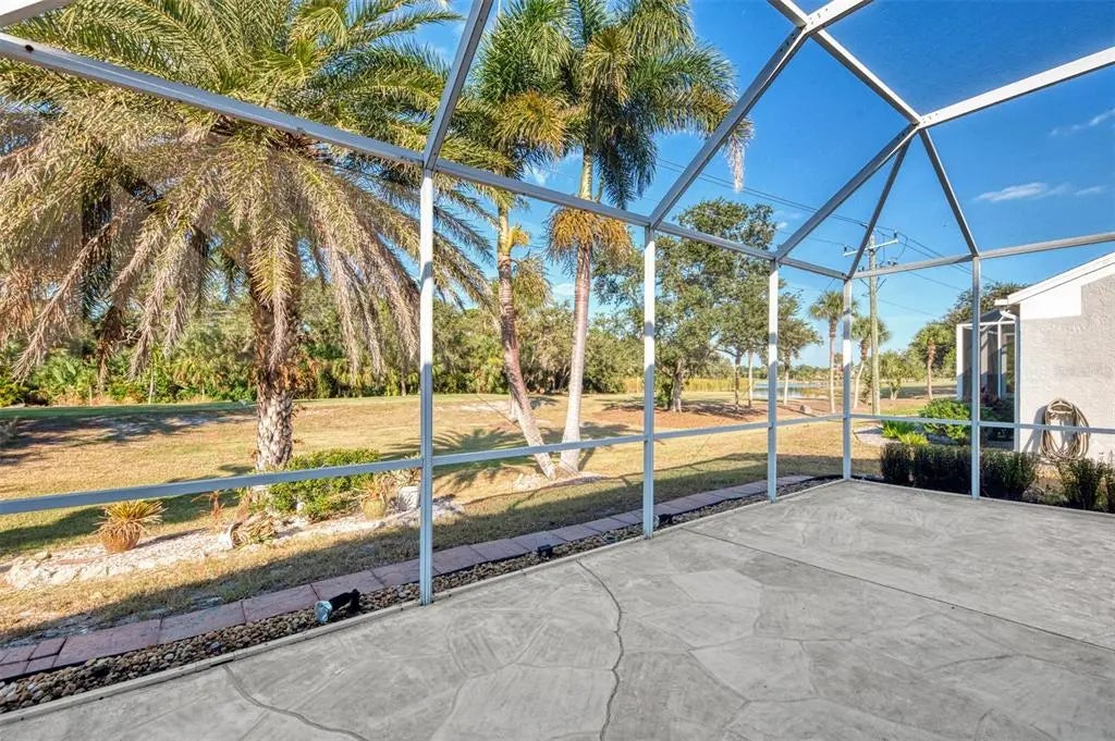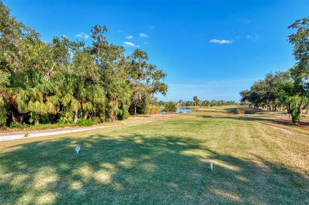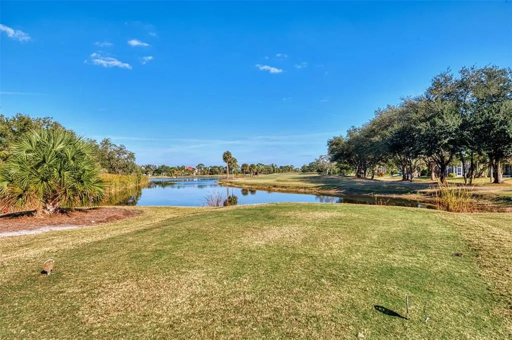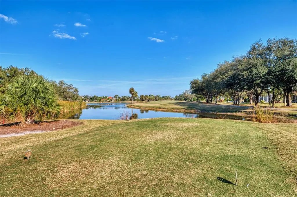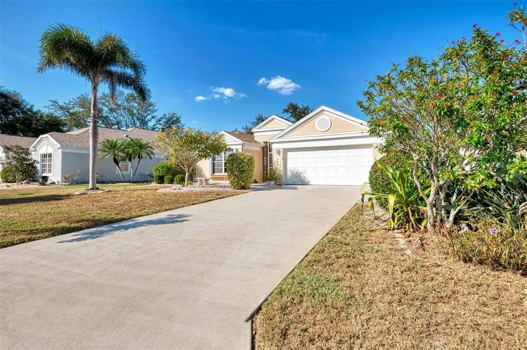 Under contract-accepting backup offers. One or more photo(s) has been virtually staged. Charming Home with Golf Course Views in a Quaint Neighborhood! Located just outside the Plantation Golf & Country Club, this delightful home offers breathtaking views of the #3 tee box on Panther Golf Course from the expansive lanai, primary bedroom, and living room/kitchen sliding glass doors. The split floor plan provides two bedrooms with a guest bath on one side, while the primary suite is perfectly positioned for privacy and relaxation, featuring a luxurious en suite with granite countertops, dual sinks, a walk-in shower, and a private water closet. The eat-in kitchen includes granite countertops, pantry, and crown molding flows throughout the home. The laundry room includes convenient cabinets and Bedroom 2 includes a charming window seat. The oversized garage has an exterior door, and the outside is finished with custom curbing. The extended lanai is ideal for entertaining or relaxing while taking in the scenic golf course and adjacent water views. Membership to the Plantation Golf & Country Club is Optional. The club offers two 18-hole championship golf courses, pickleball, bocce ball, tennis, fitness center, pool and fine dining. Don’t miss this opportunity—buyers, schedule your private tour today, and agents, bring your clients to experience why this one won’t last long!
