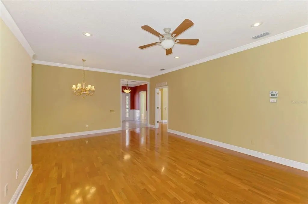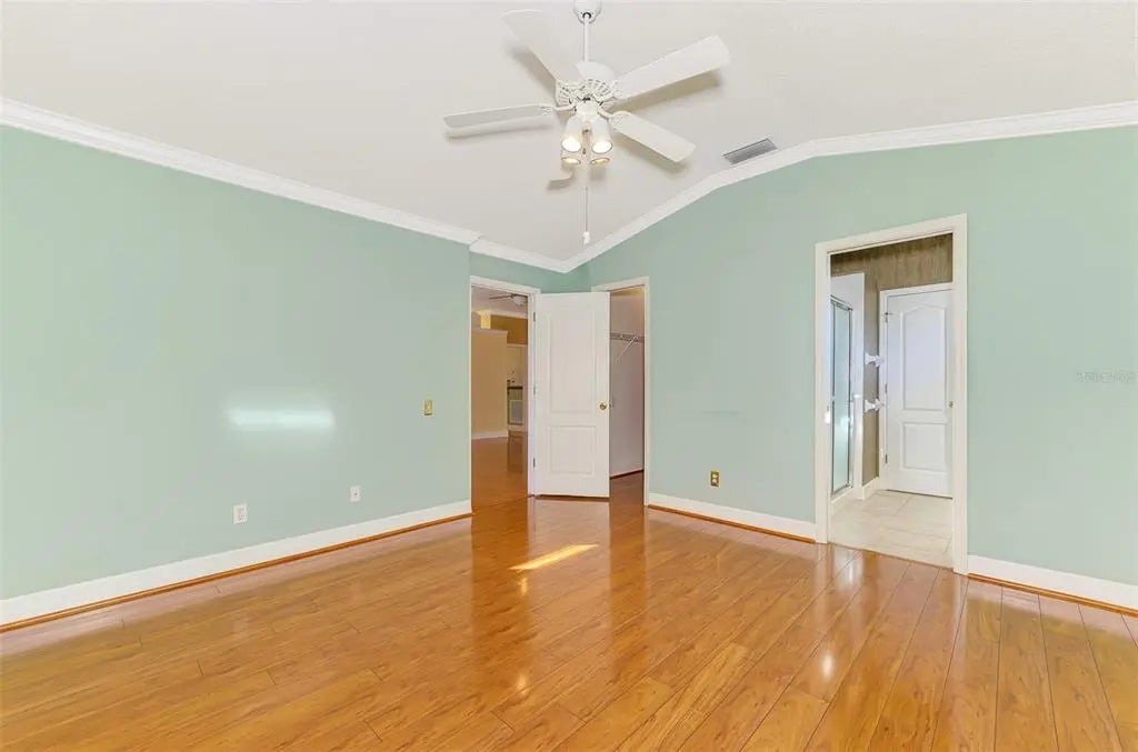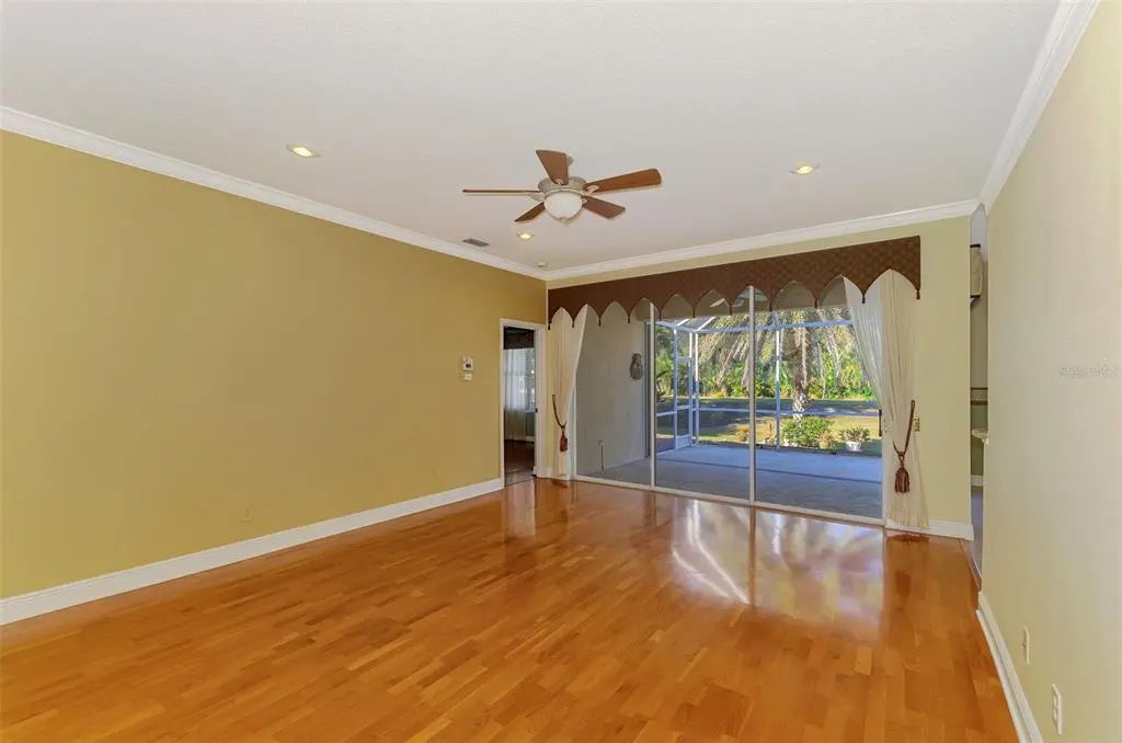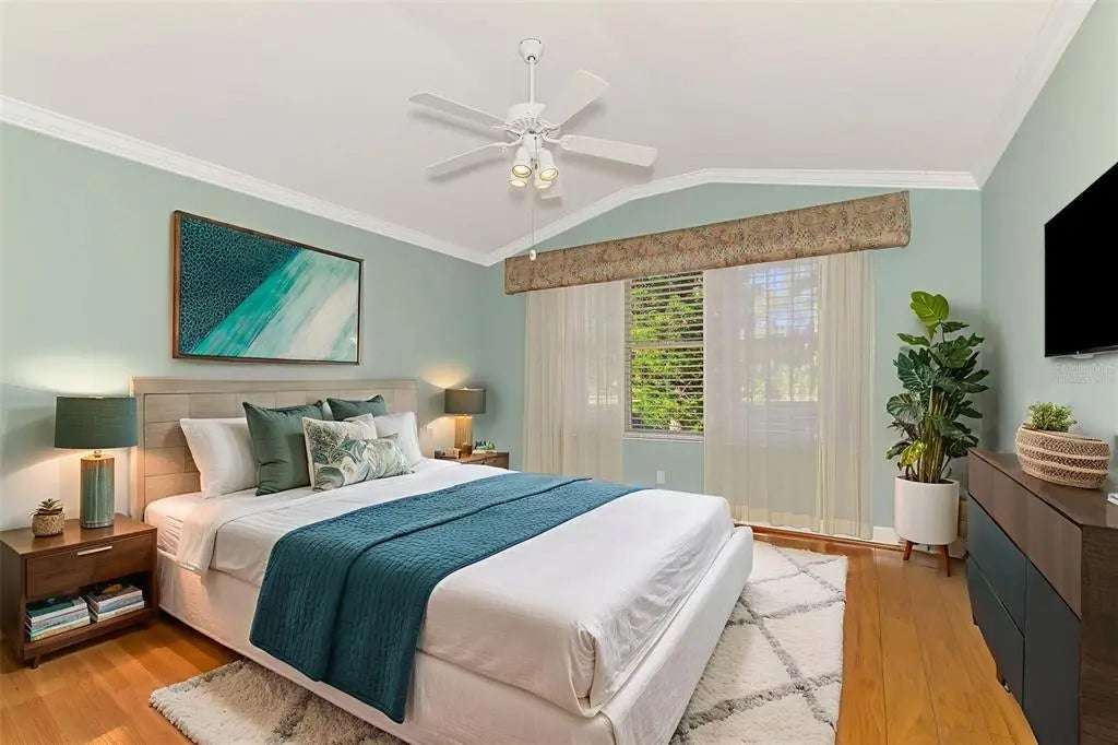 - Interior FeaturesCeiling Fan(s), Crown Molding, Eating Space In Kitchen, Living Room/Dining Room Combo, Open Floorplan, Primary Bedroom Main Floor, Solid Wood Cabinets, Split Bedroom, Stone Counters, Thermostat, Window Treatments