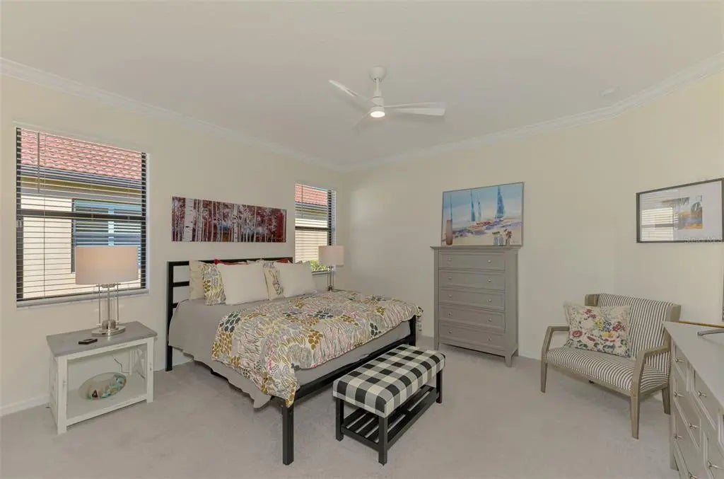 - Interior FeaturesCeiling Fan(s), Crown Molding, Dry Bar, Eating Space In Kitchen, High Ceilings, In Wall Pest System, Kitchen/Family Room Combo, Living Room/Dining Room Combo, Open Floorplan, Solid Surface Counters, Solid Wood Cabinets, Stone Counters, Thermostat, Walk-In Closet(s), Window Treatments